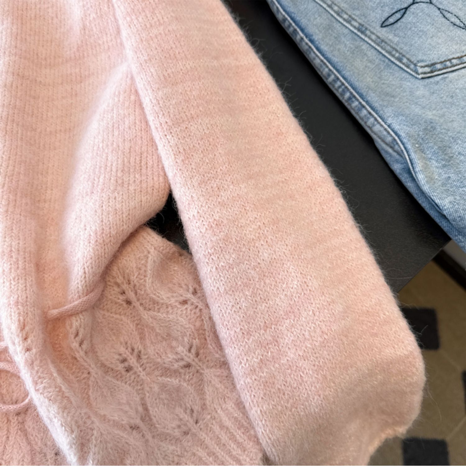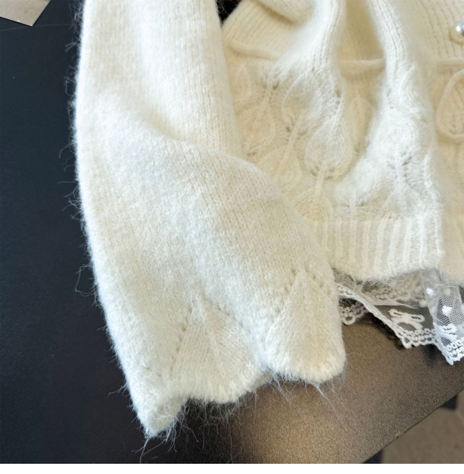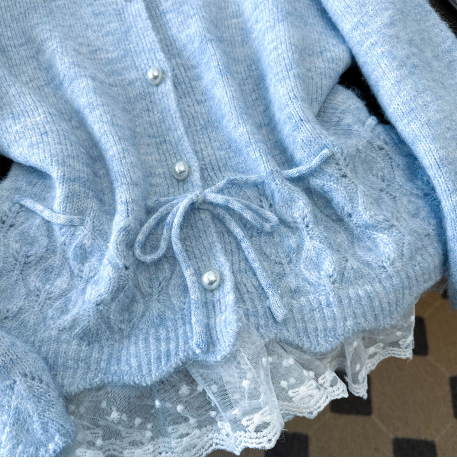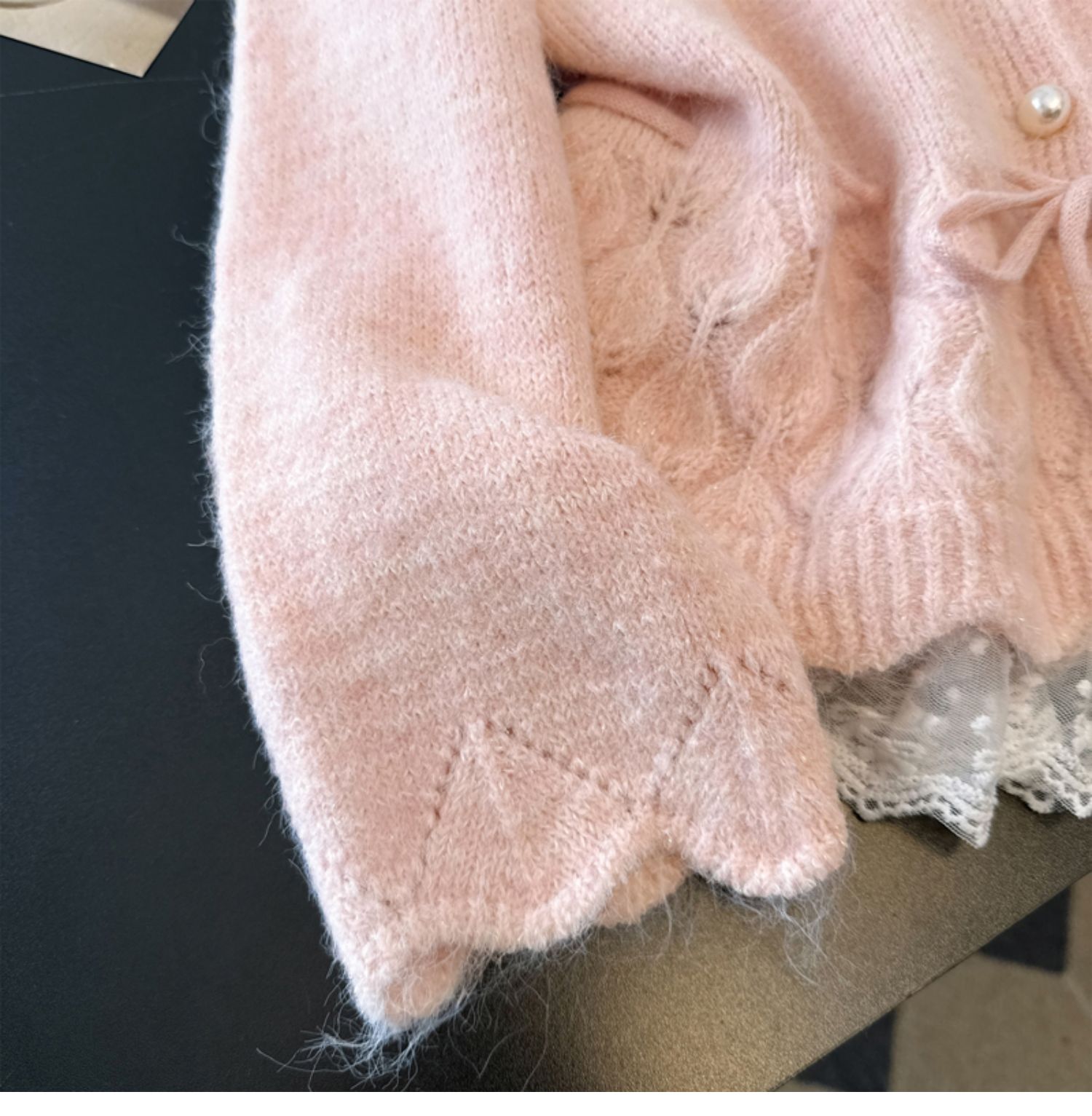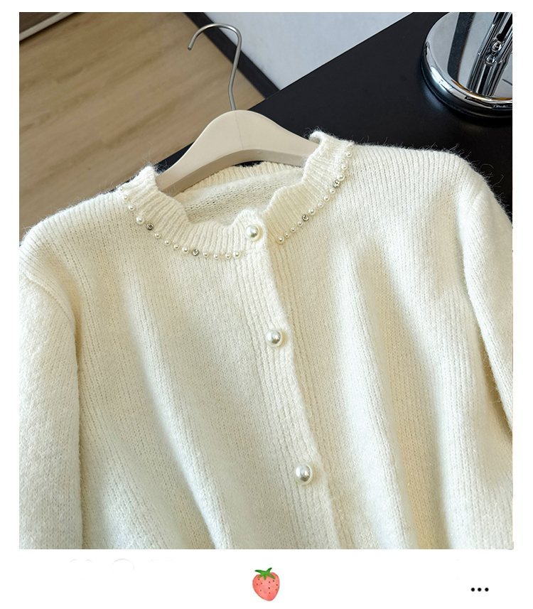 法式釘珠巨好看針織開衫毛衣女秋冬大碼胖mm系帶收腰蕾絲拼接上衣