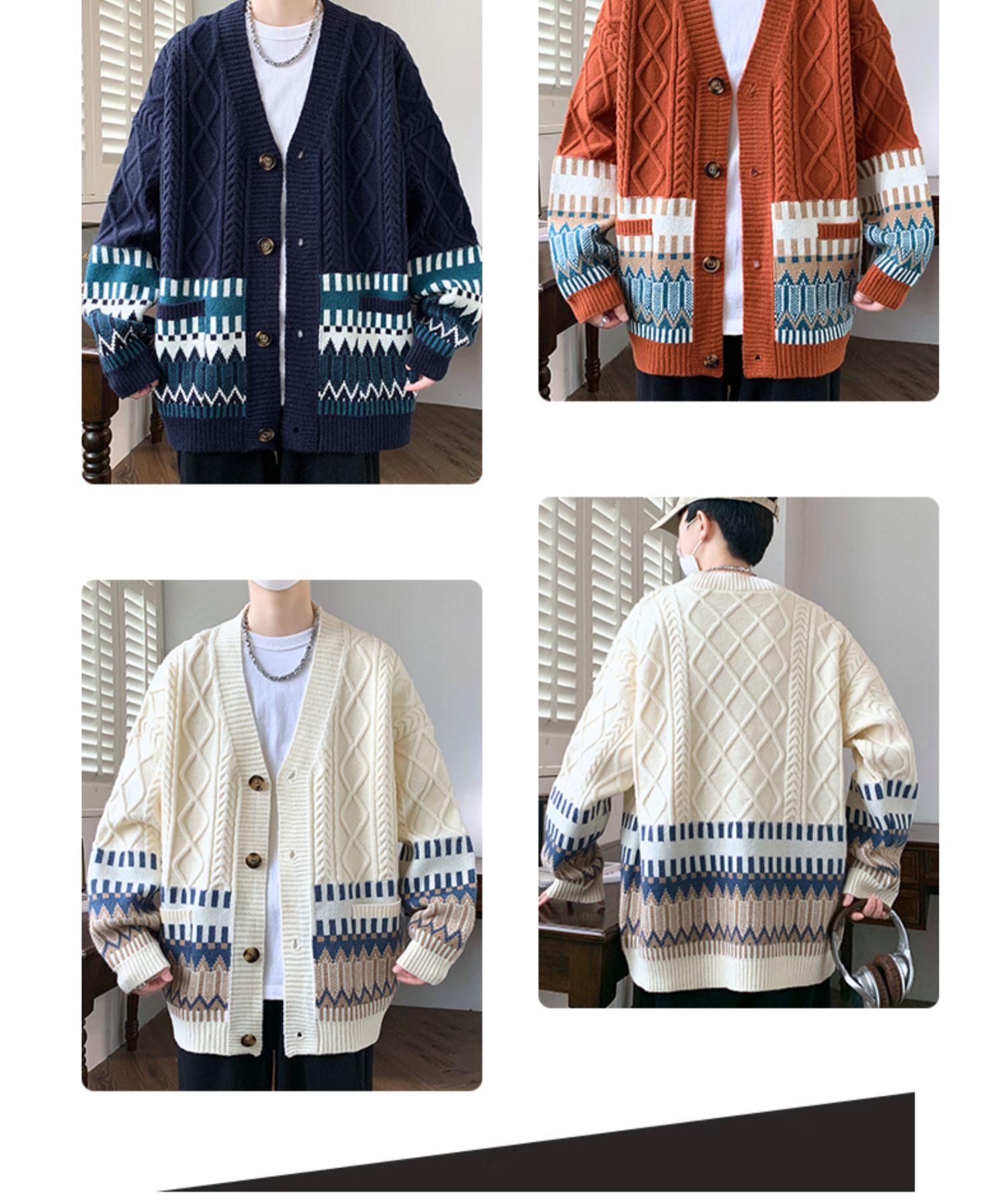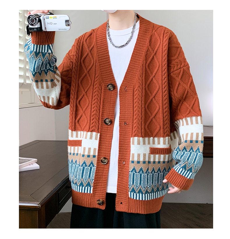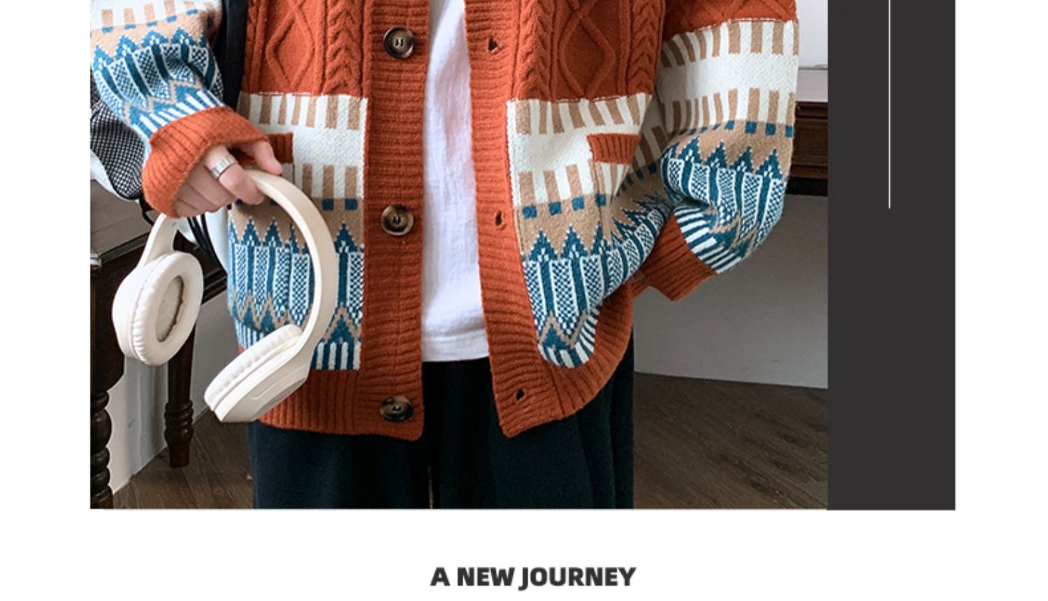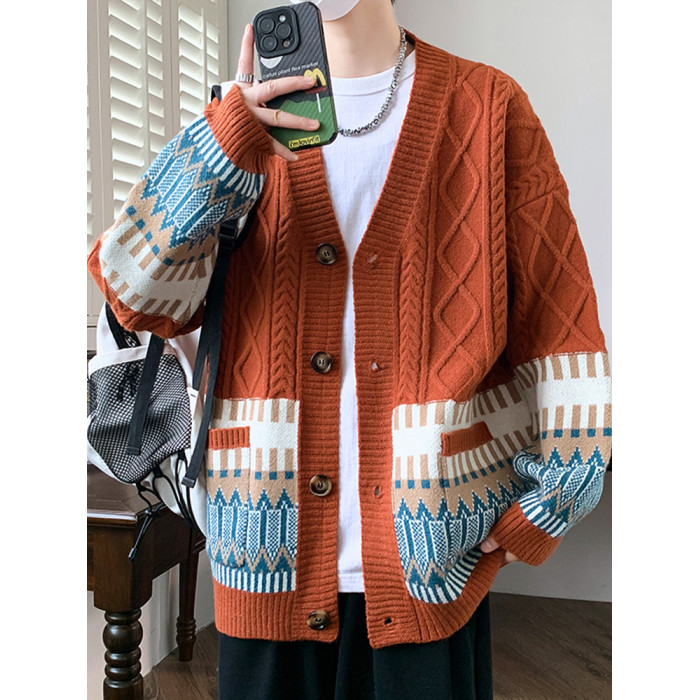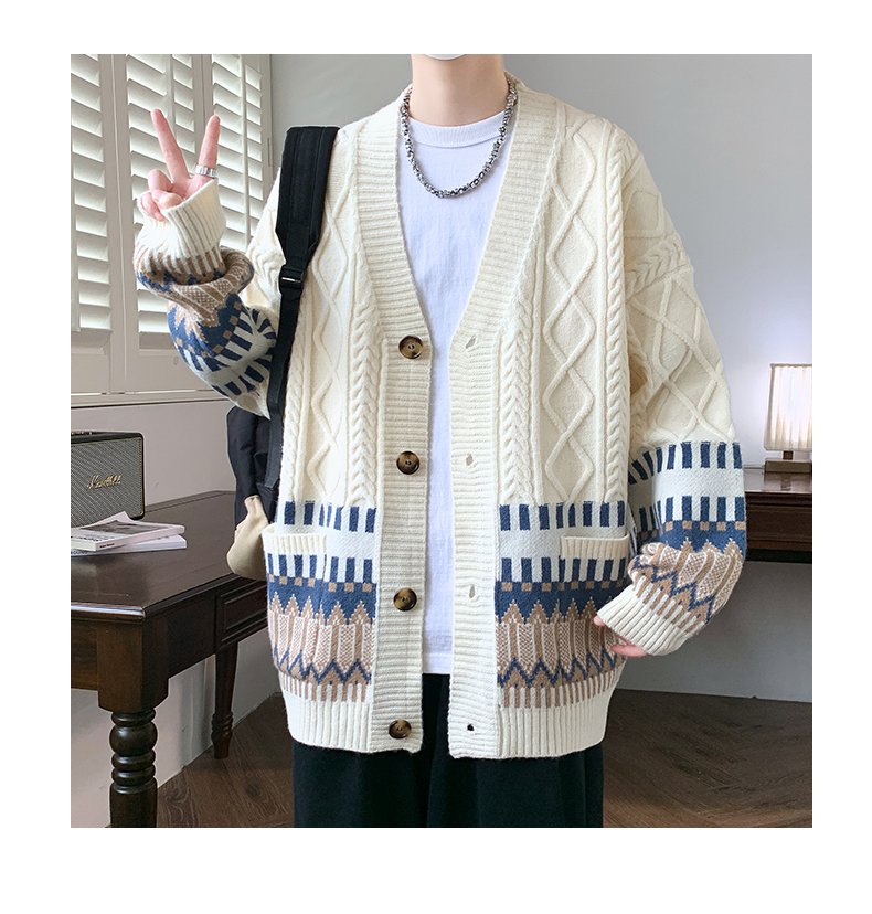 V領開衫毛衣外套男秋冬季美式寬松民族提花毛線衣情侶男士針織衫