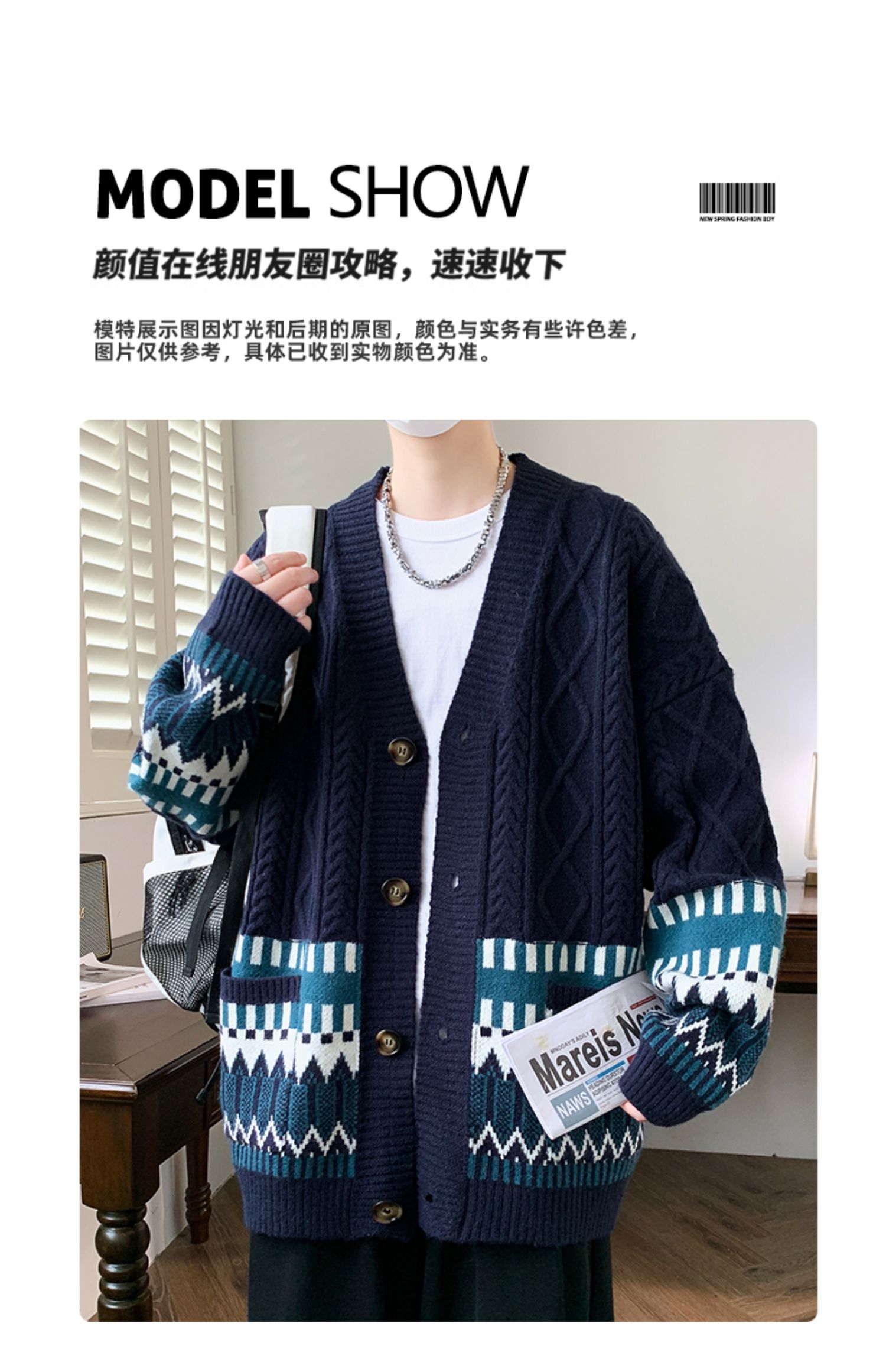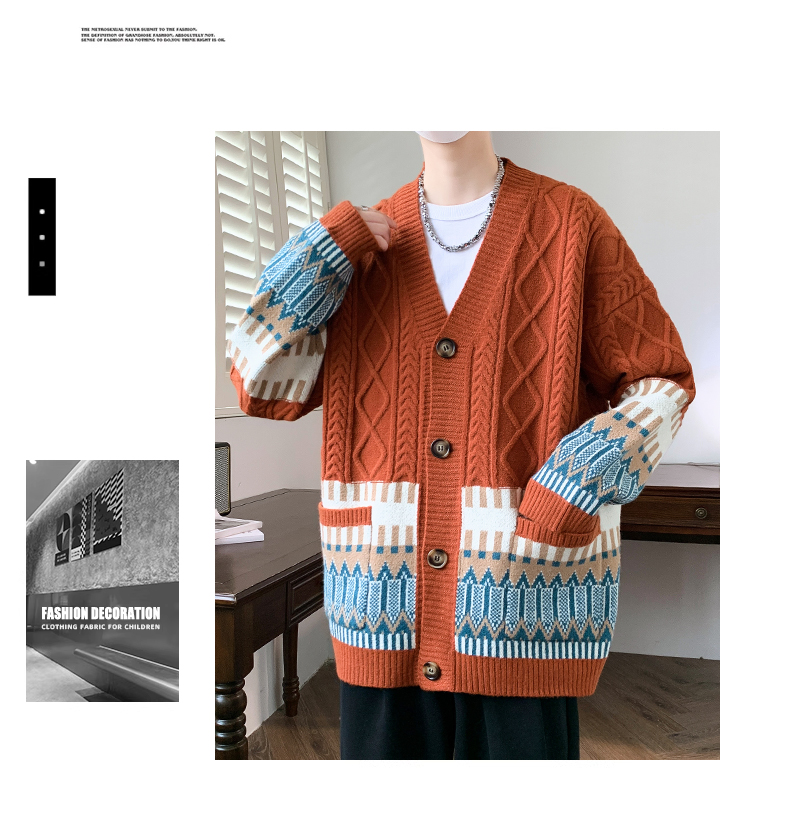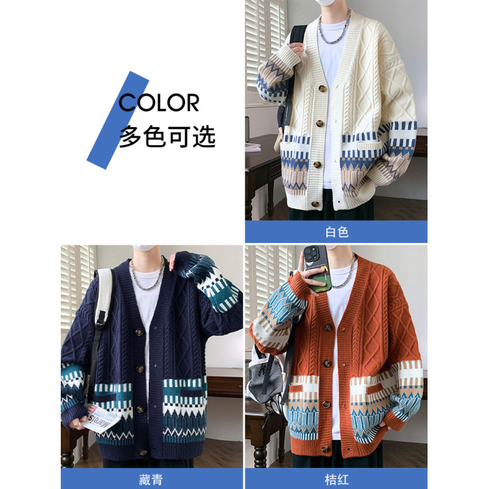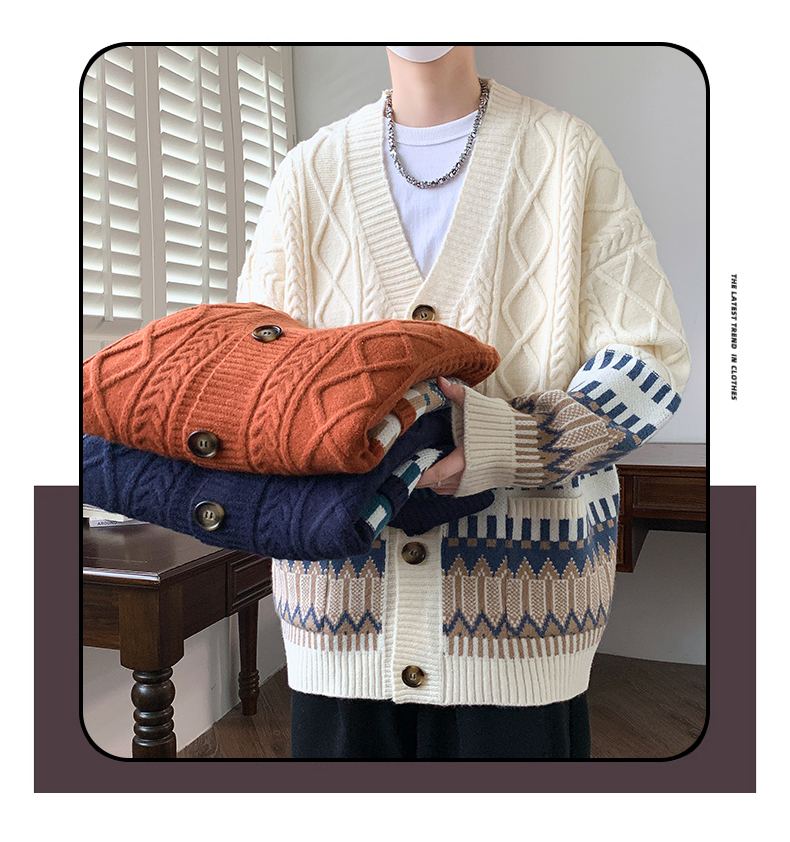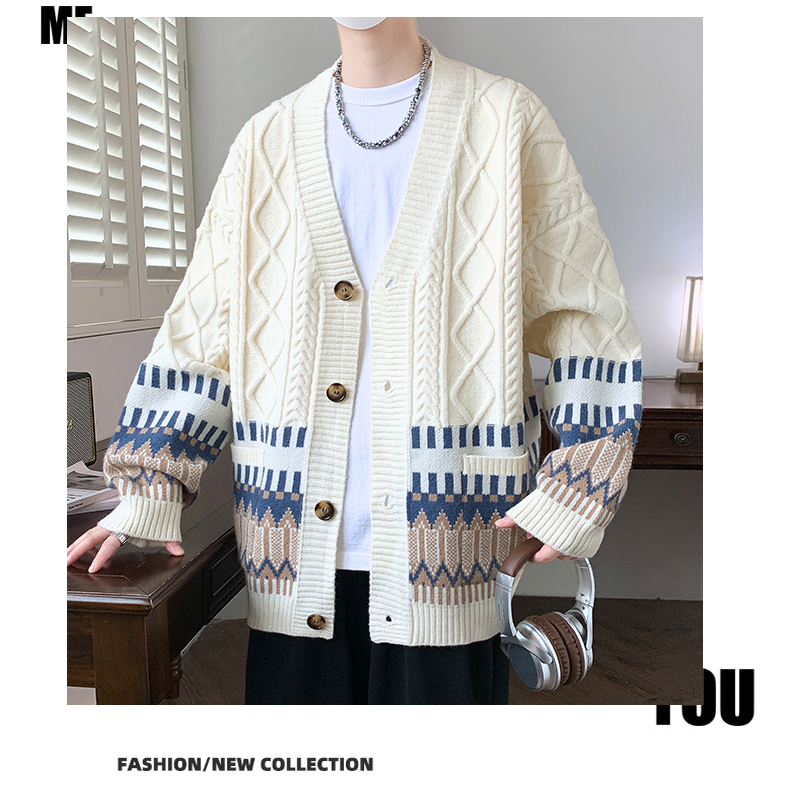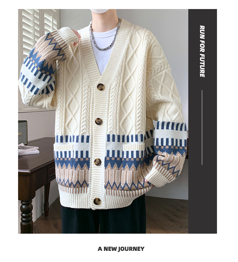 V領開衫毛衣外套男秋冬季美式寬松民族提花毛線衣情侶男士針織衫