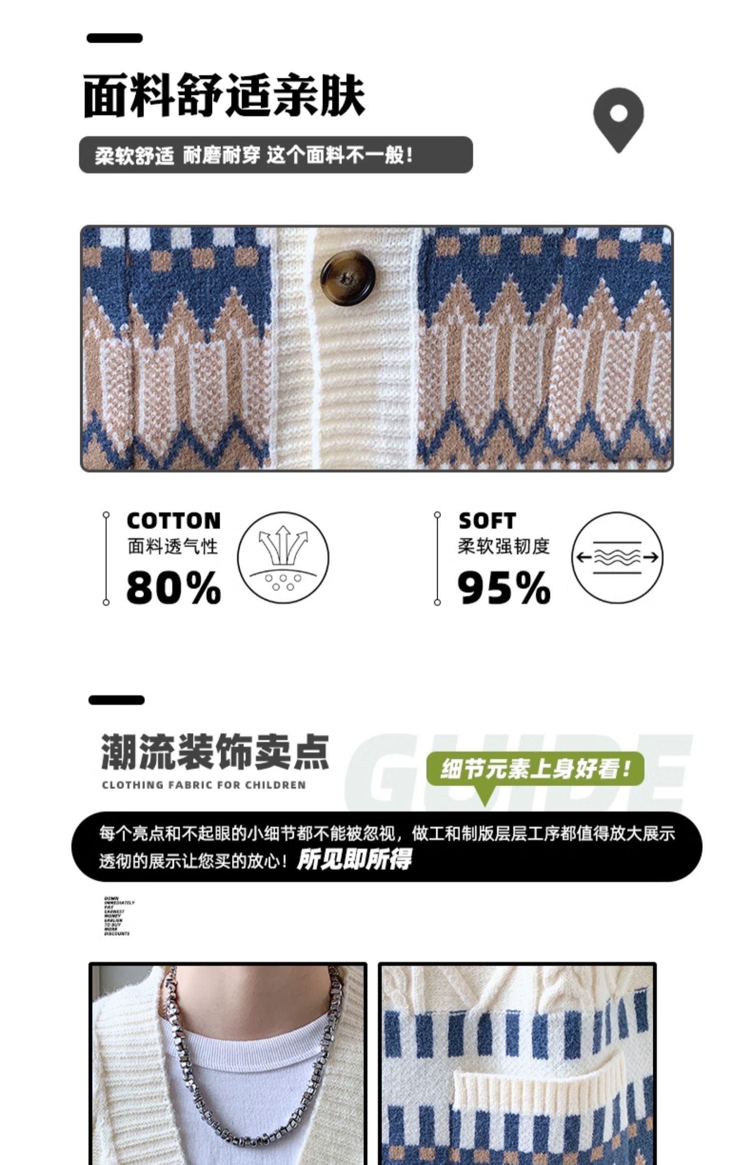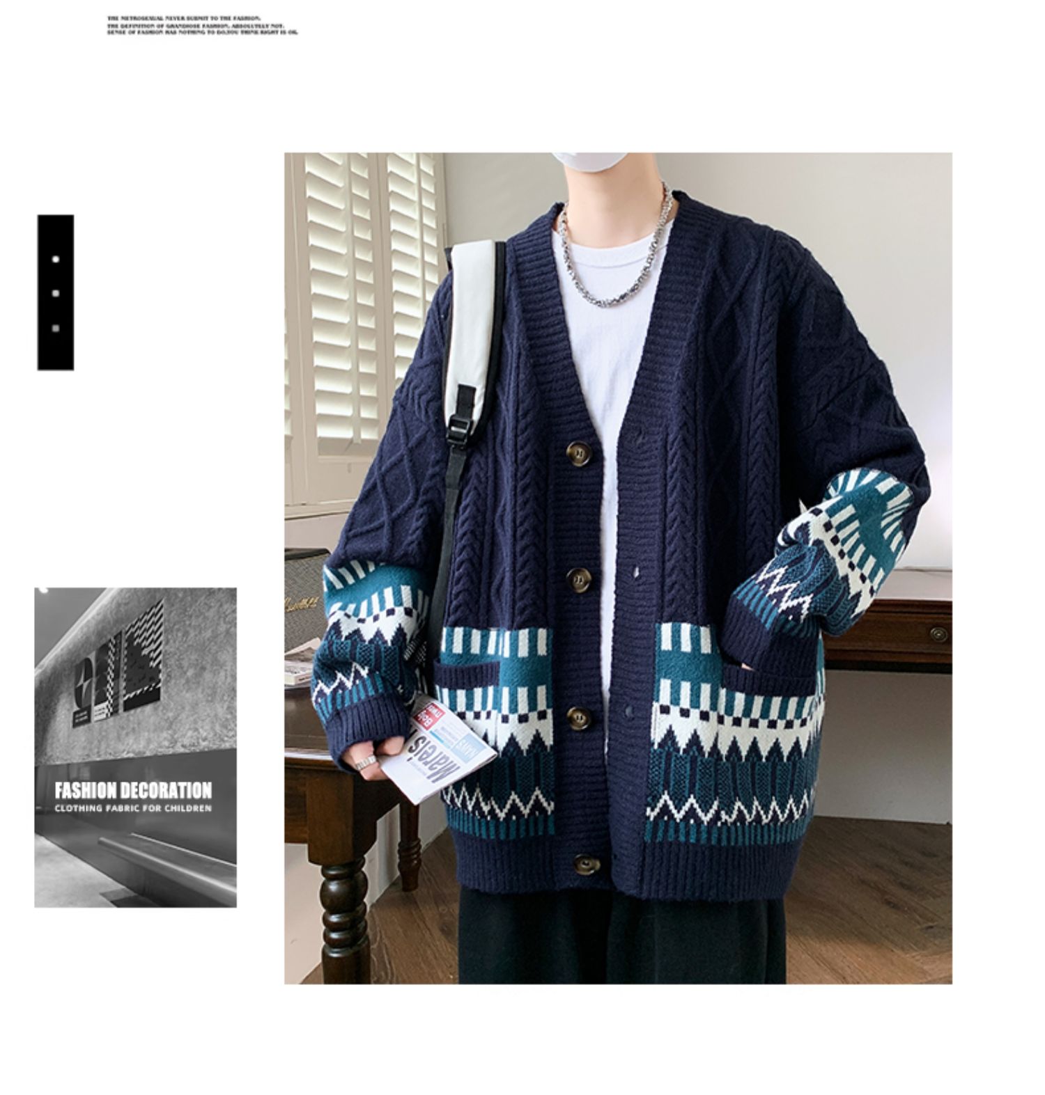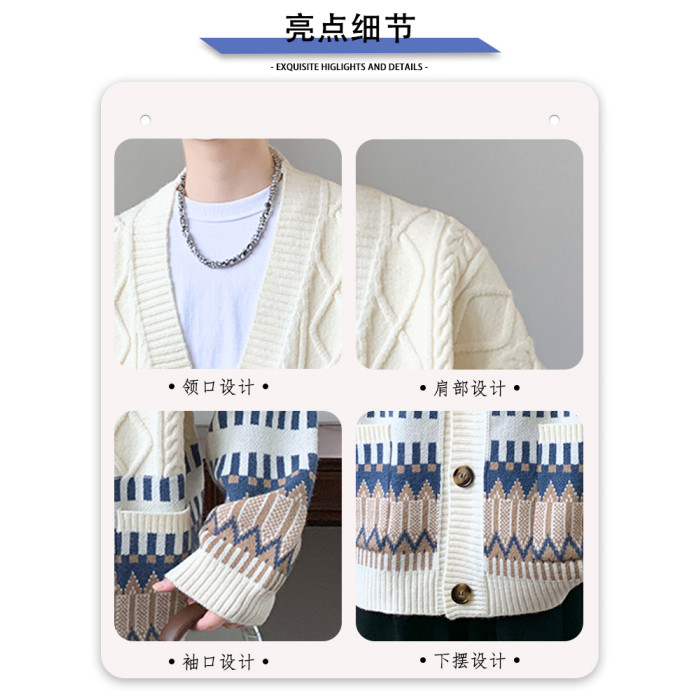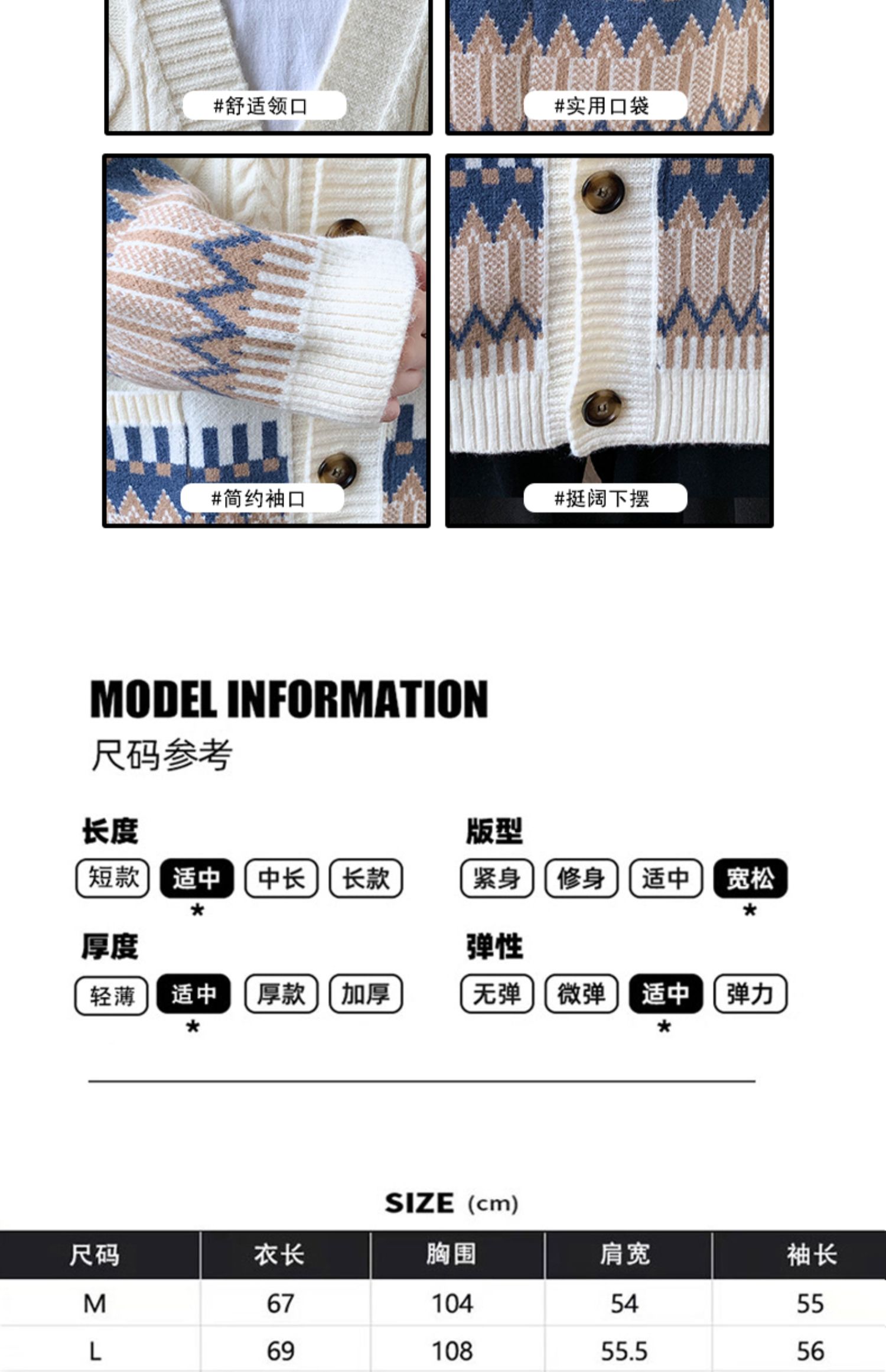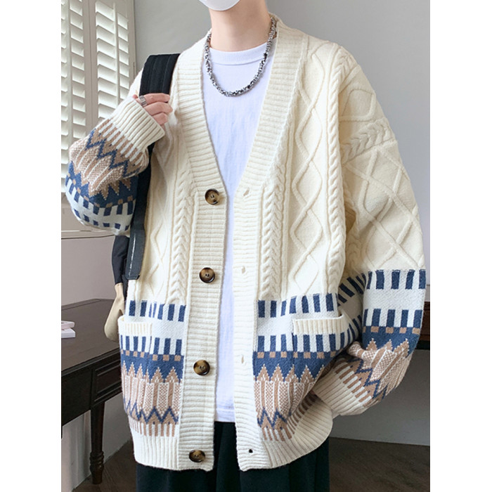 V領開衫毛衣外套男秋冬季美式寬松民族提花毛線衣情侶男士針織衫