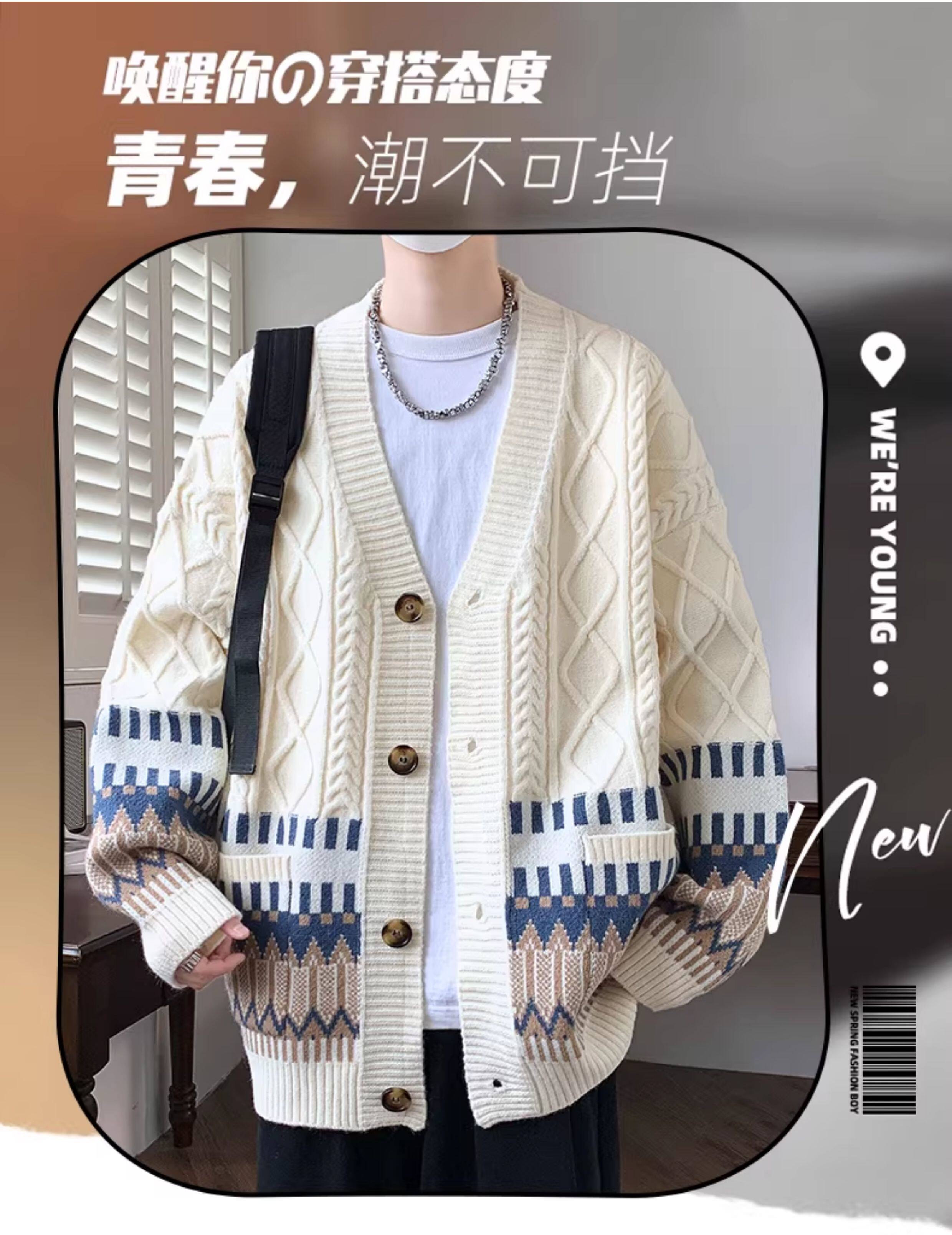 V領開衫毛衣外套男秋冬季美式寬鬆民族提花毛線衣情侶男士針織衫