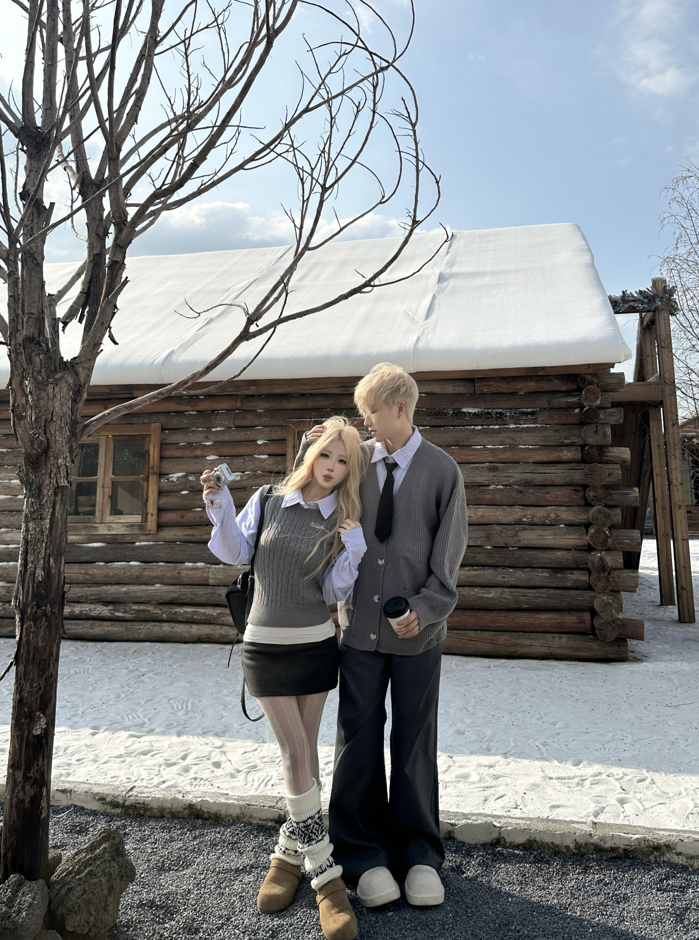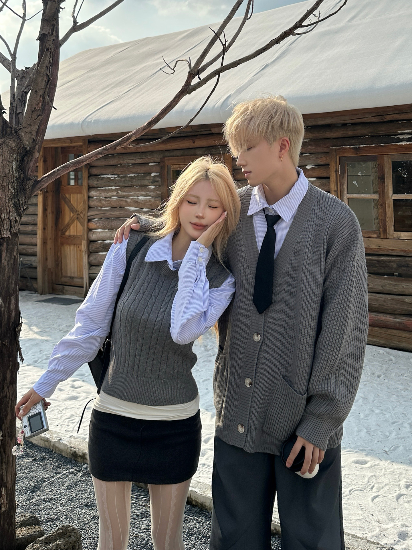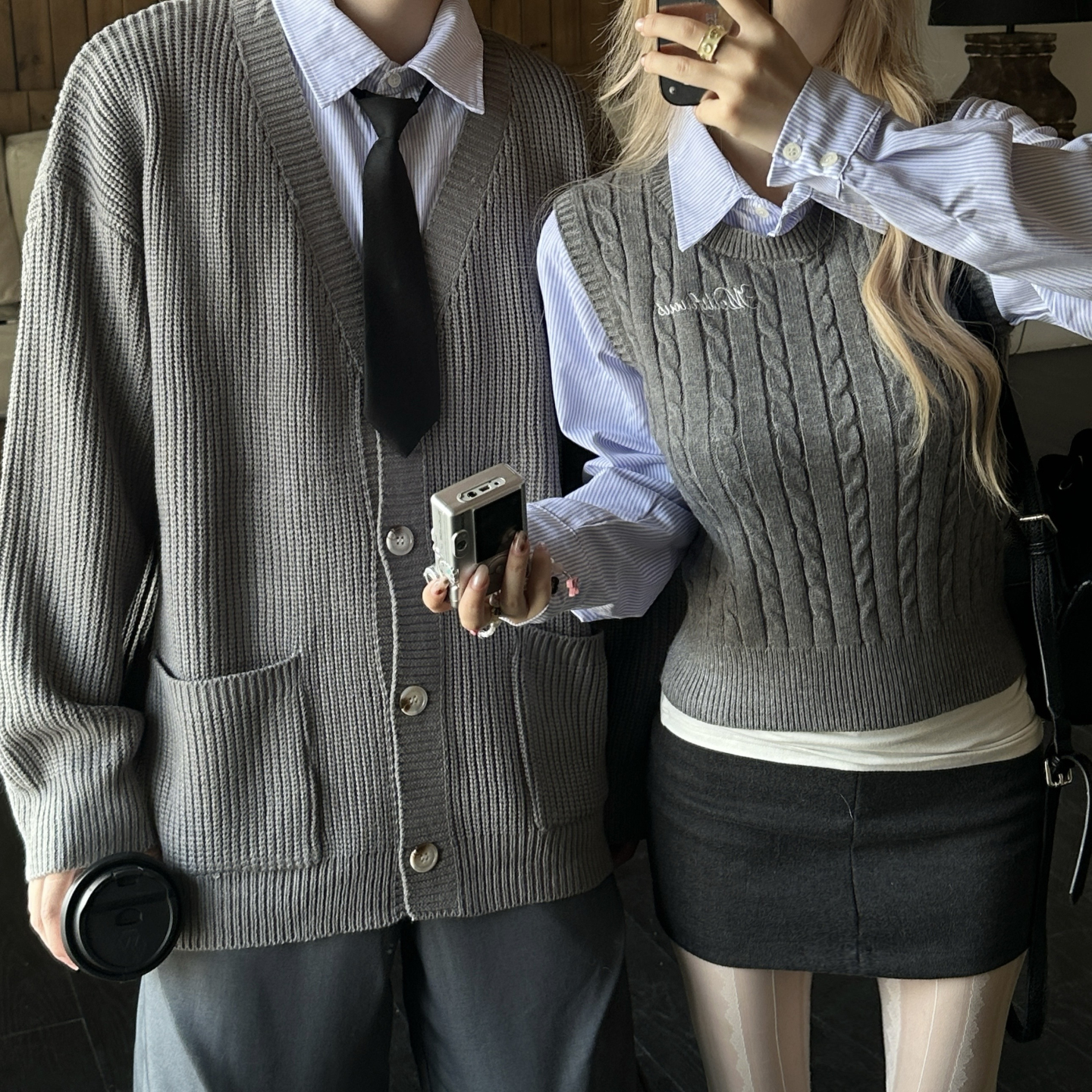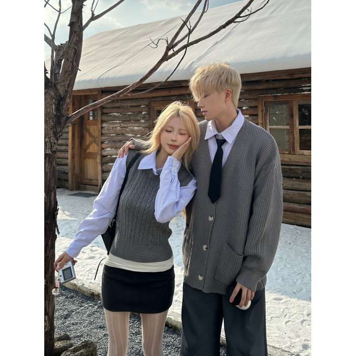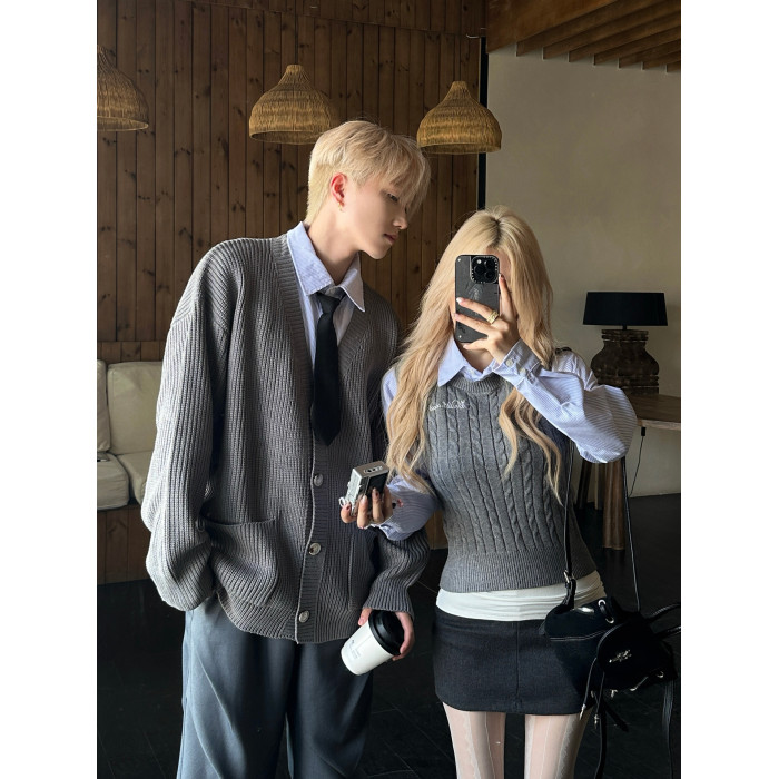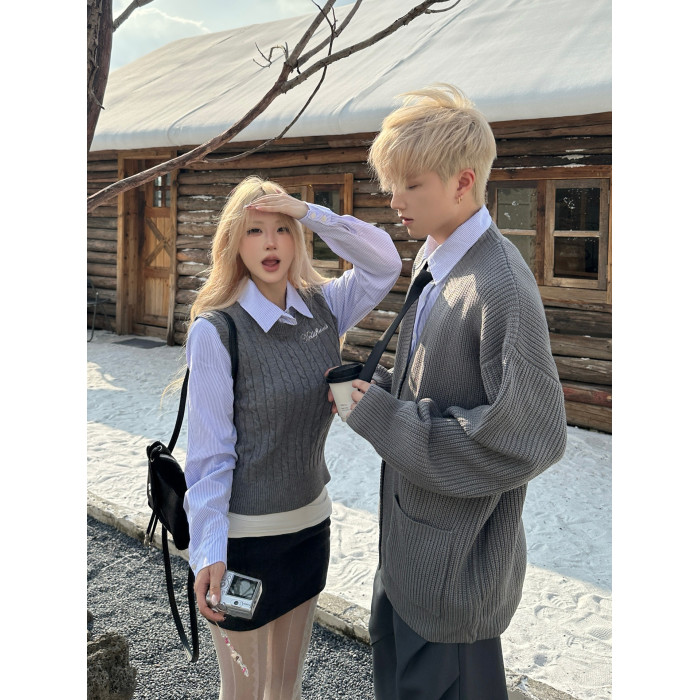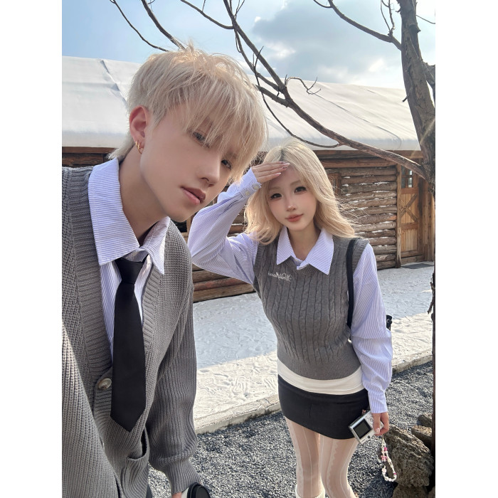 JK學院風假兩件毛衣男女情侶裝秋冬季韓系翻領顯瘦一長一短針織衫