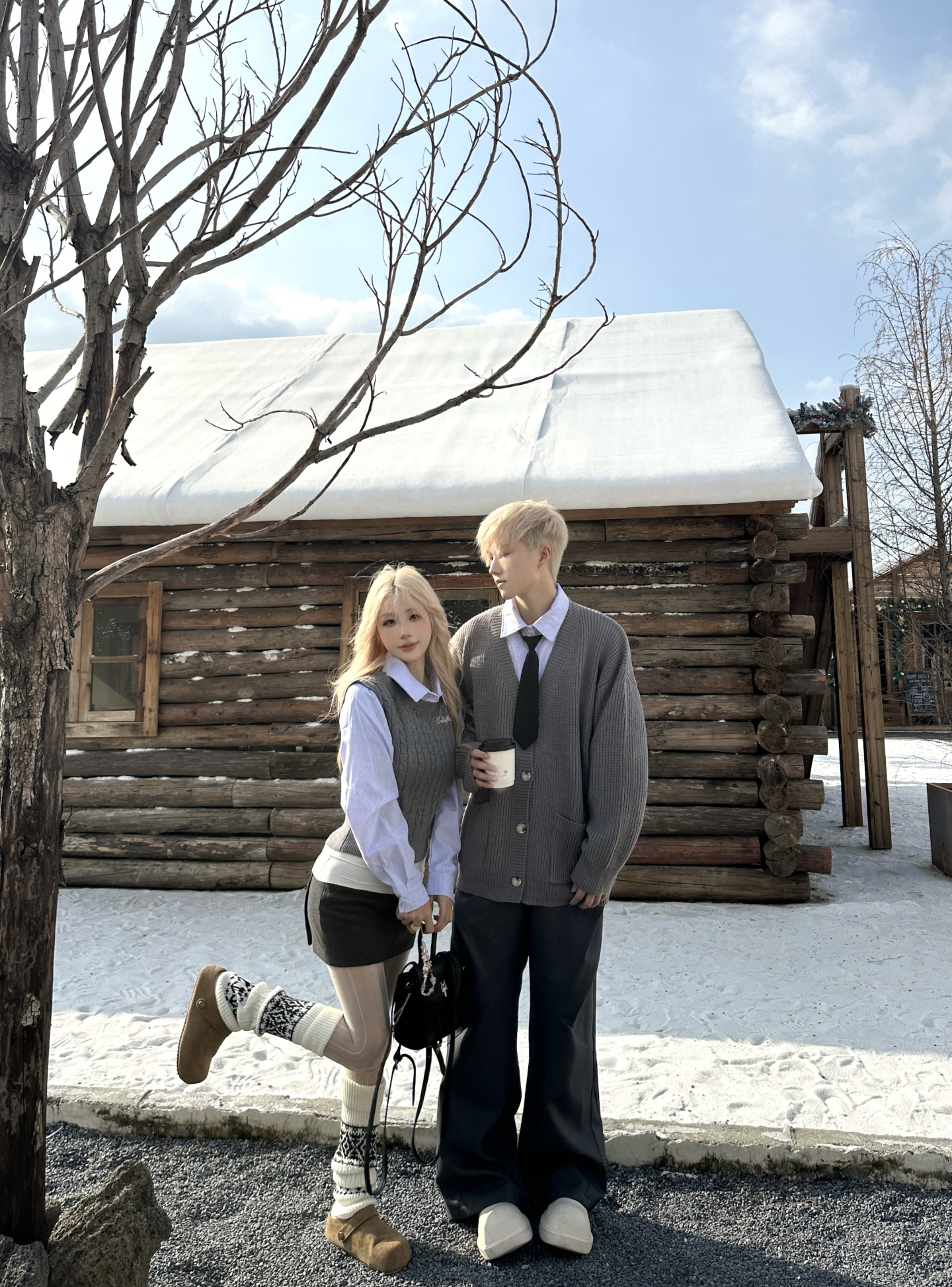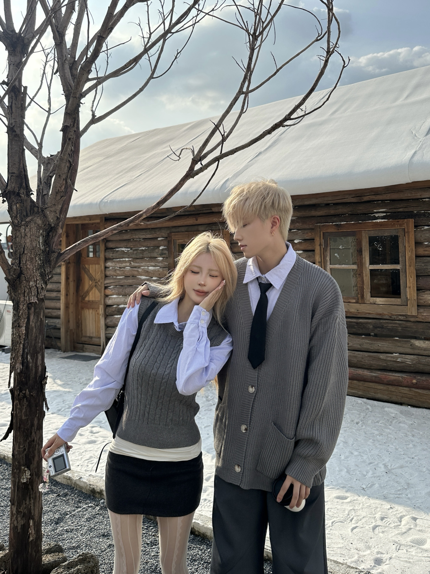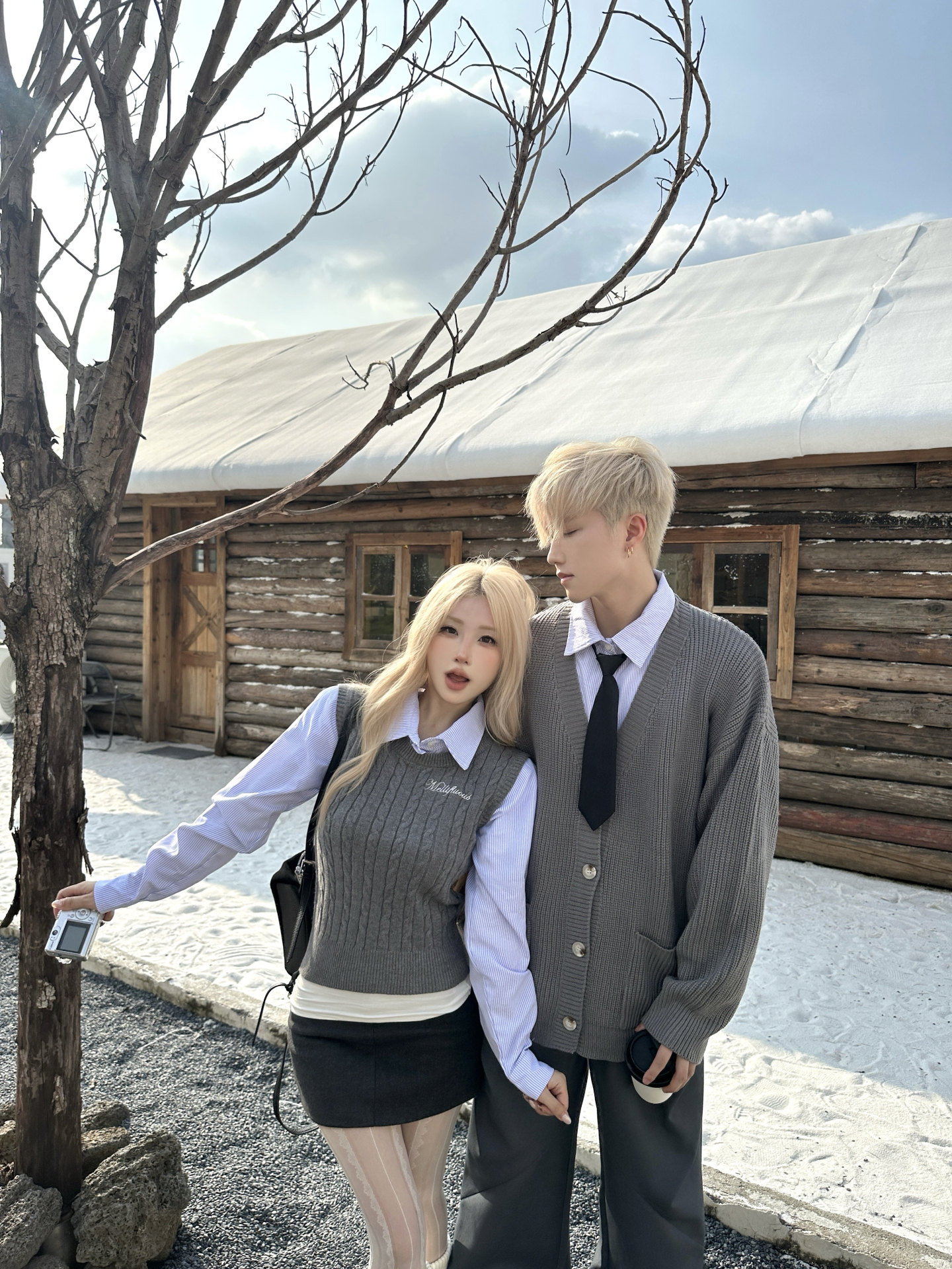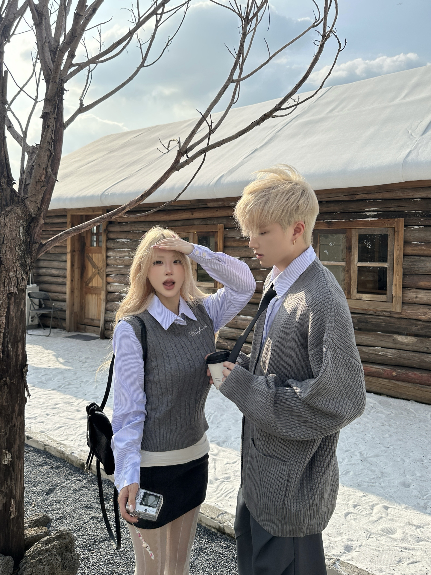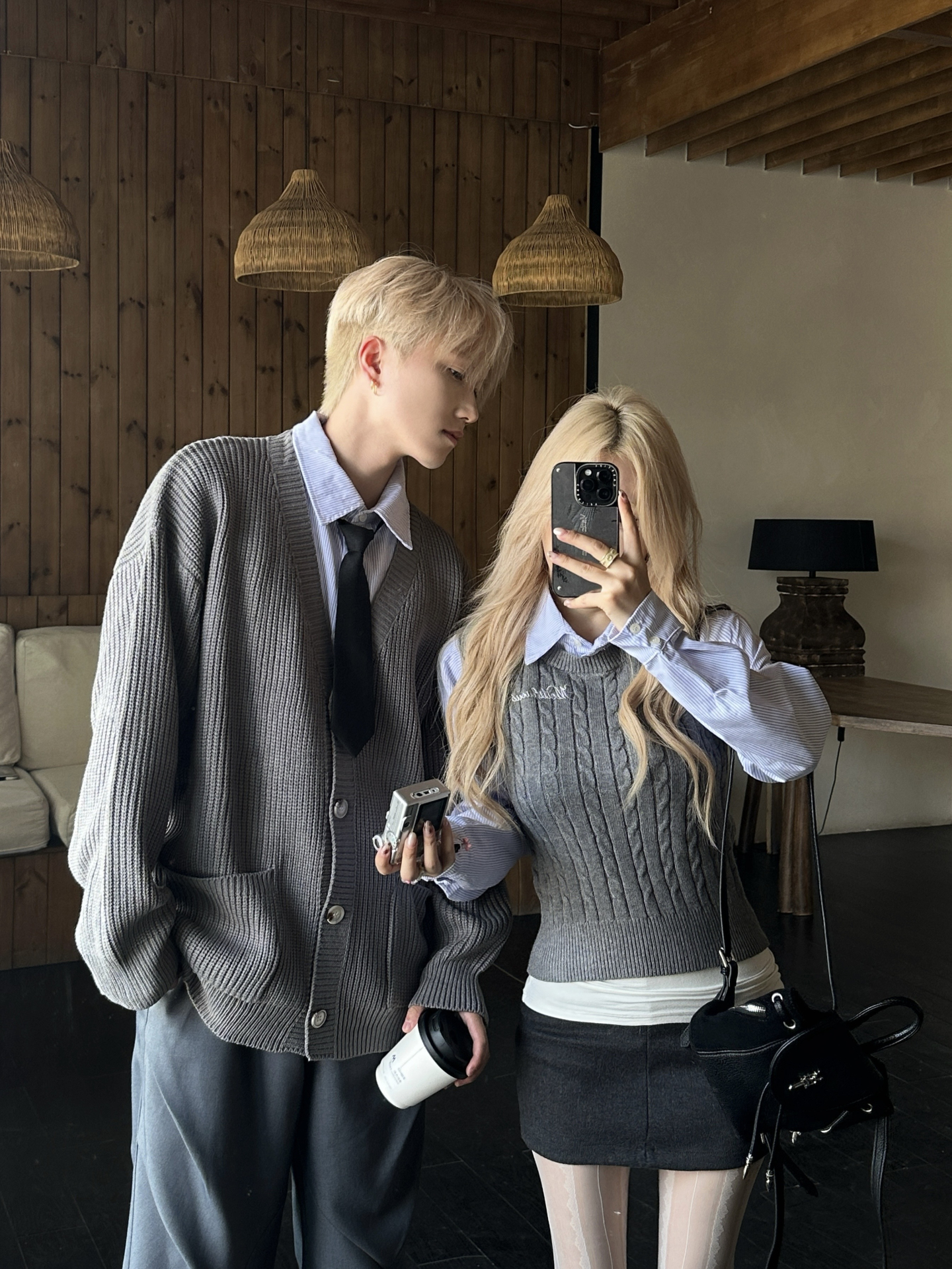 JK學院風假兩件毛衣男女情侶裝秋冬季韓系翻領顯瘦一長一短針織衫