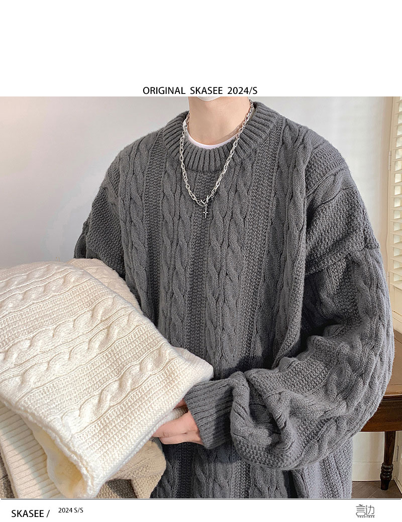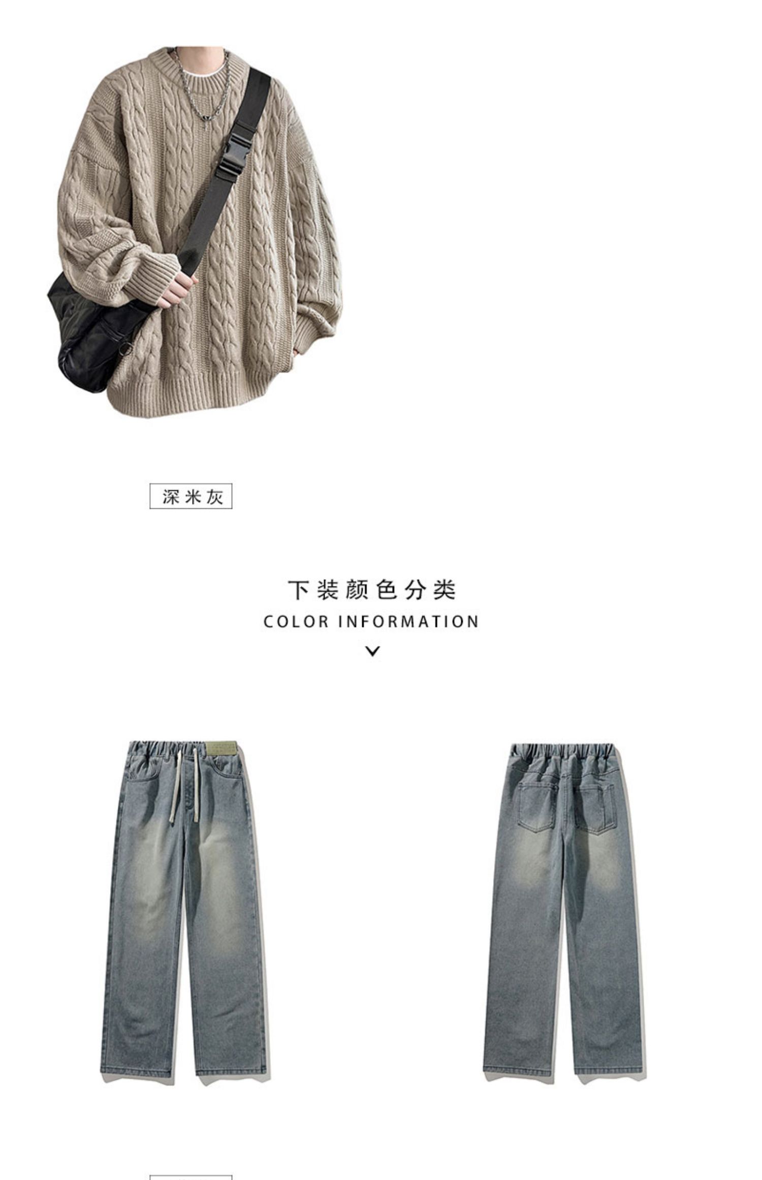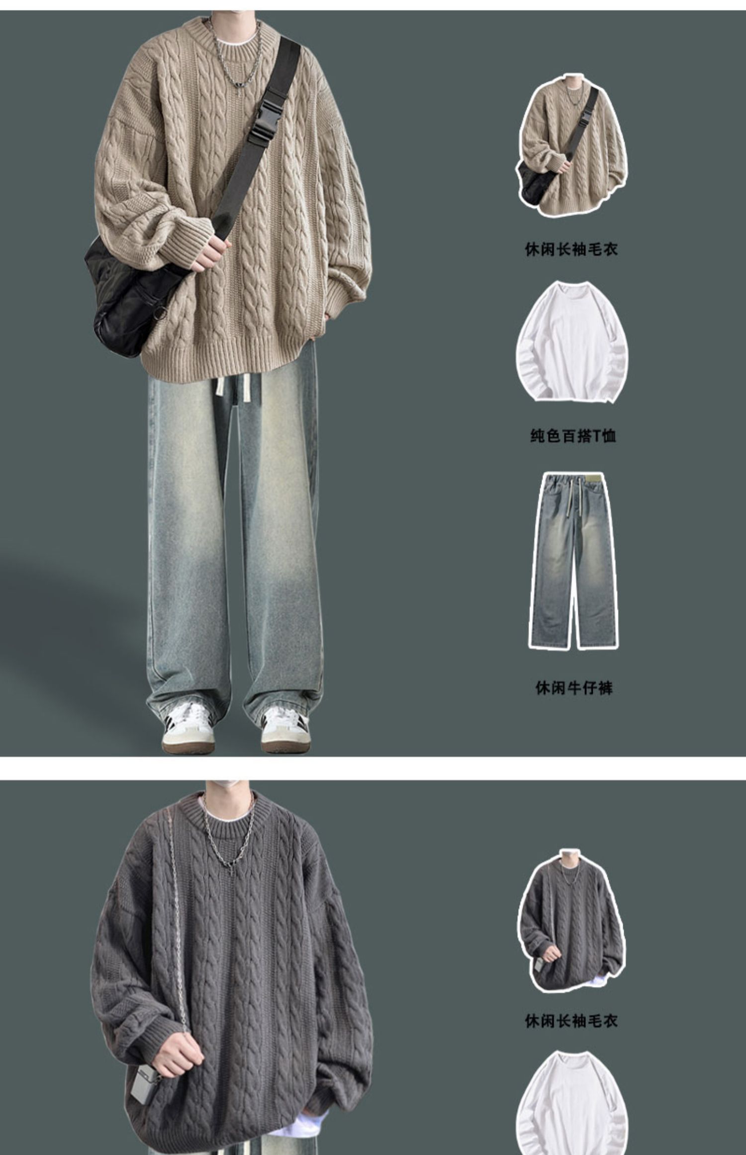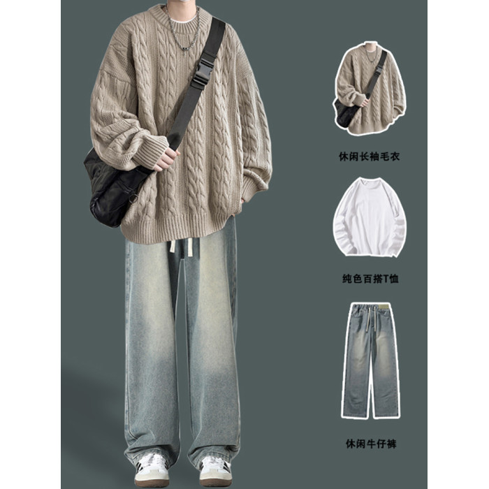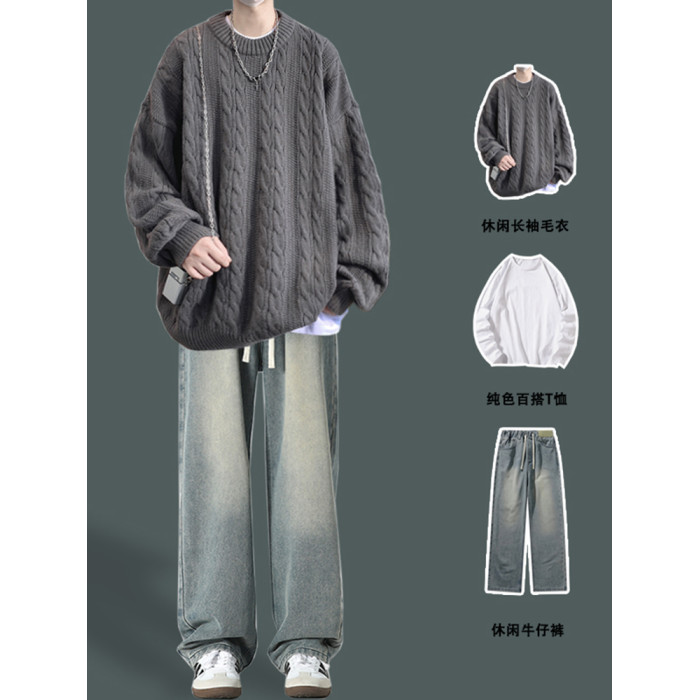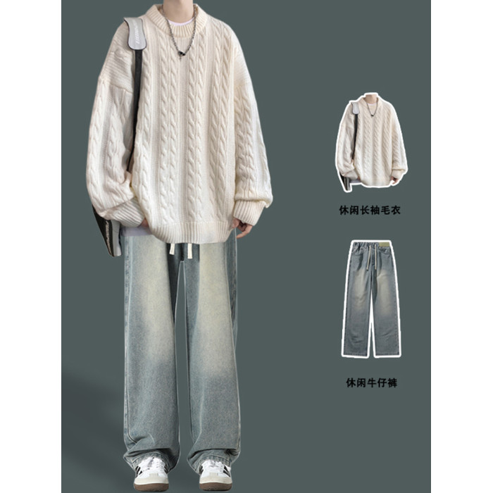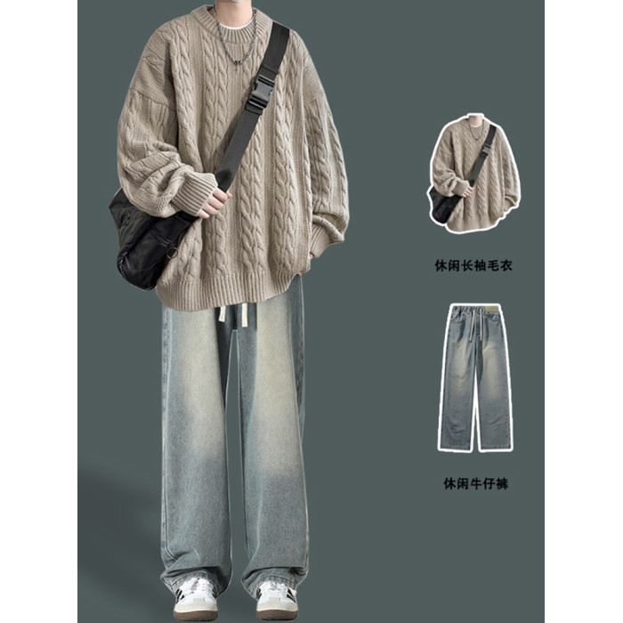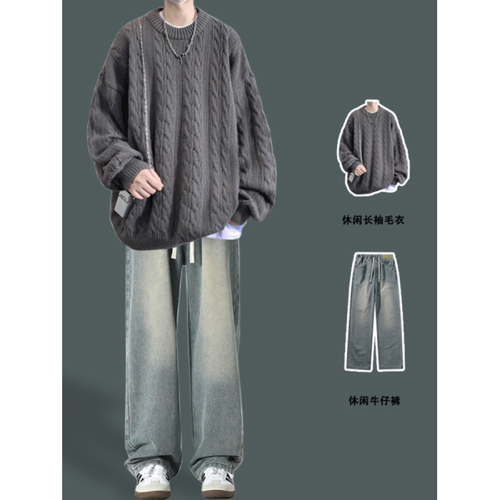 男士復古休閒圓領毛衣青少年潮牌針織衫男生酷帥穿搭學生秋冬套裝