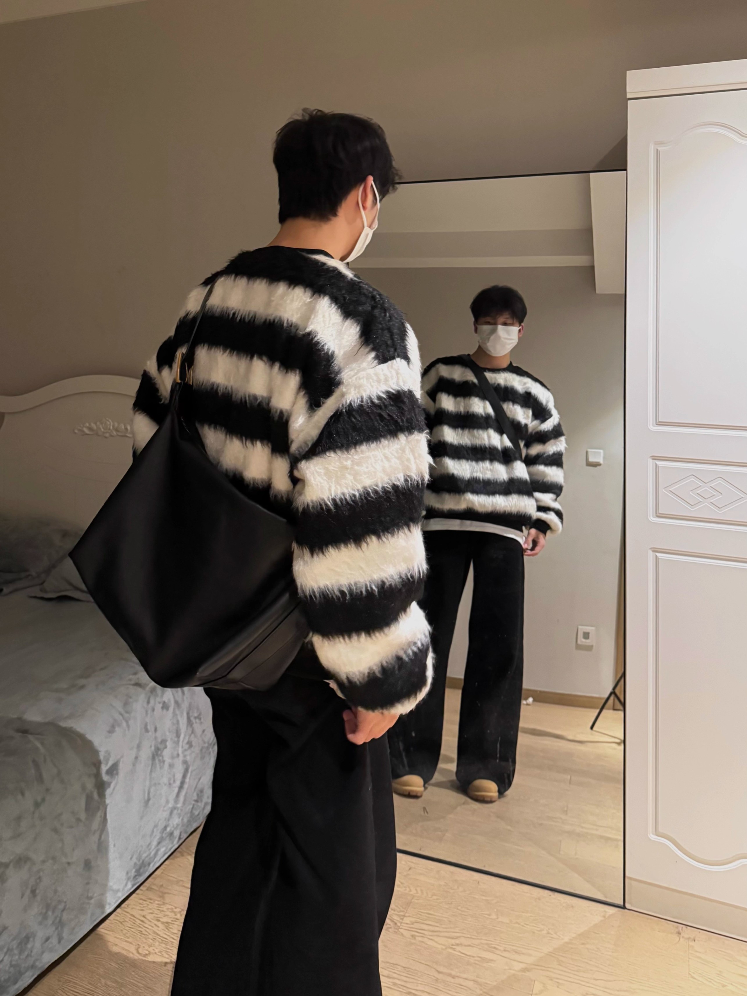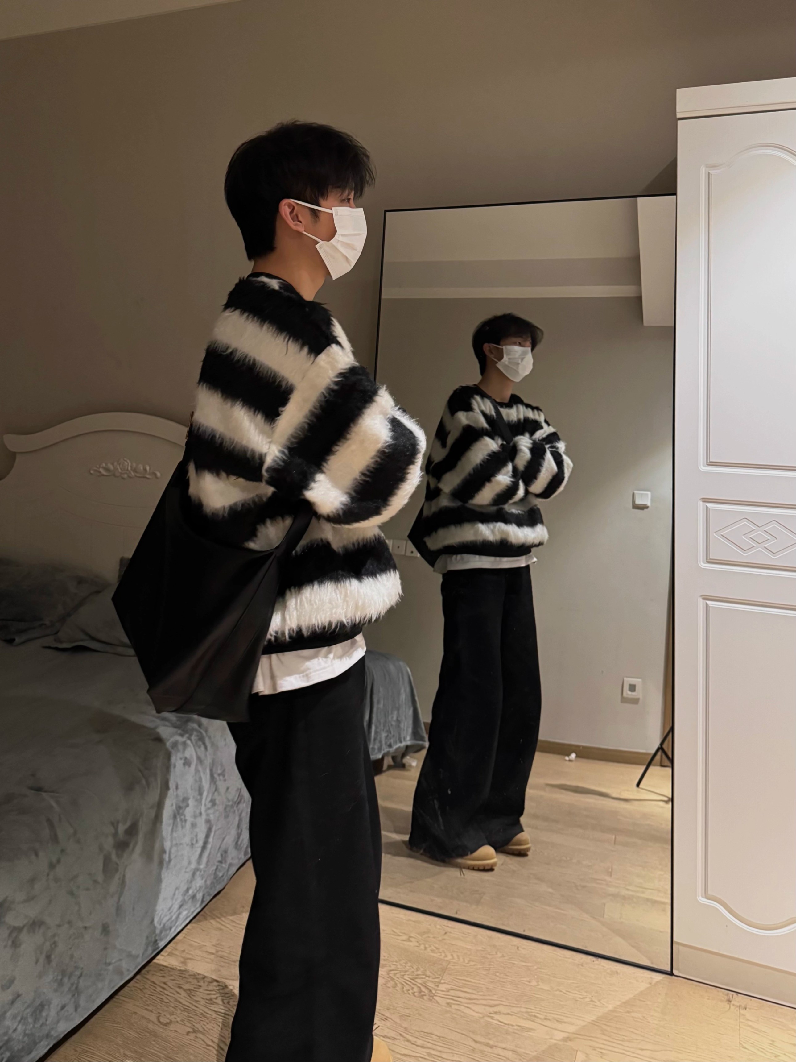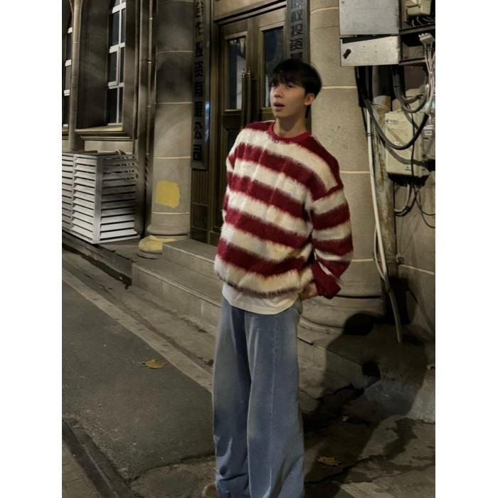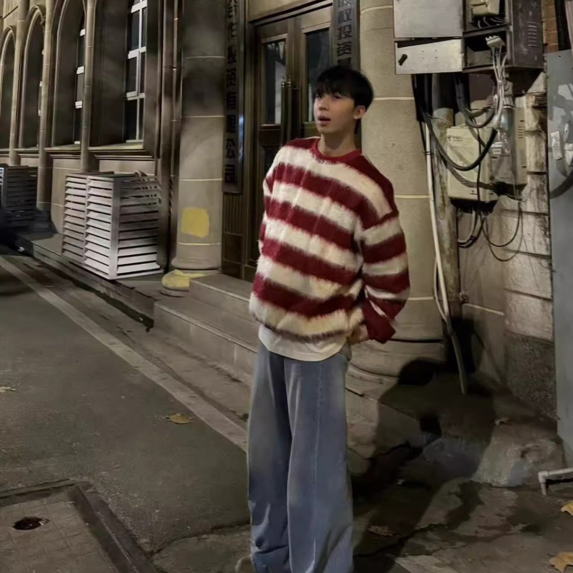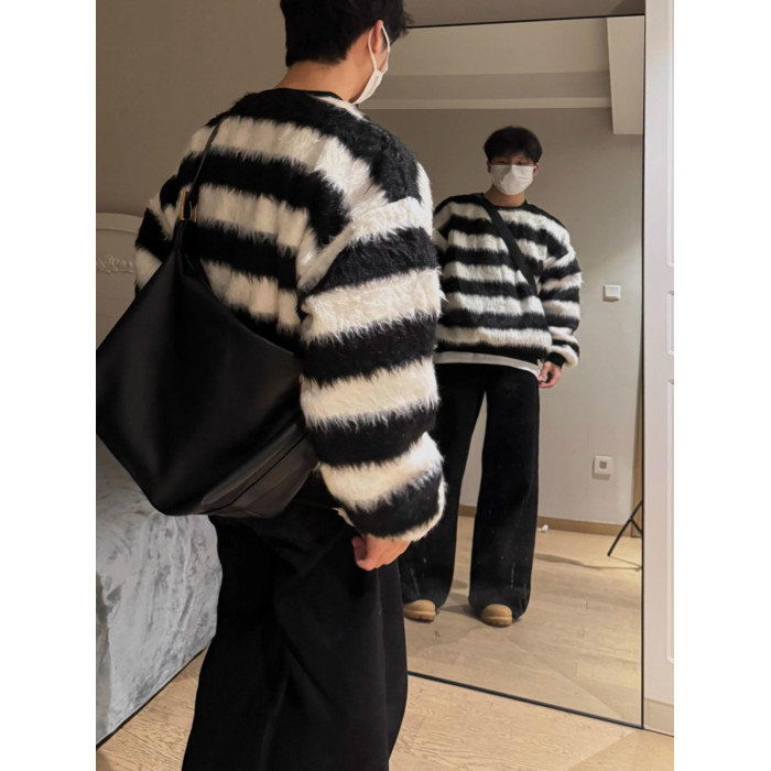 水貂絨條紋情侶毛衣男秋冬季韓版寬松針織衫oversize圓領軟糯上衣
