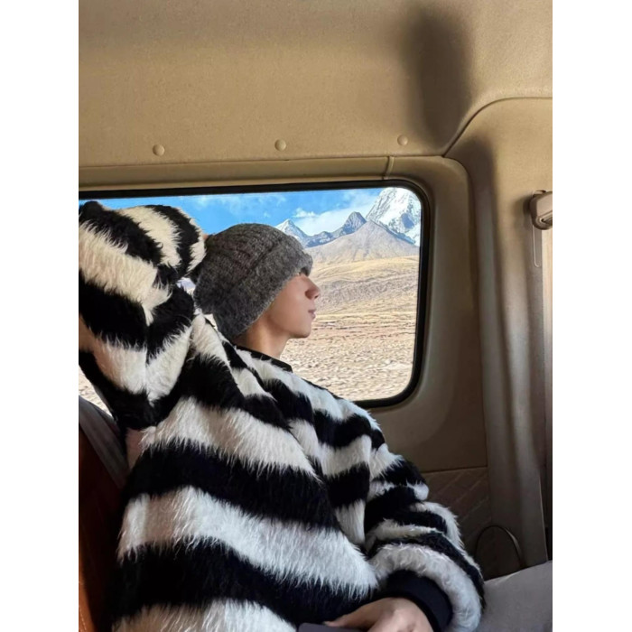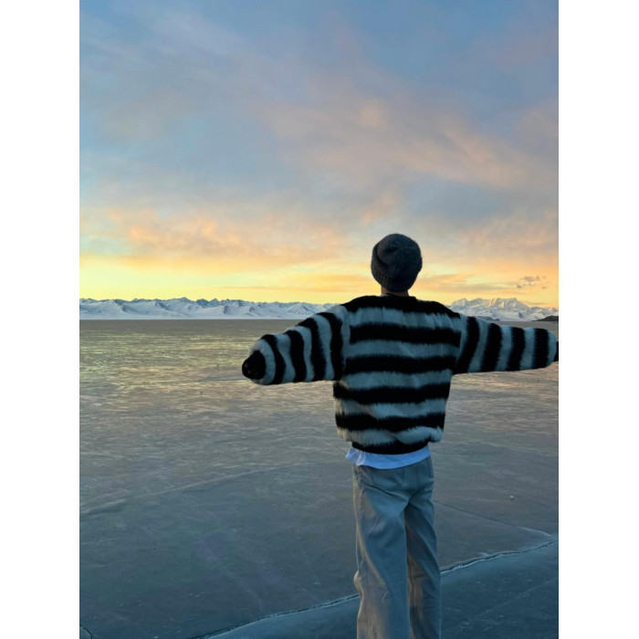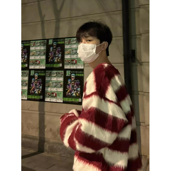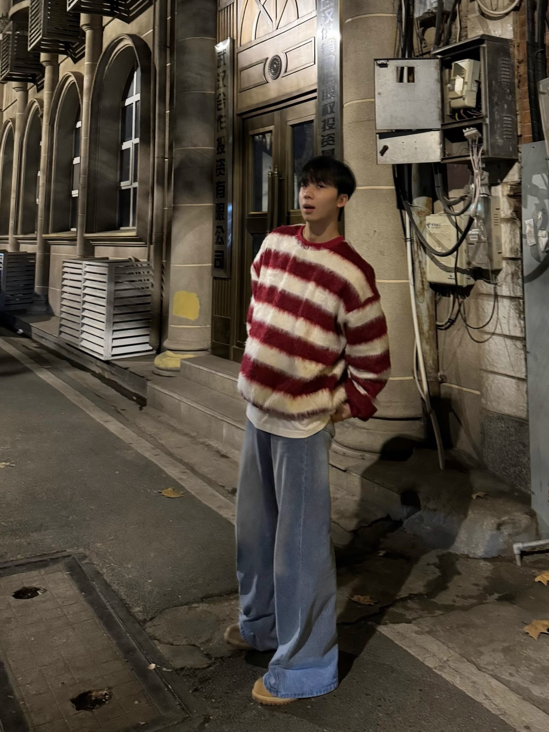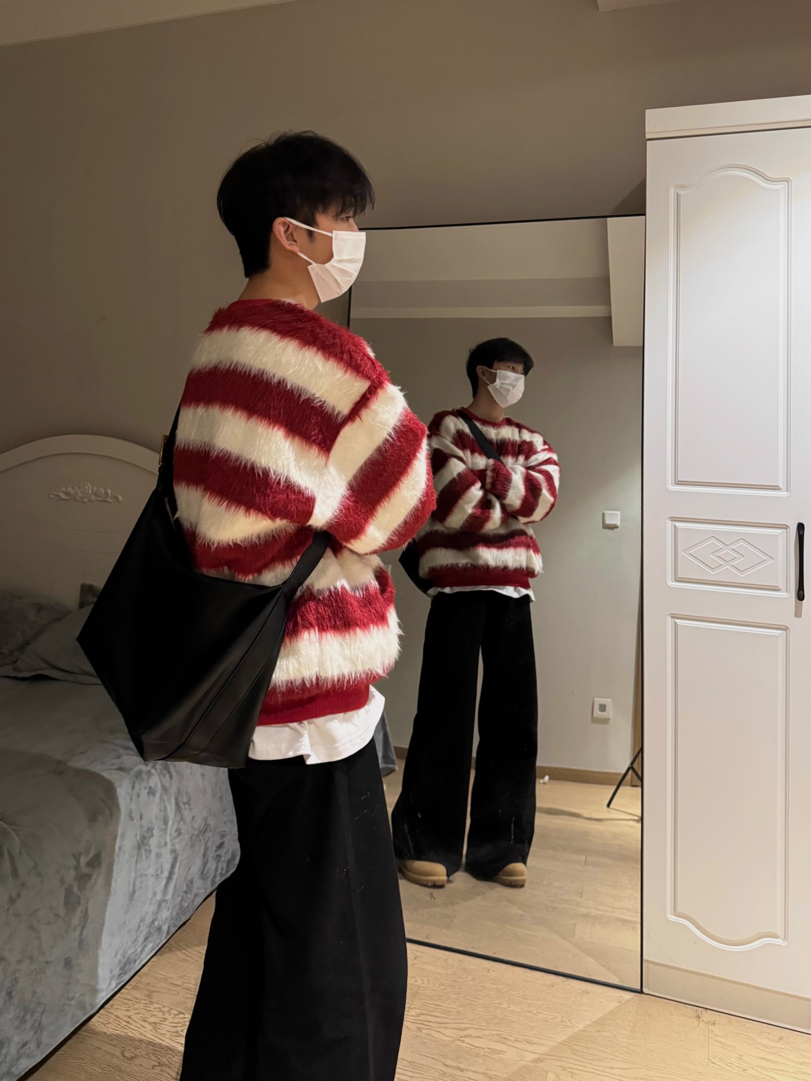 水貂絨條紋情侶毛衣男秋冬季韓版寬松針織衫oversize圓領軟糯上衣