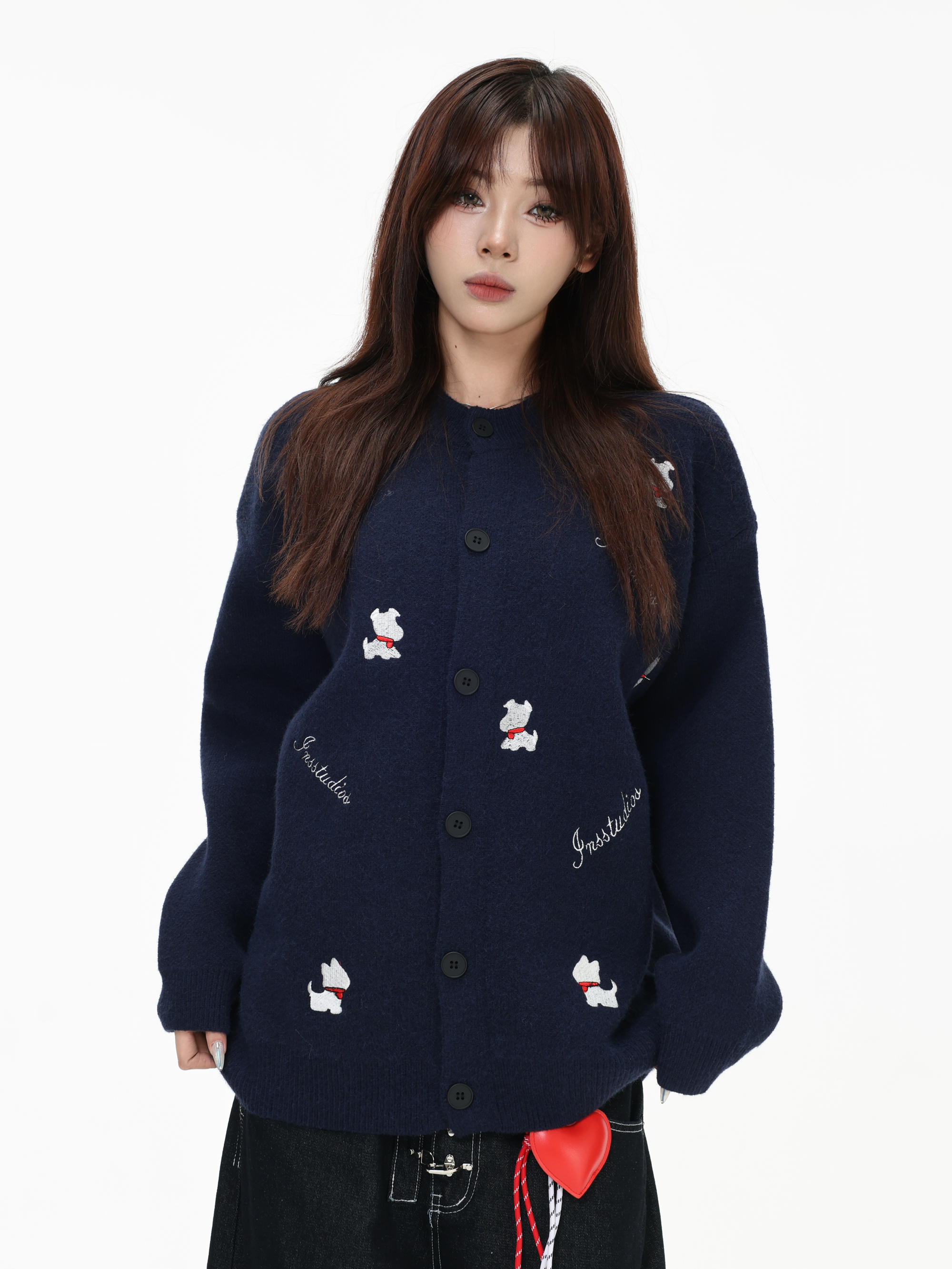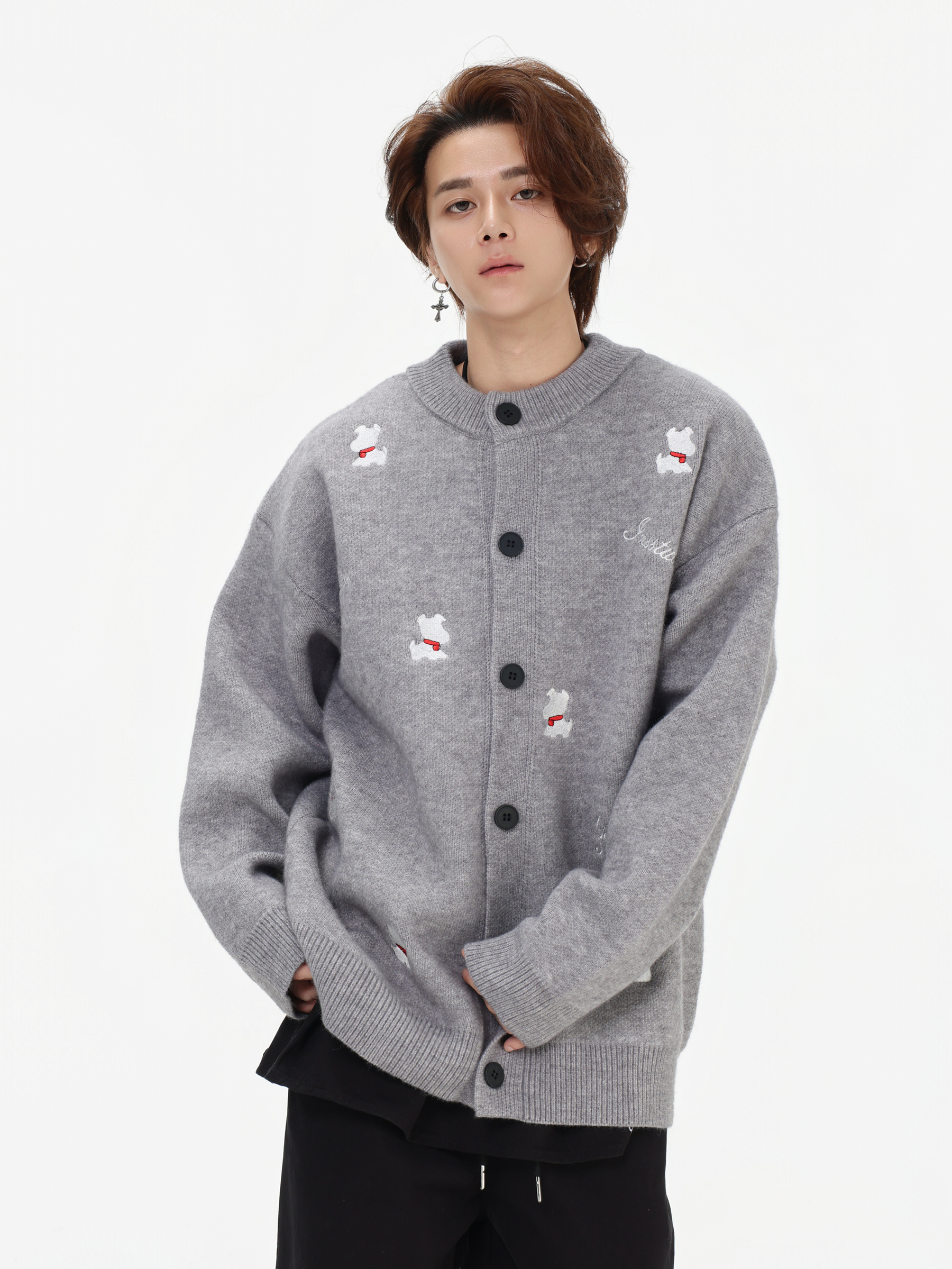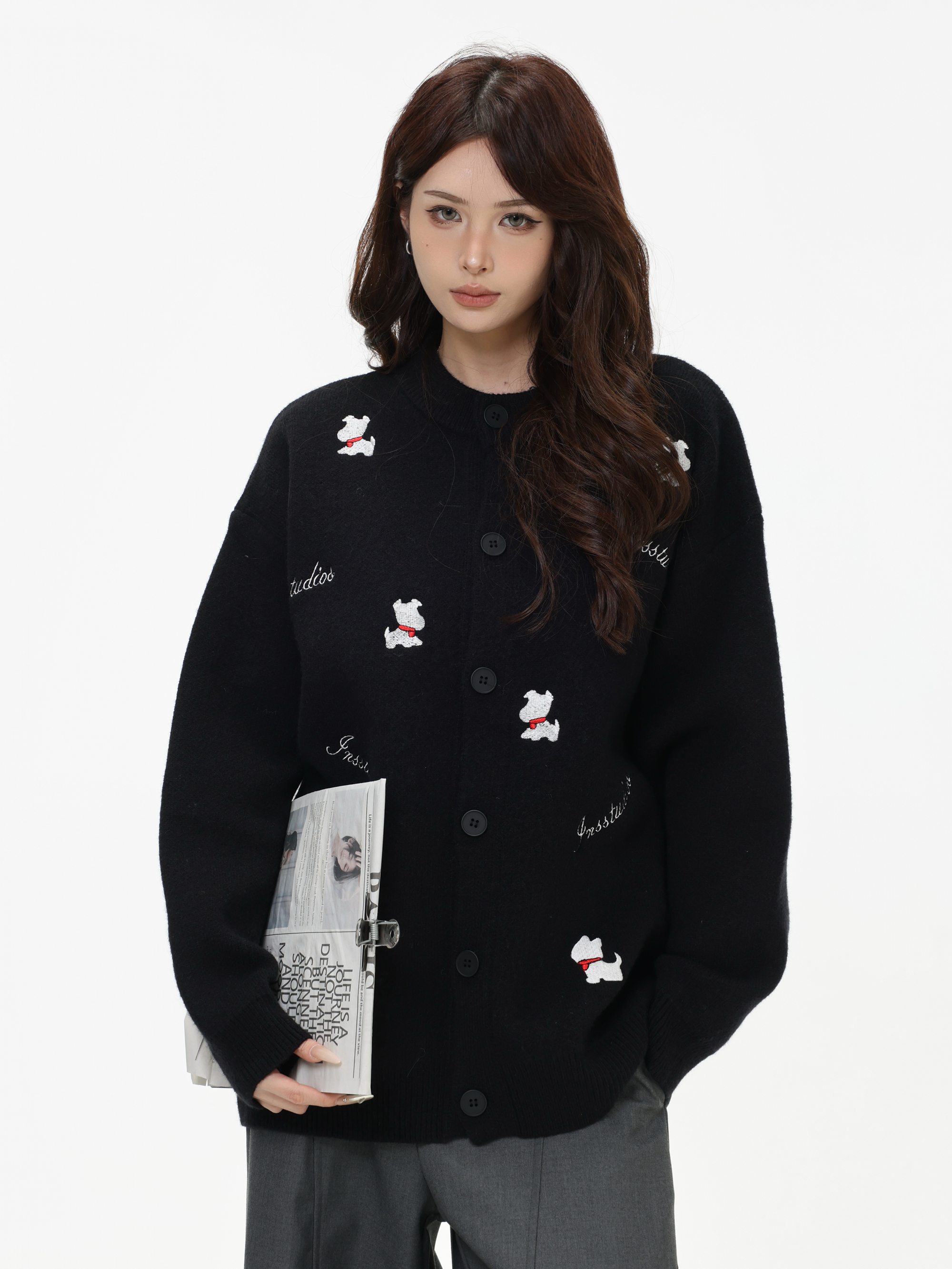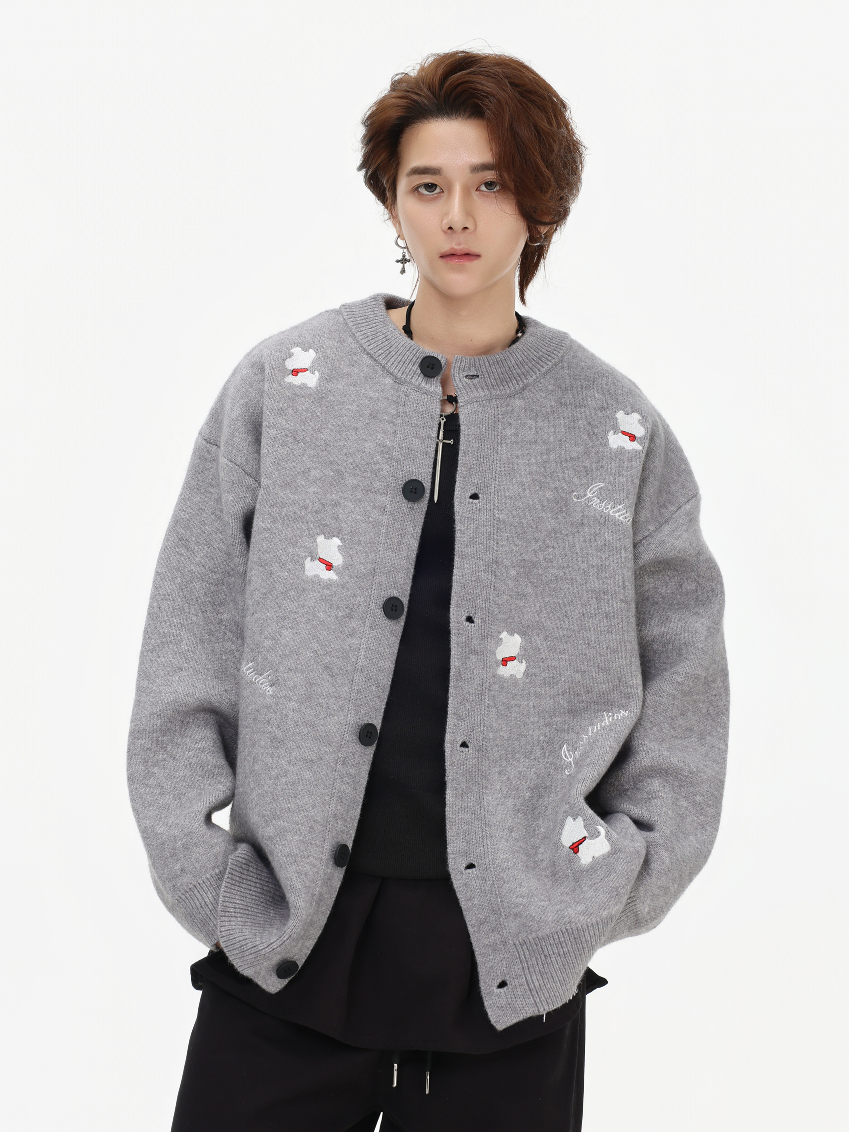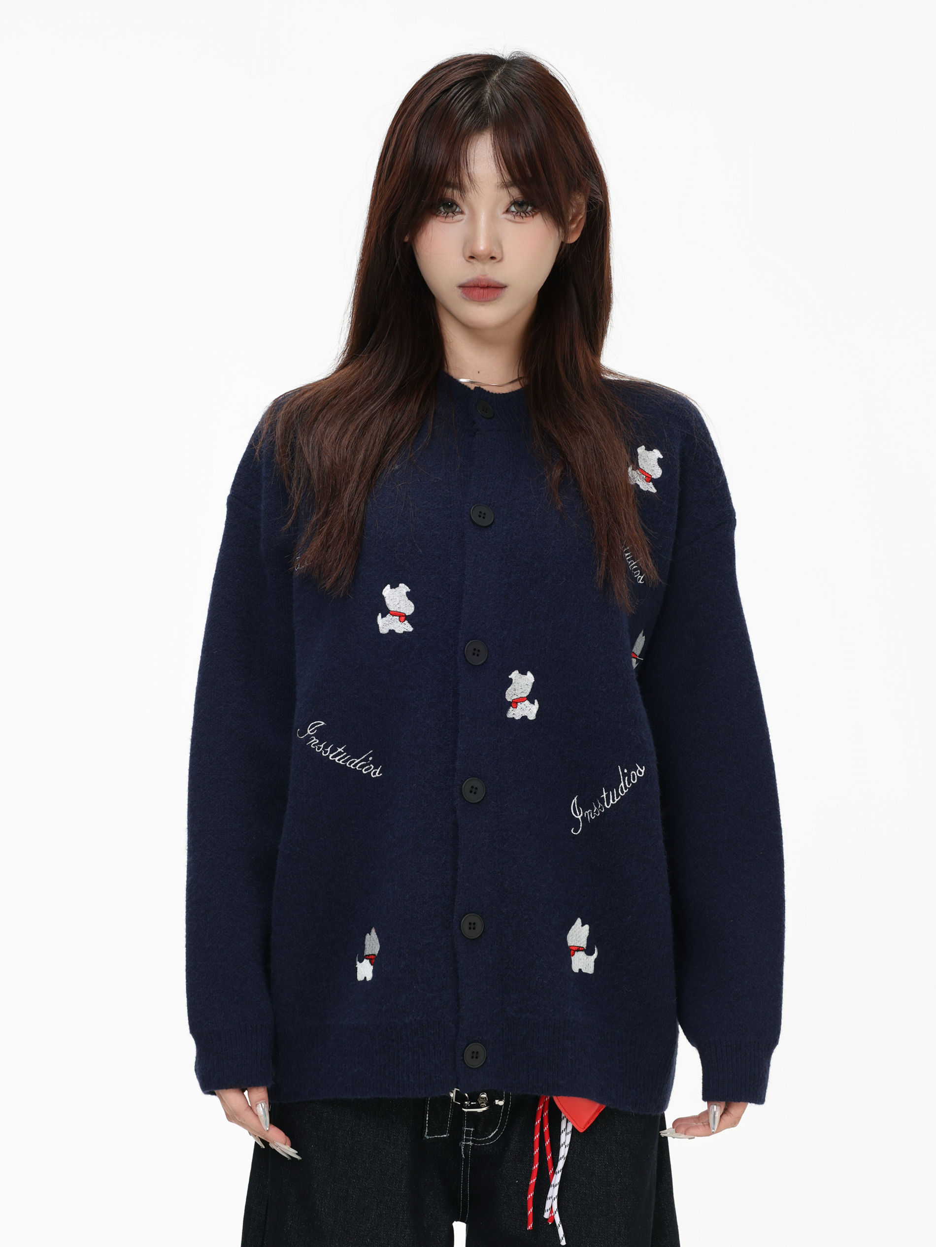 INSstudios 國潮美式「小狗刺綉開衫毛衣」寬松休閒百搭針織外套