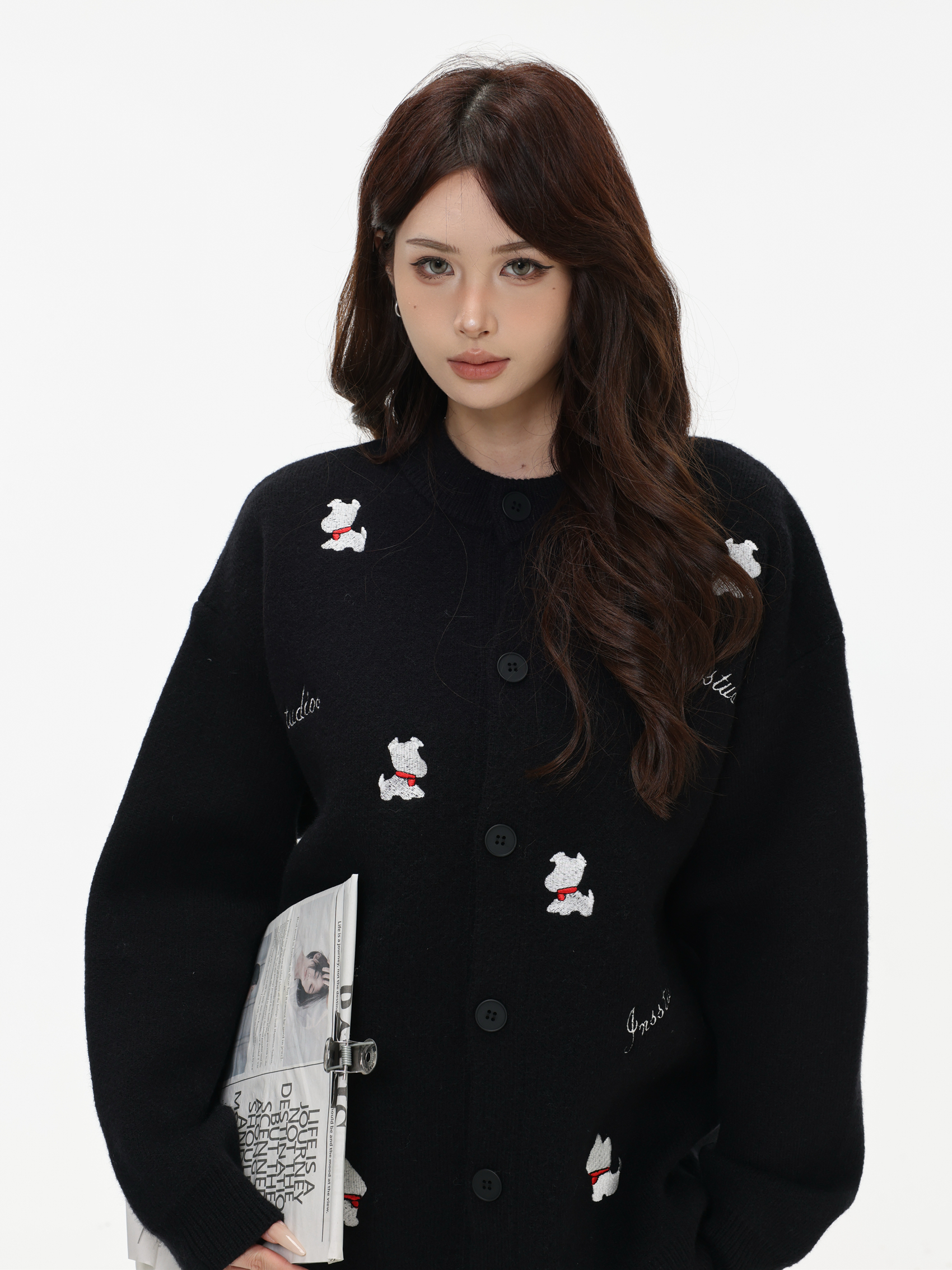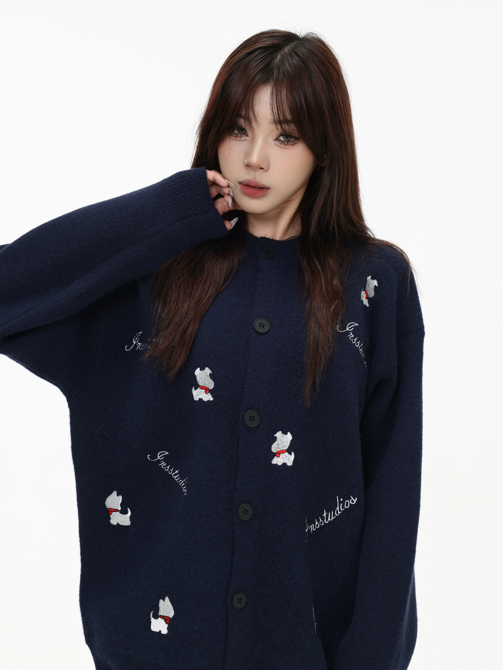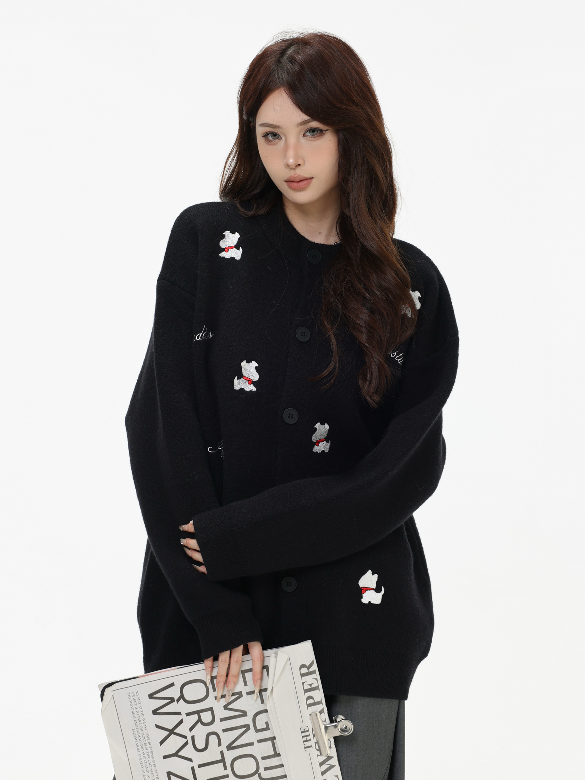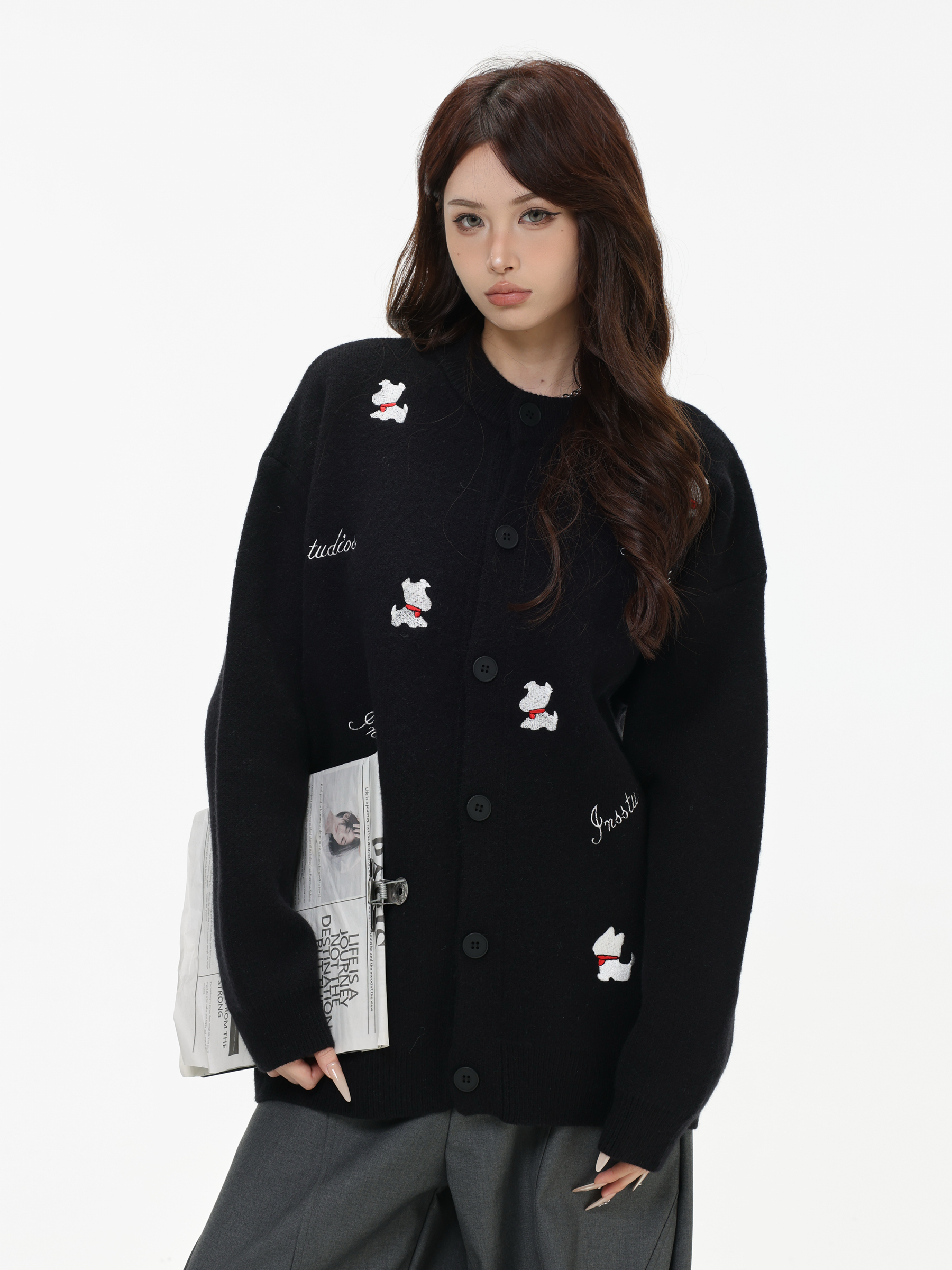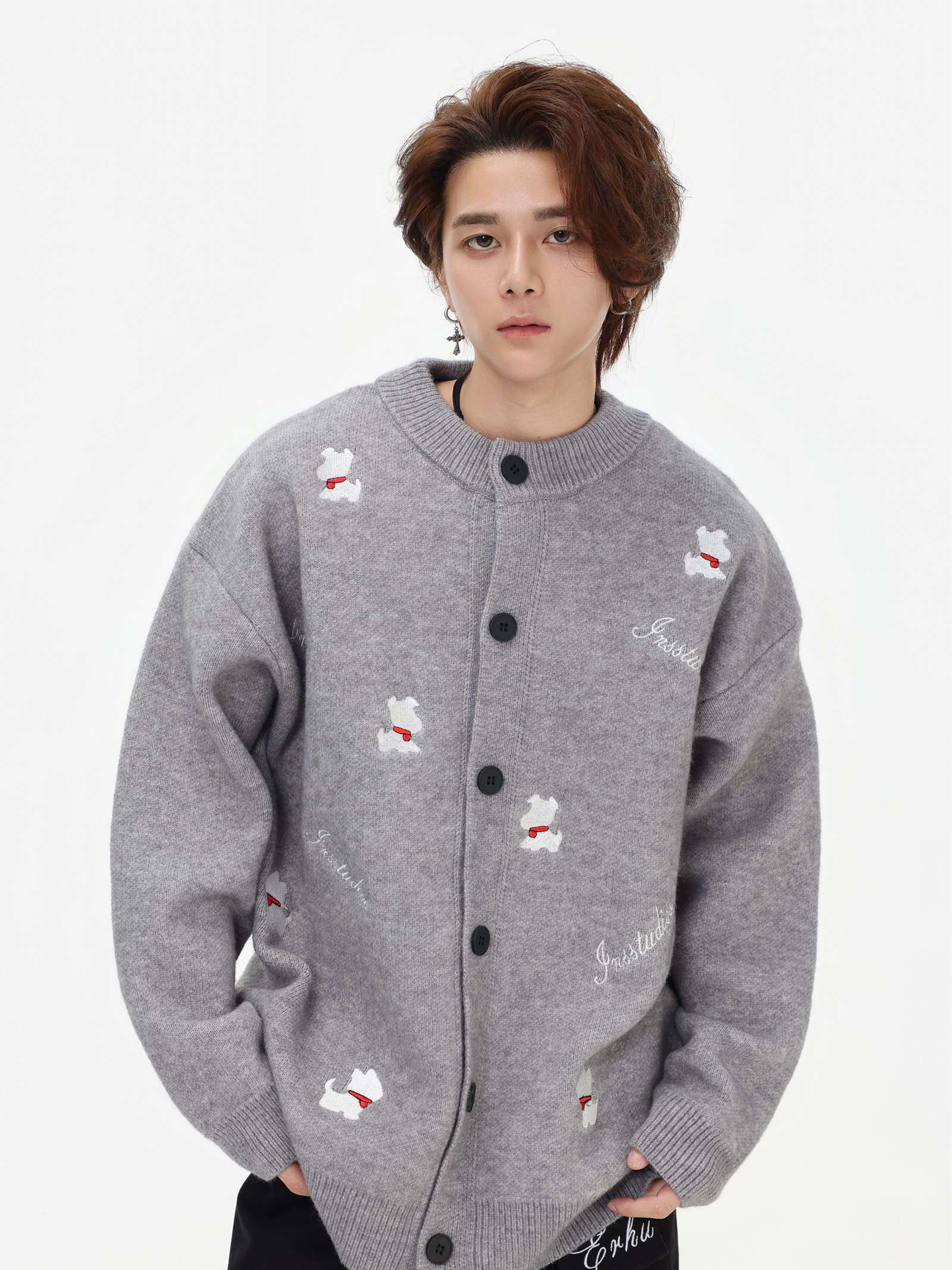 INSstudios 國潮美式「小狗刺綉開衫毛衣」寬松休閒百搭針織外套