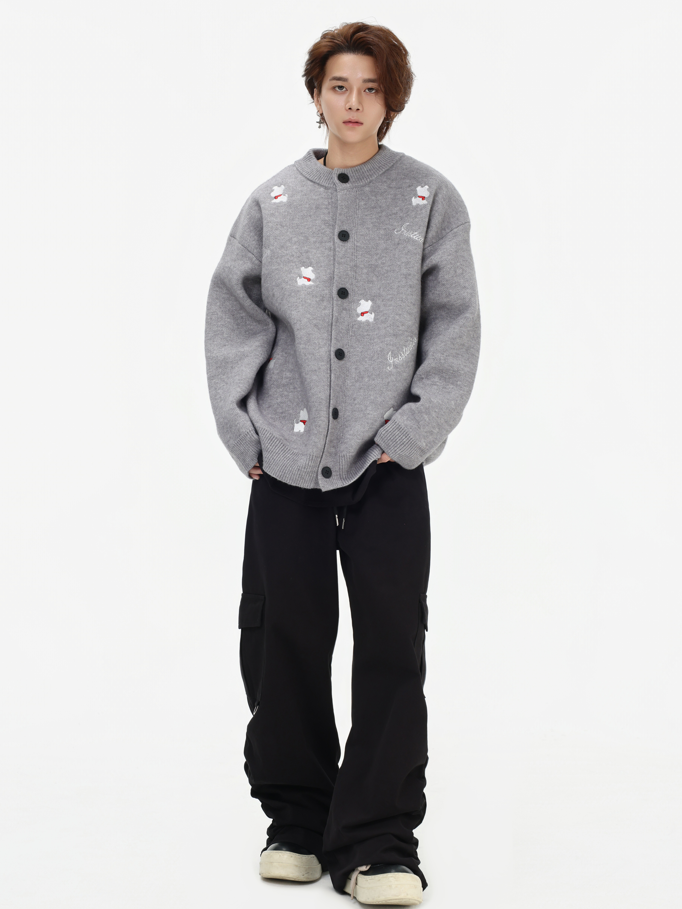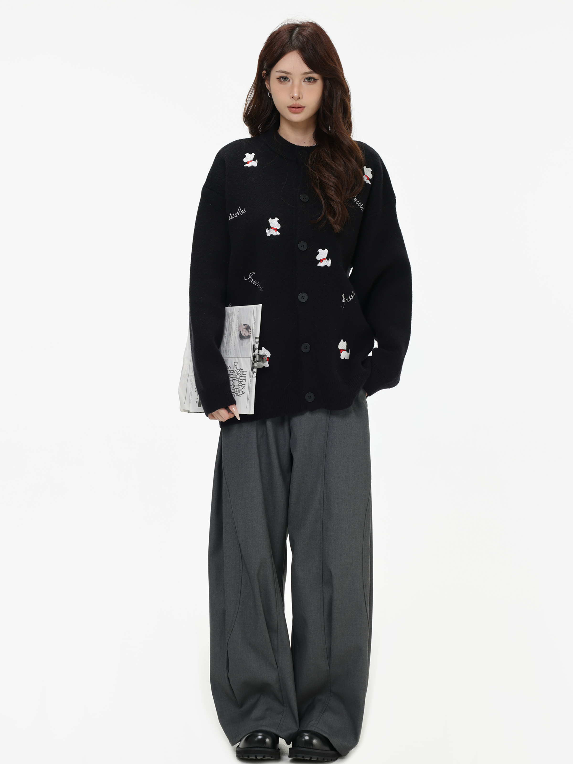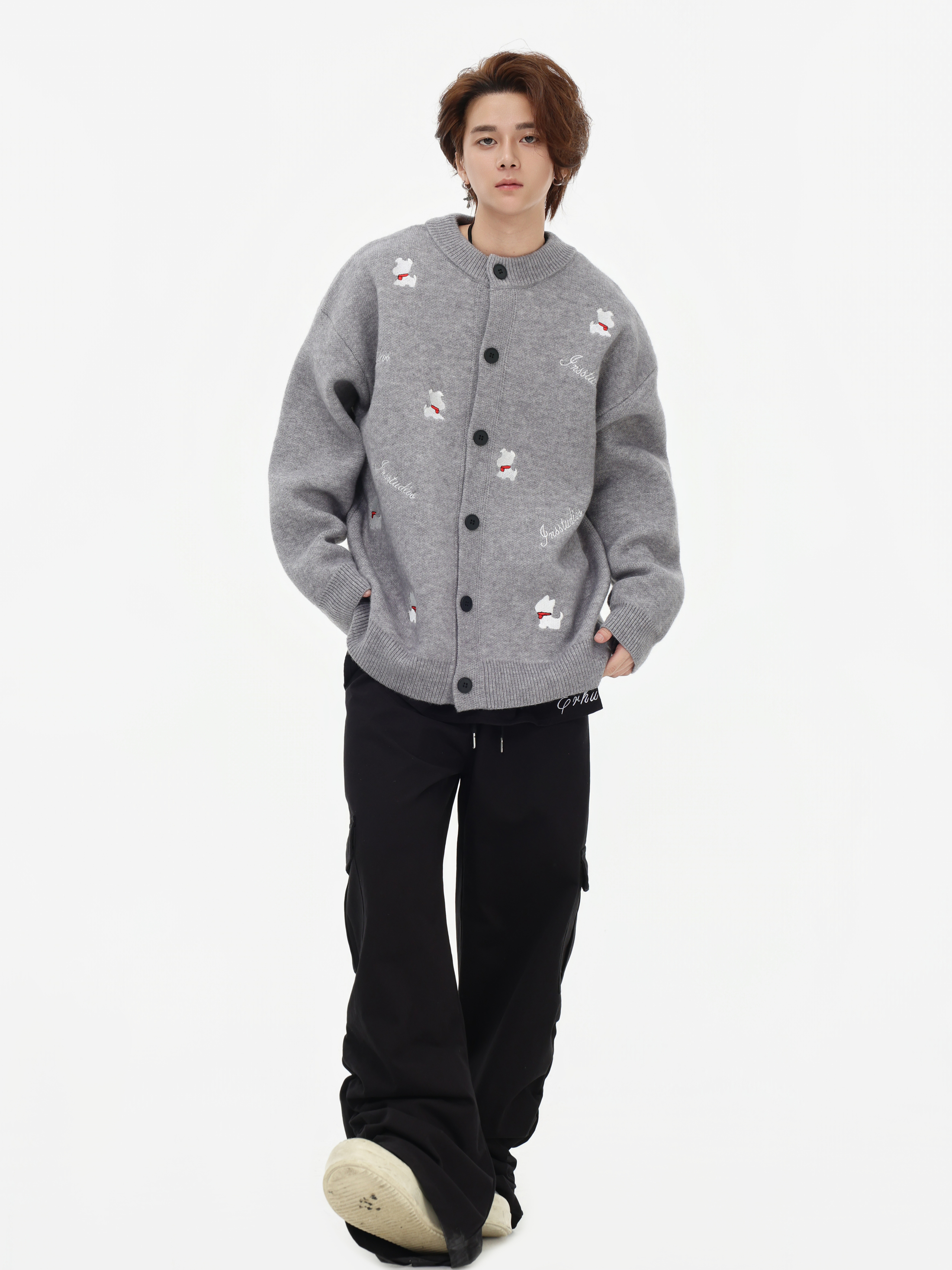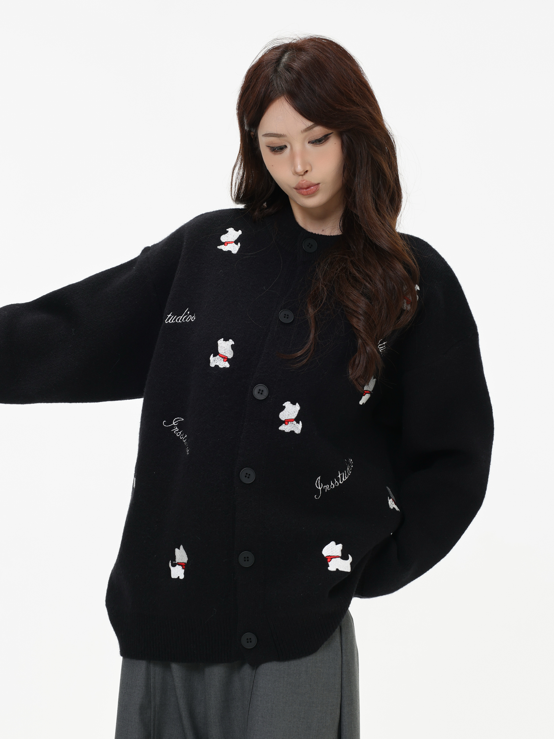 INSstudios 國潮美式「小狗刺綉開衫毛衣」寬松休閒百搭針織外套