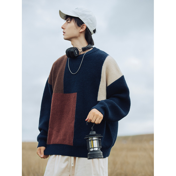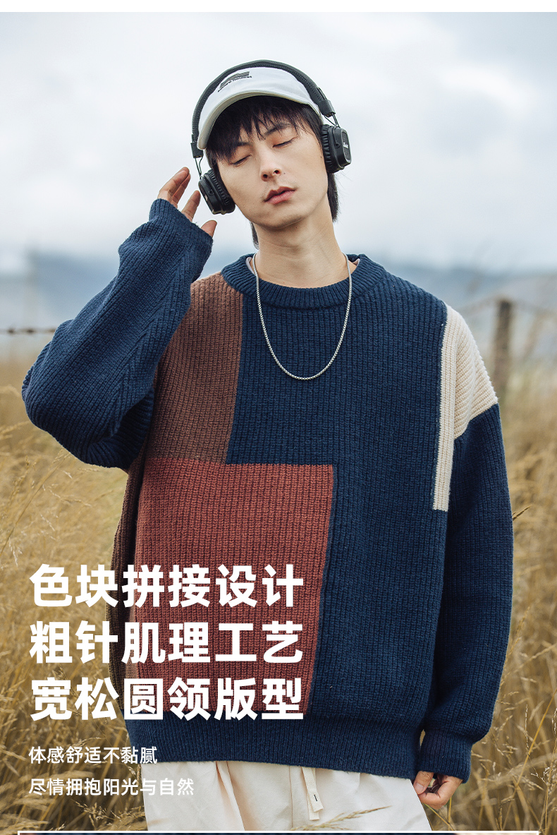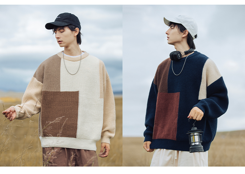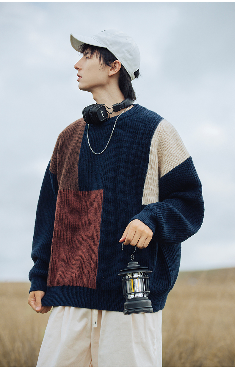 秋冬撞色拼接設計毛衣圓領休閒寬松毛衫冬季慵懶風復古針織衫男士
