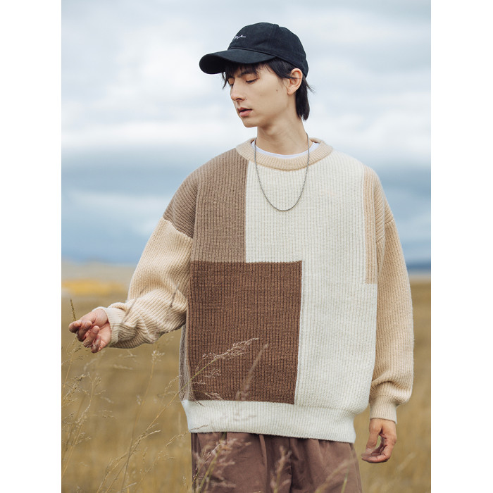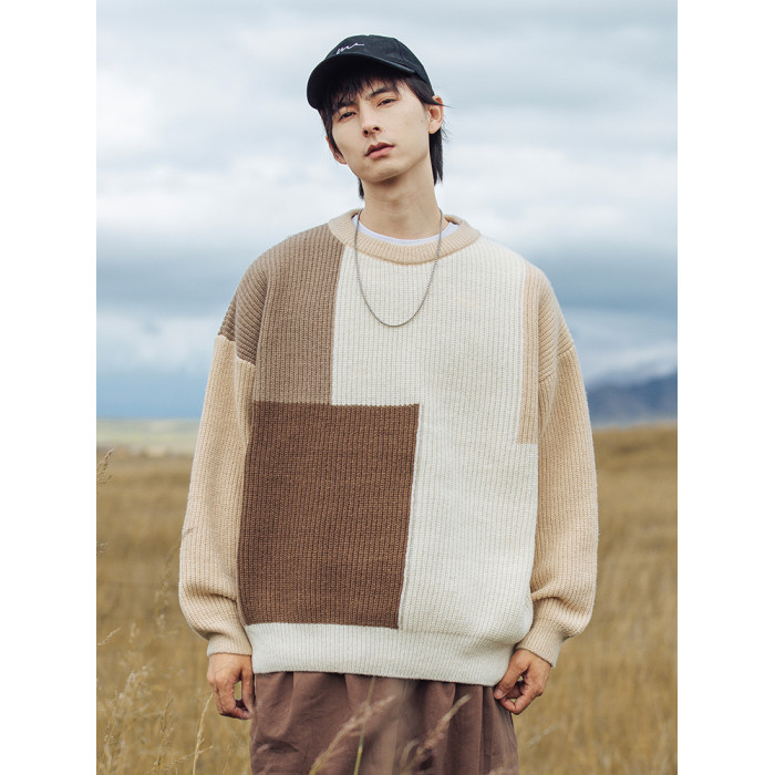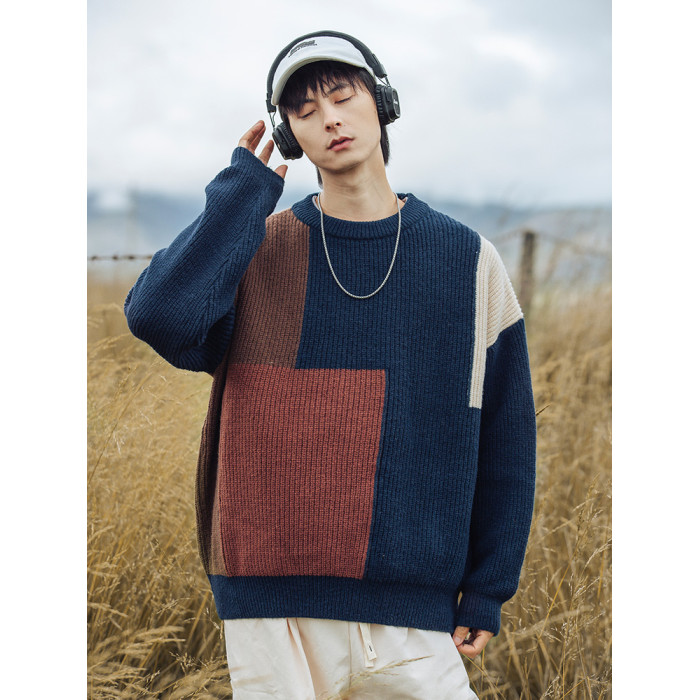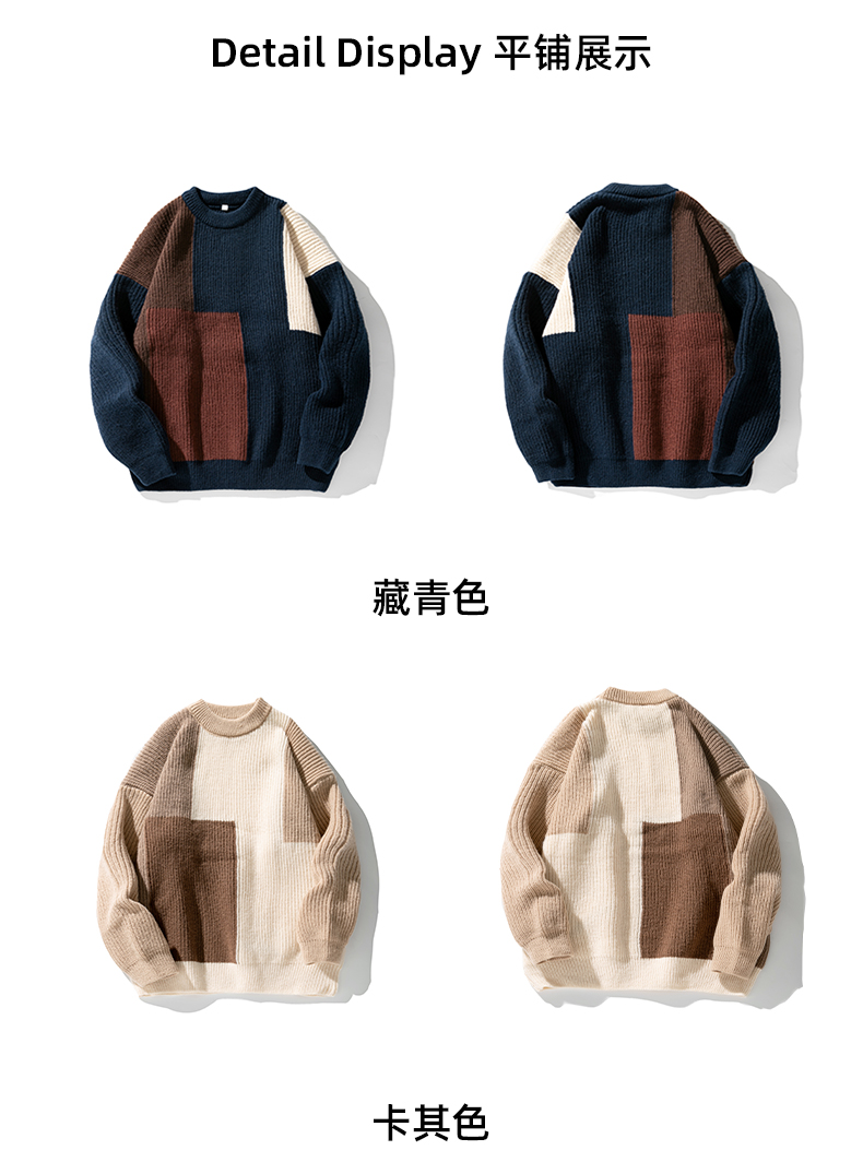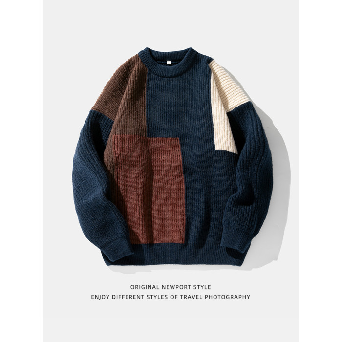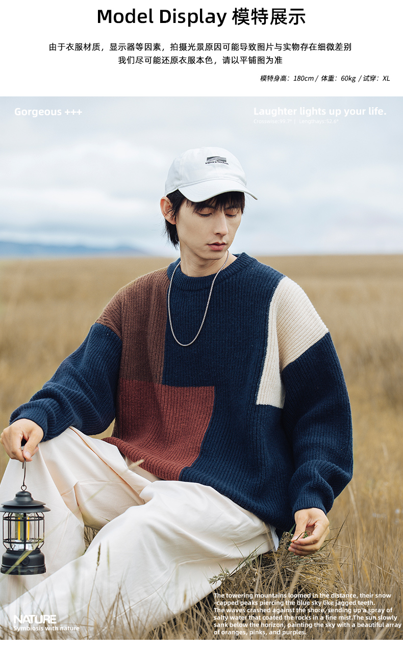 秋冬撞色拼接設計毛衣圓領休閒寬松毛衫冬季慵懶風復古針織衫男士
