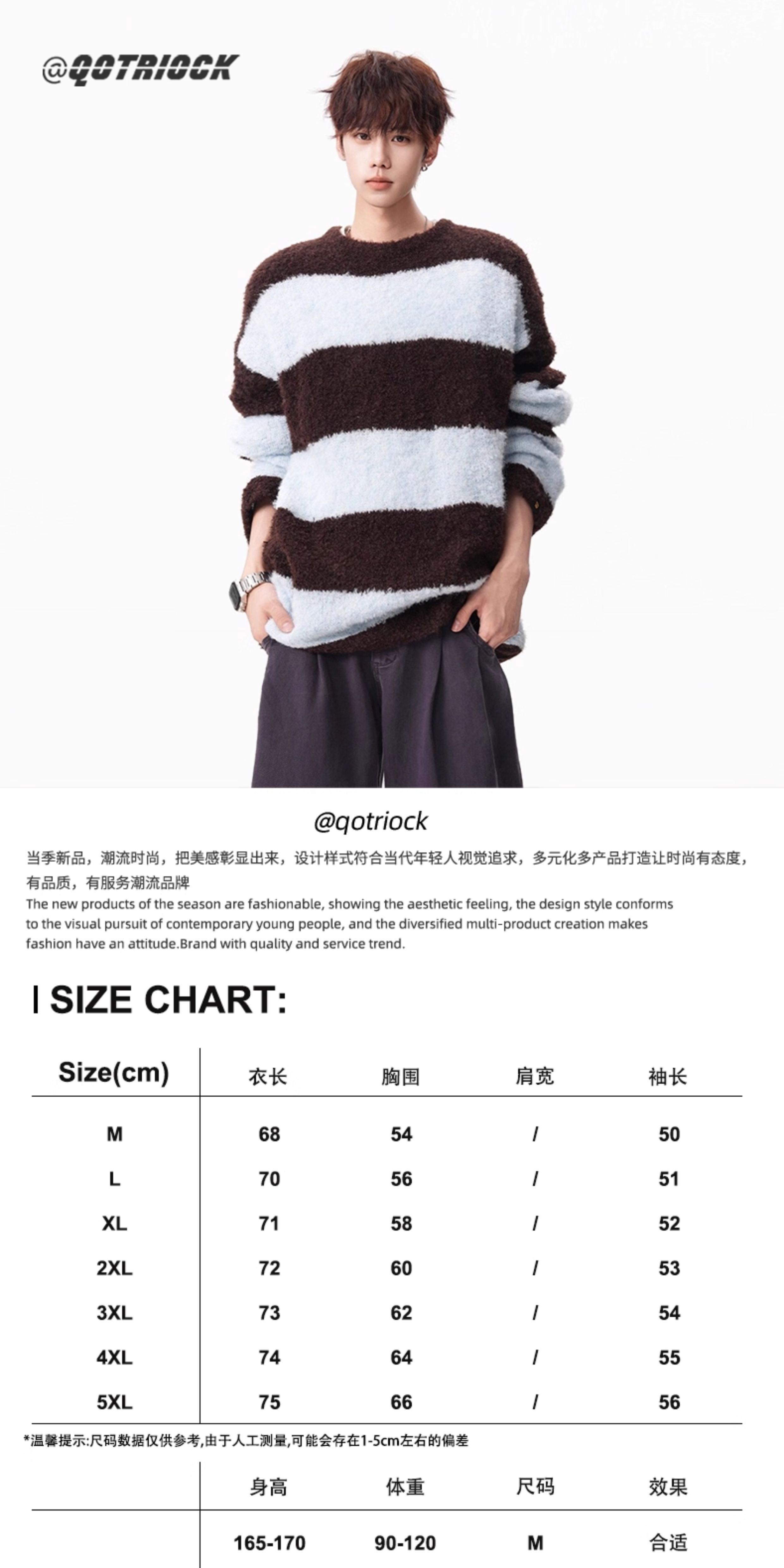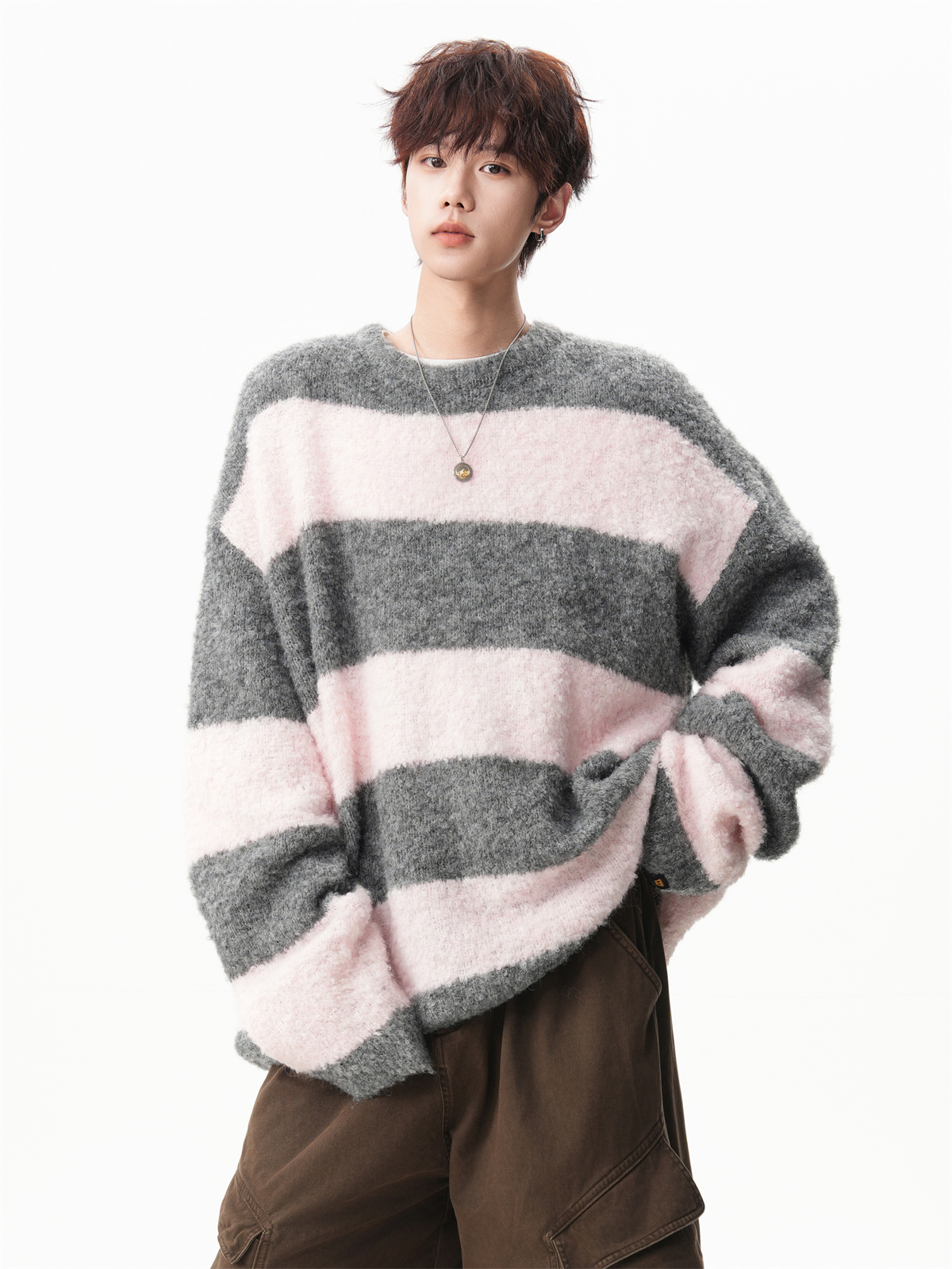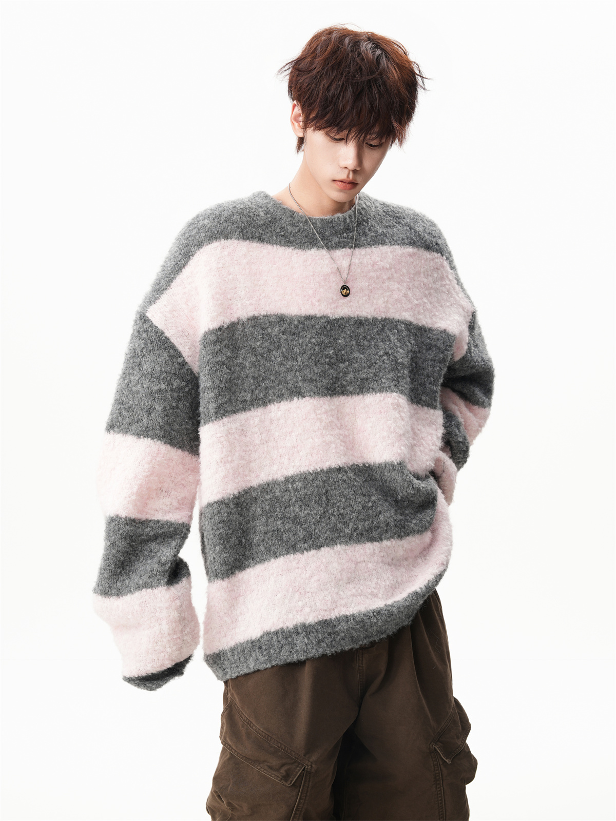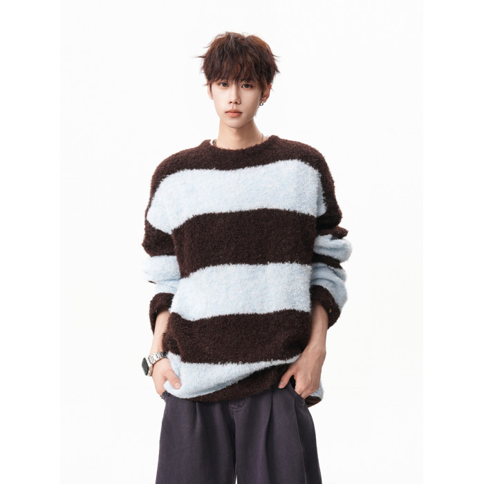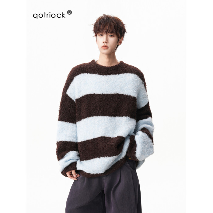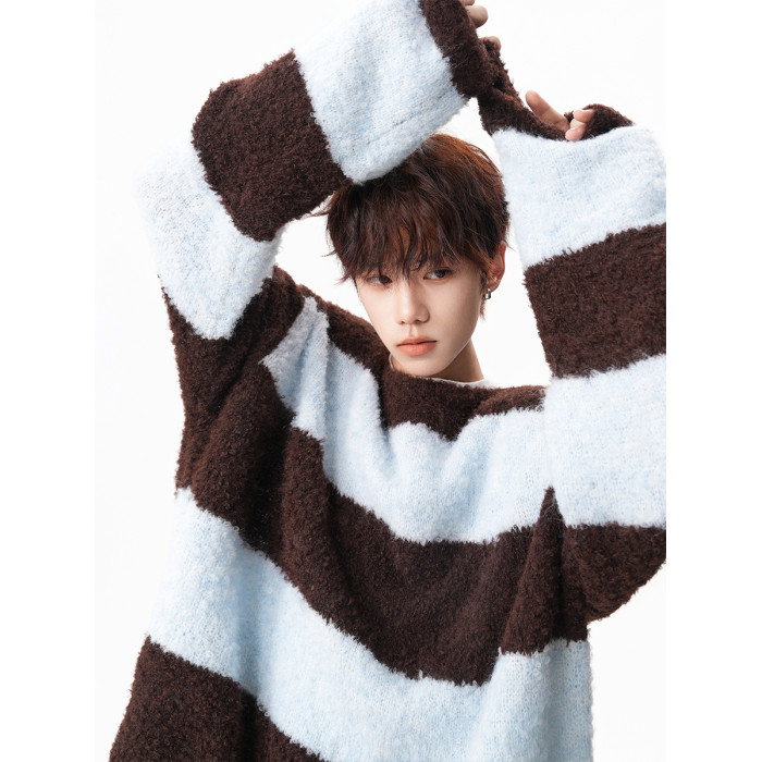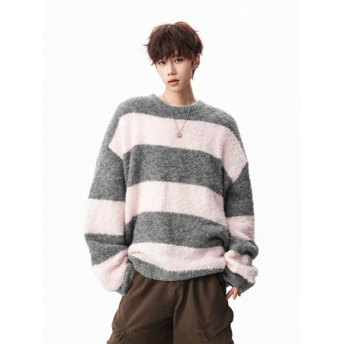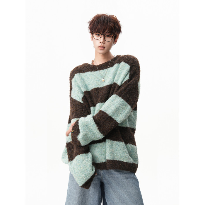 氛圍感條紋撞色圓領毛衣男秋冬慵懶感寬松休閒大碼情侶針織衫上衣