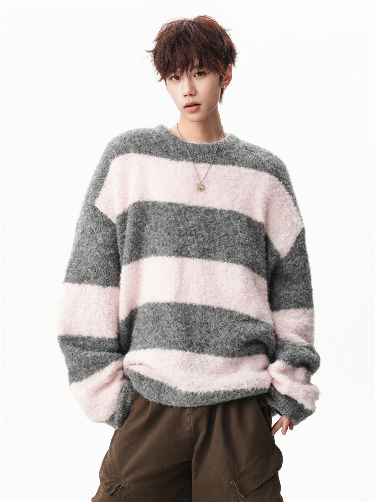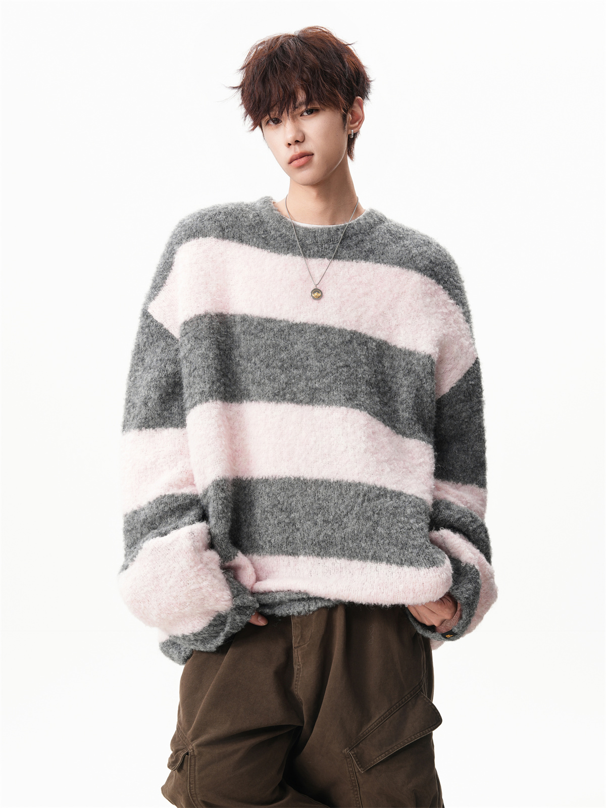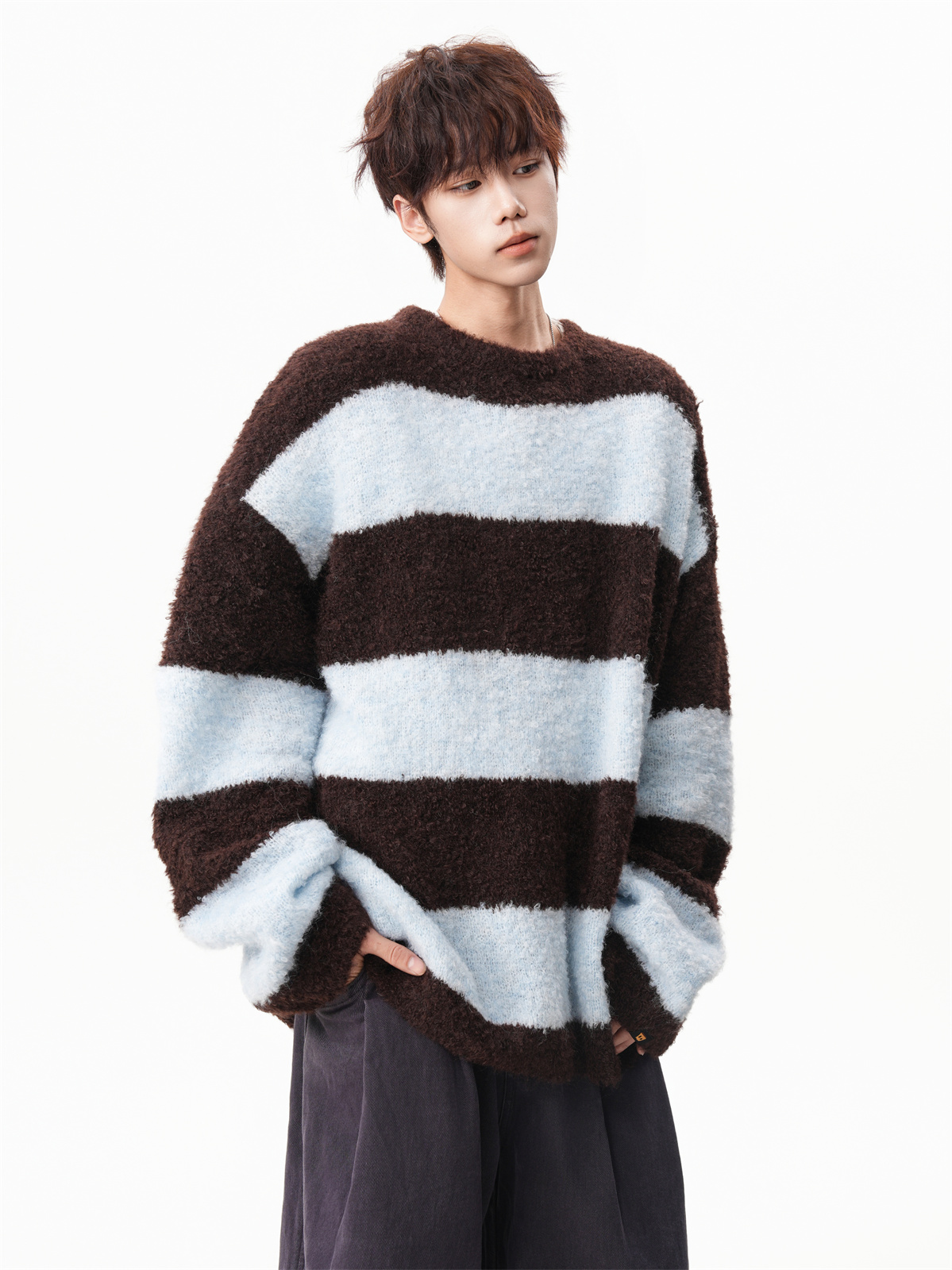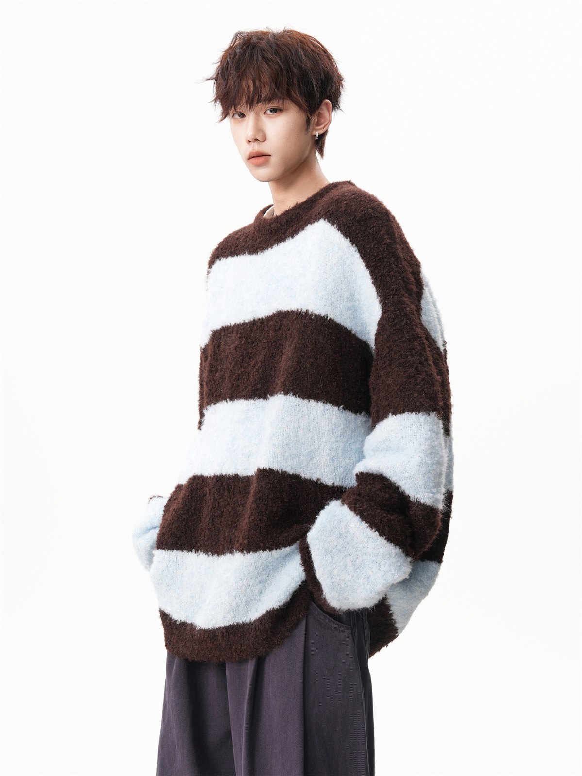 氛圍感條紋撞色圓領毛衣男秋冬慵懶感寬松休閒大碼情侶針織衫上衣