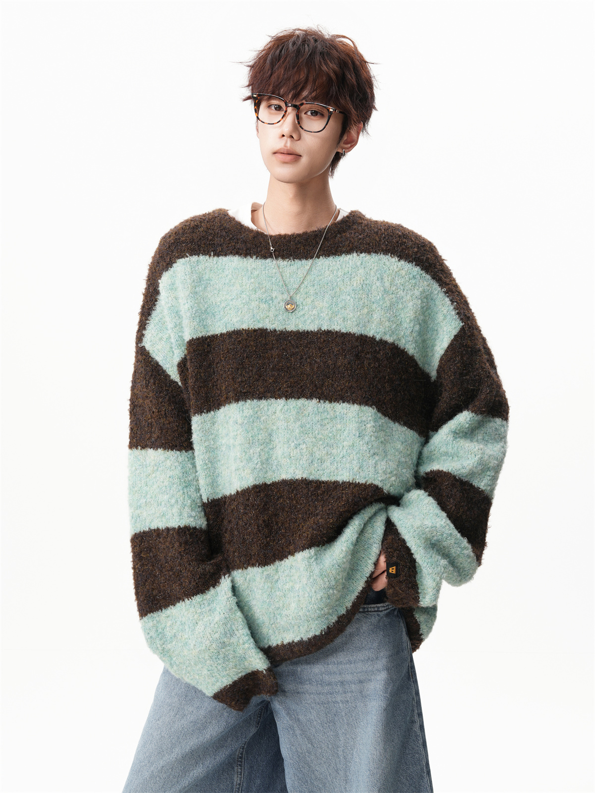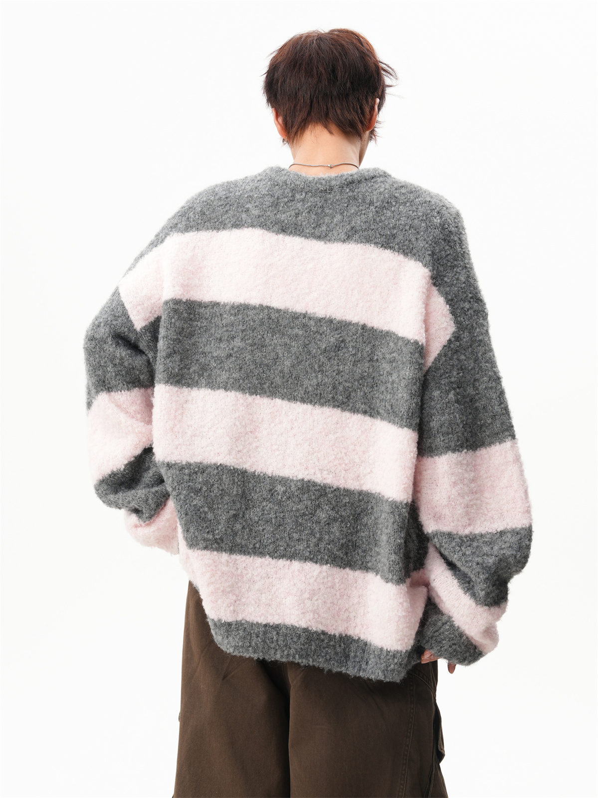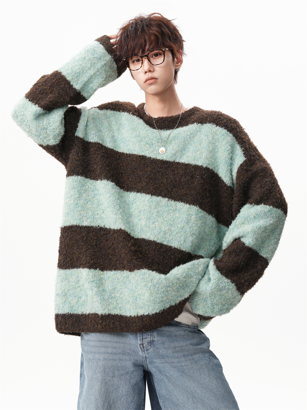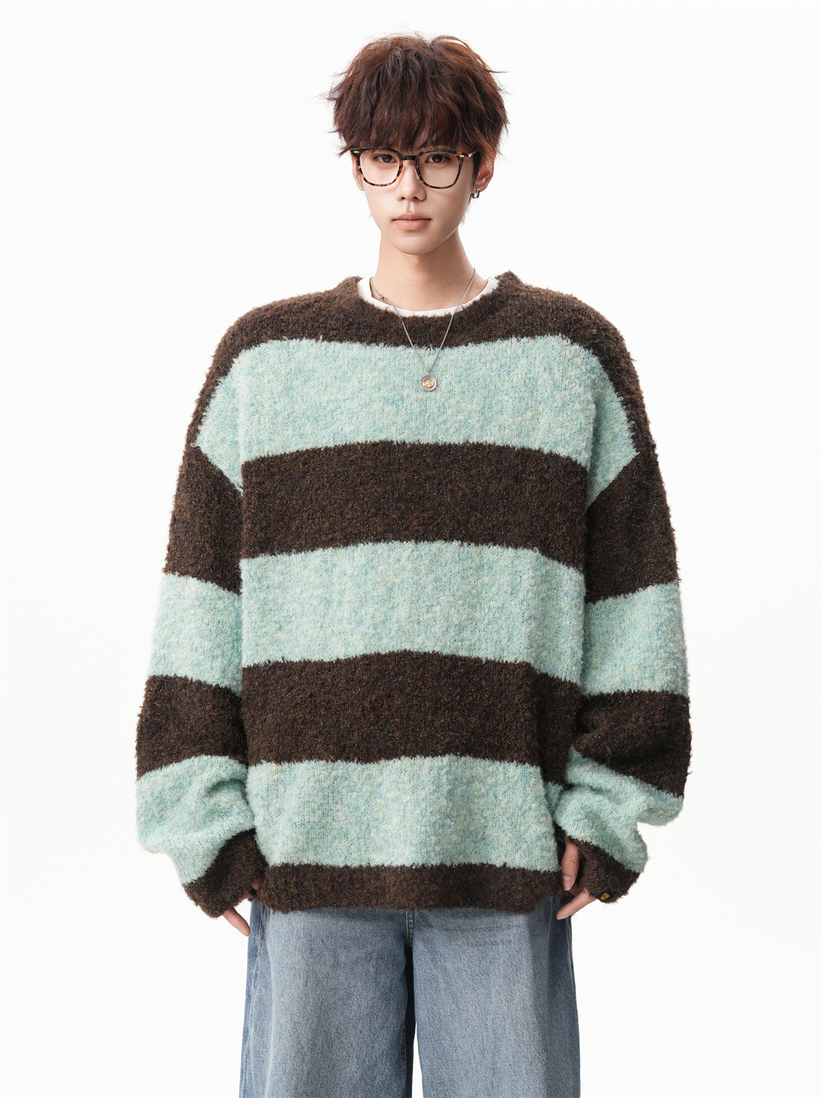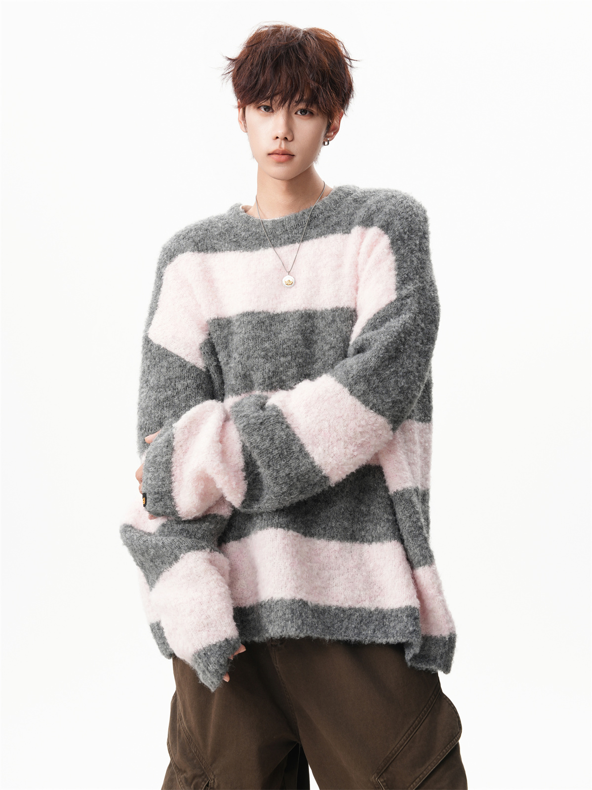 氛圍感條紋撞色圓領毛衣男秋冬慵懶感寬松休閒大碼情侶針織衫上衣