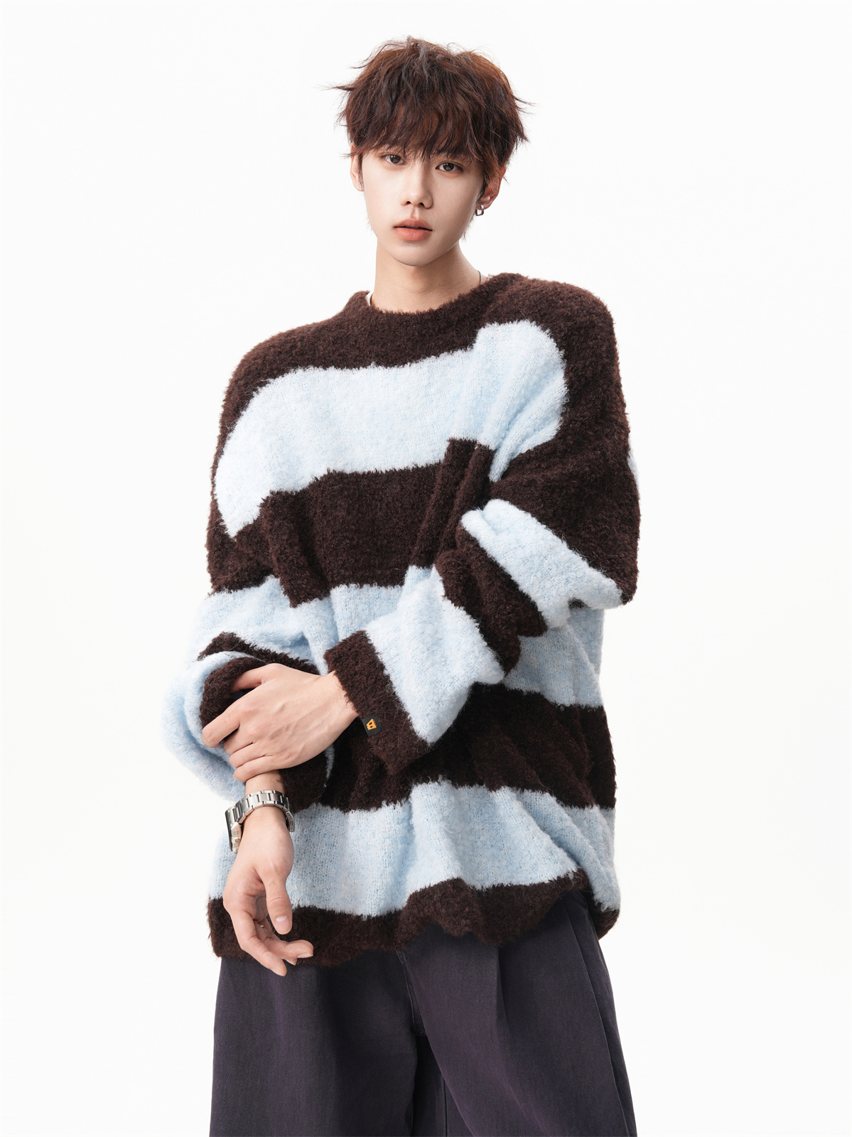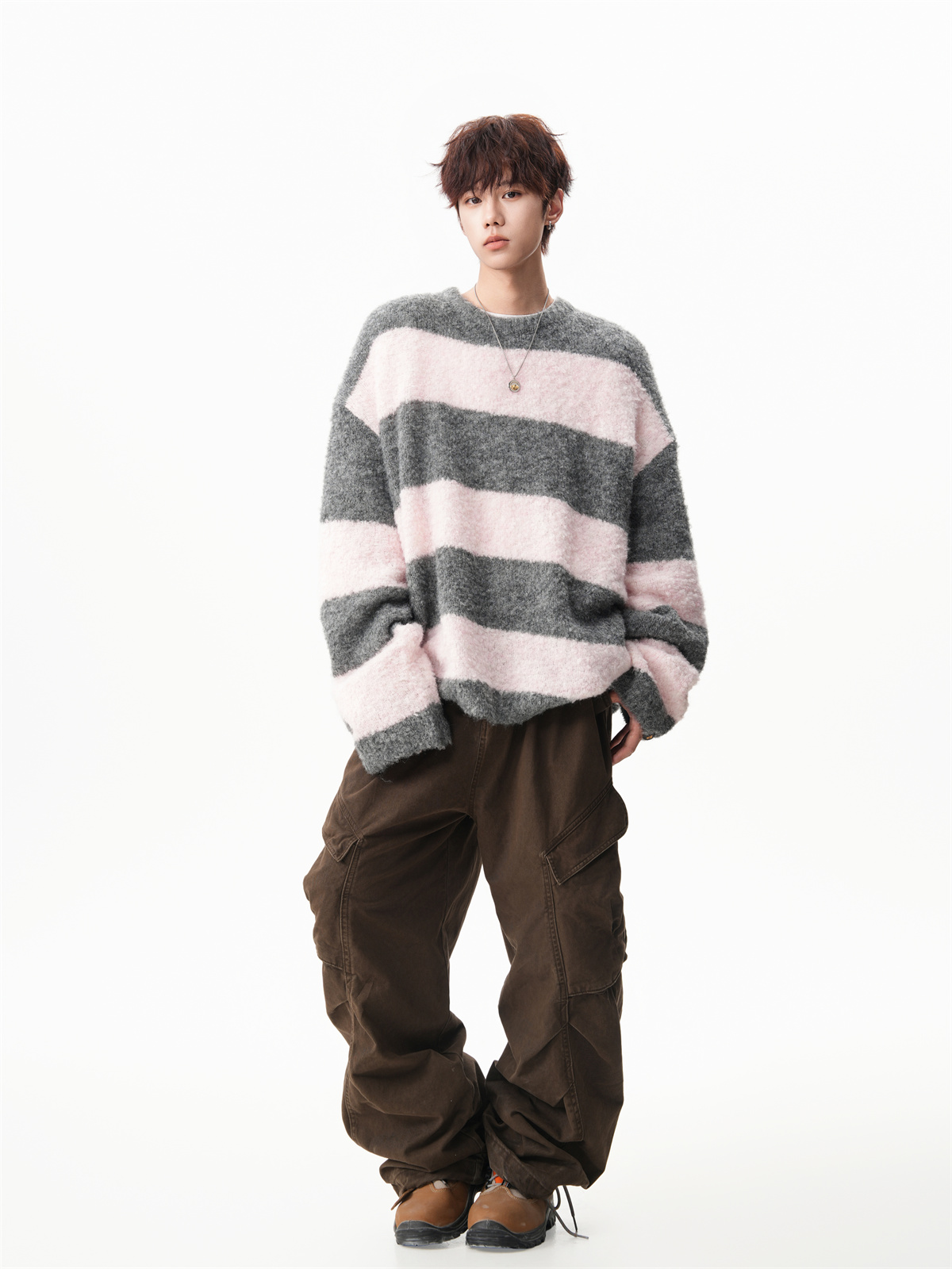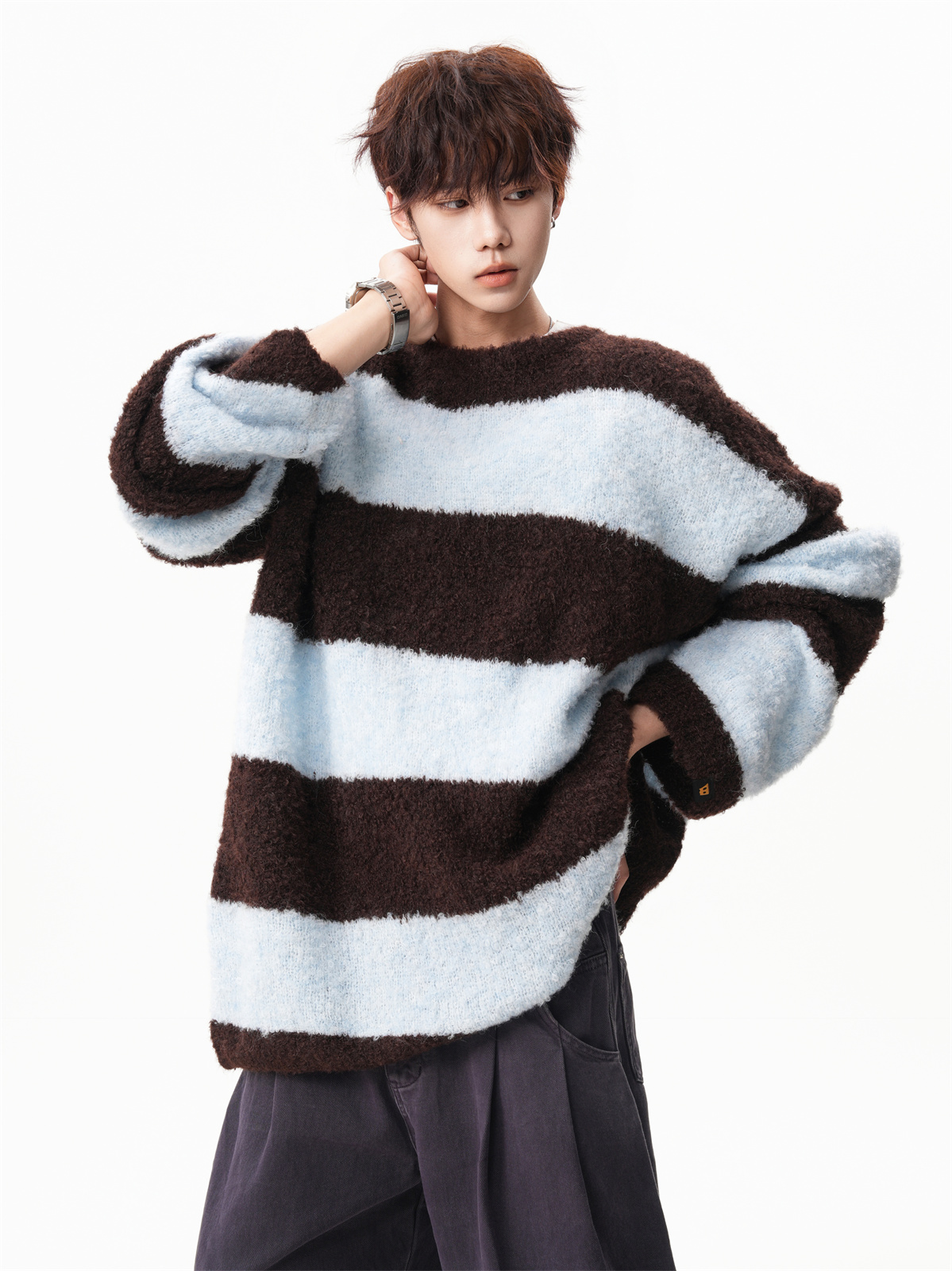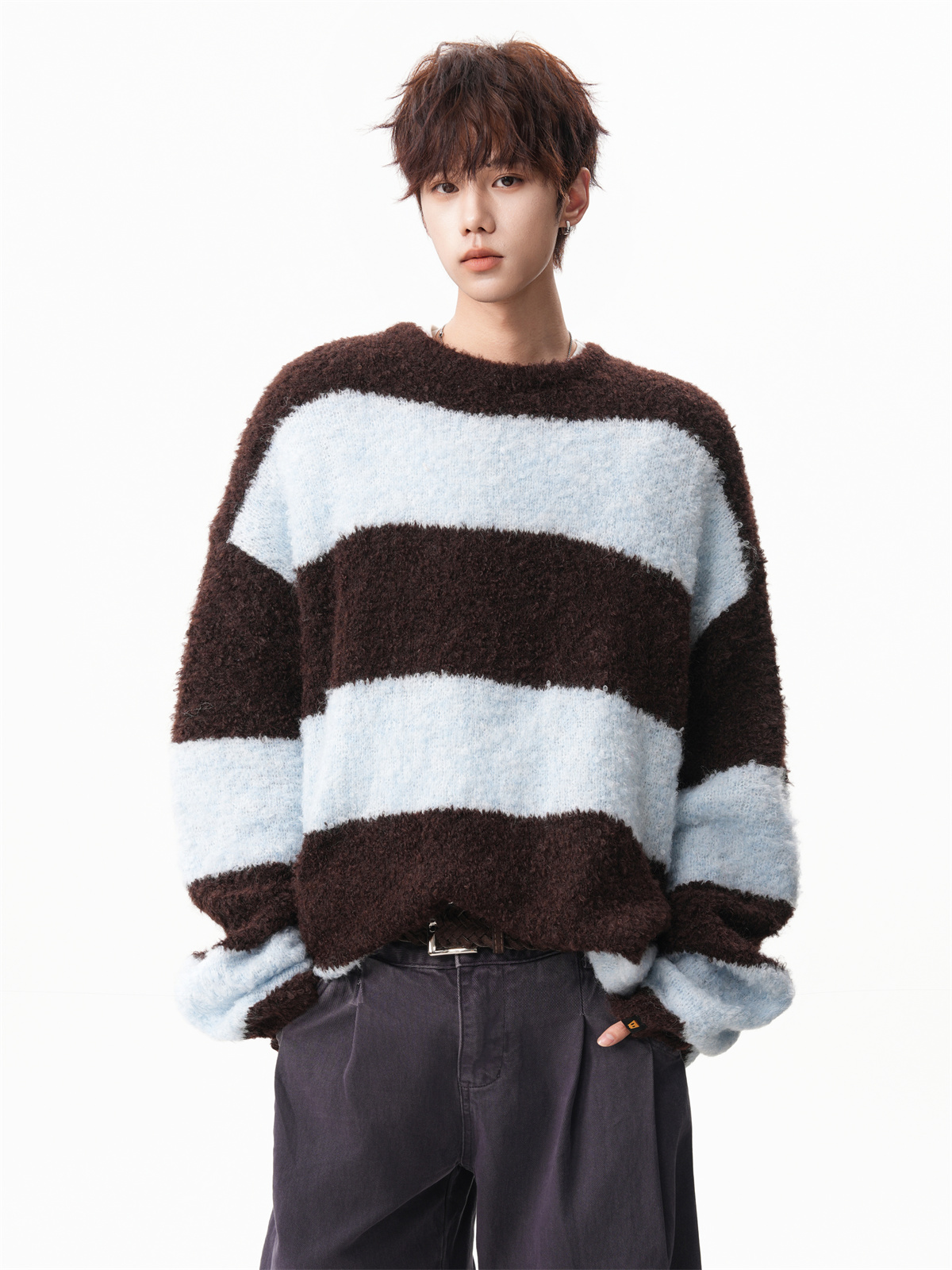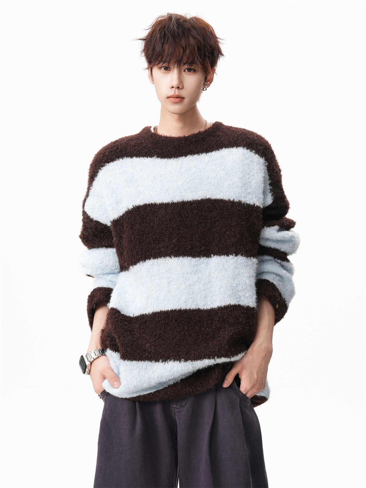 氛圍感條紋撞色圓領毛衣男秋冬慵懶感寬松休閒大碼情侶針織衫上衣