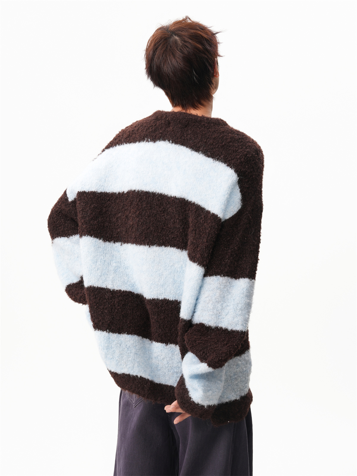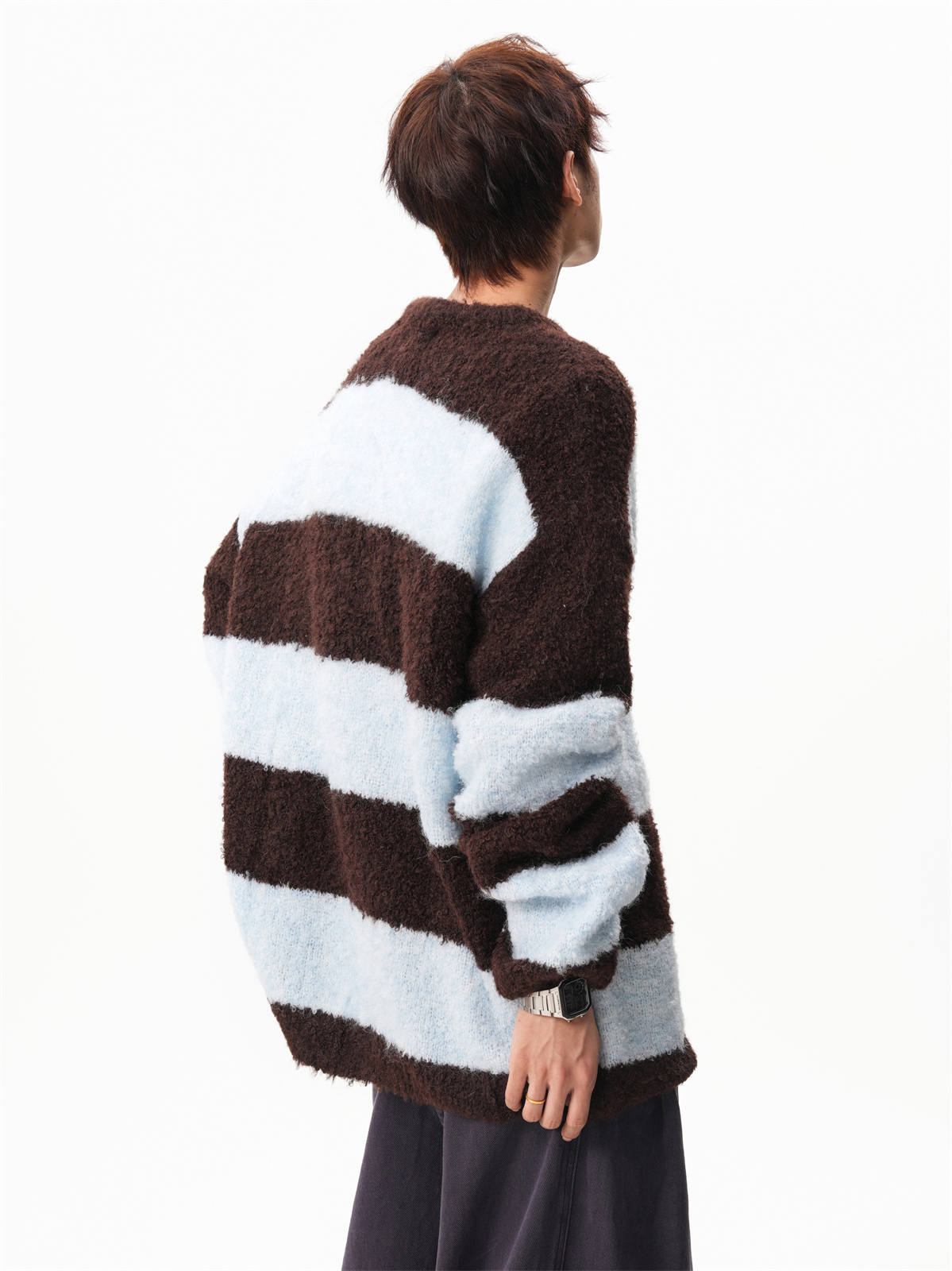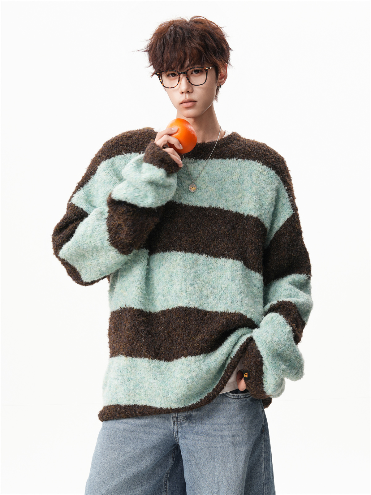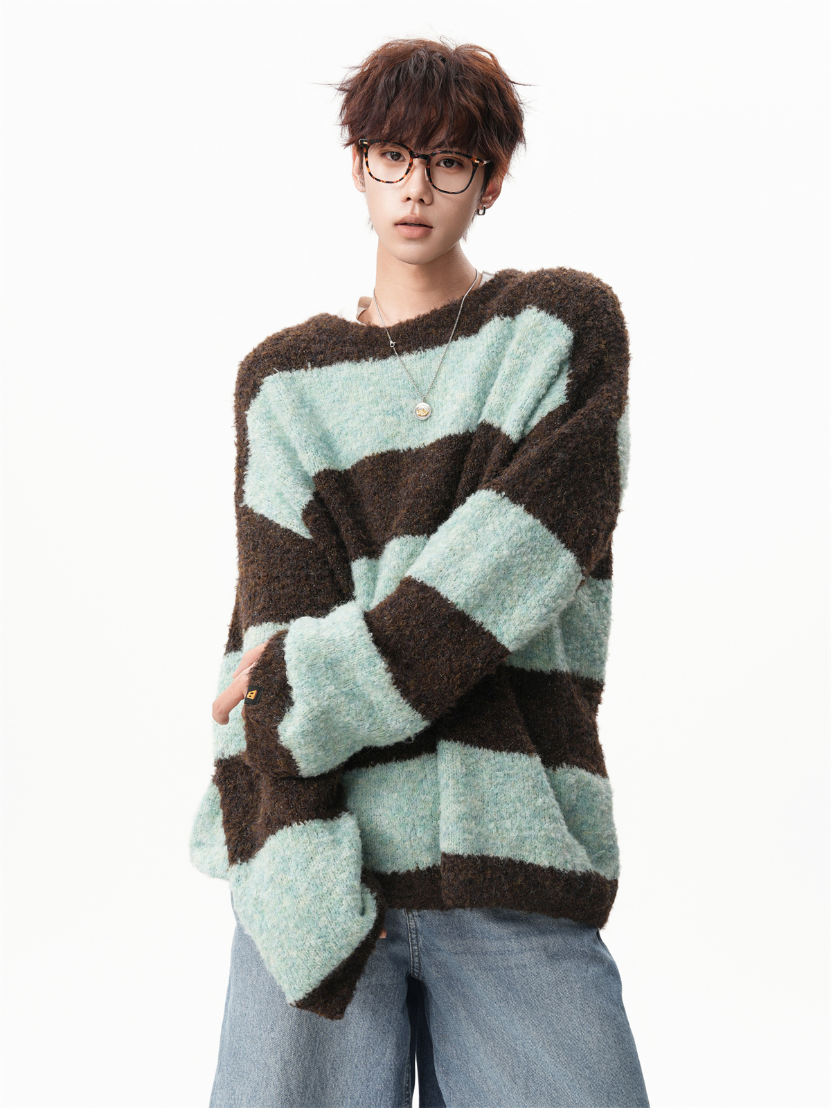 氛圍感條紋撞色圓領毛衣男秋冬慵懶感寬松休閒大碼情侶針織衫上衣