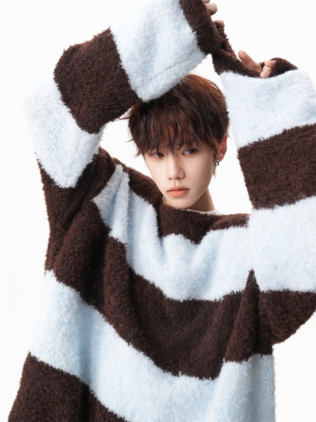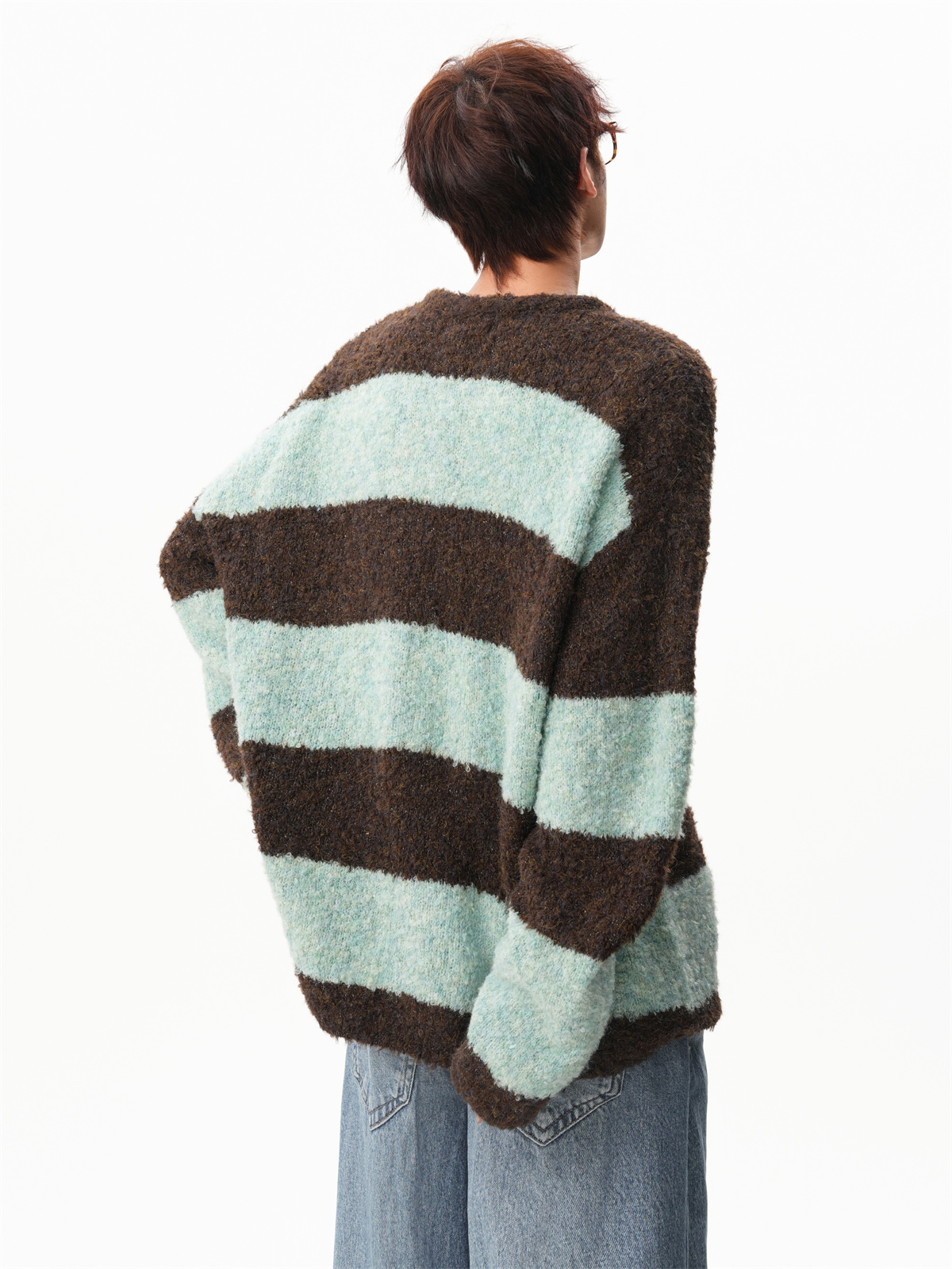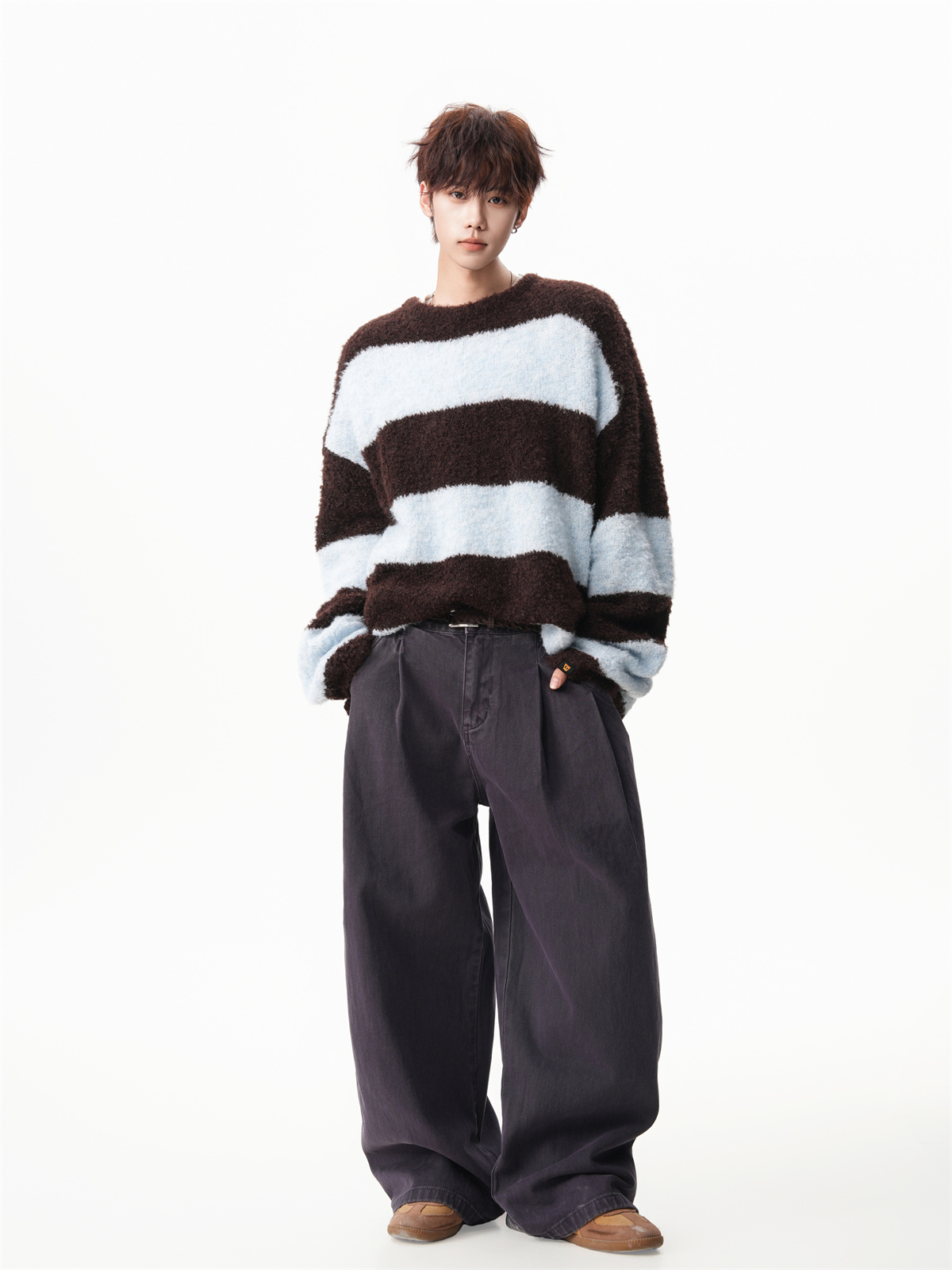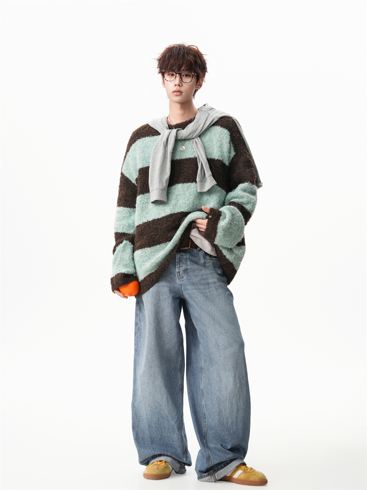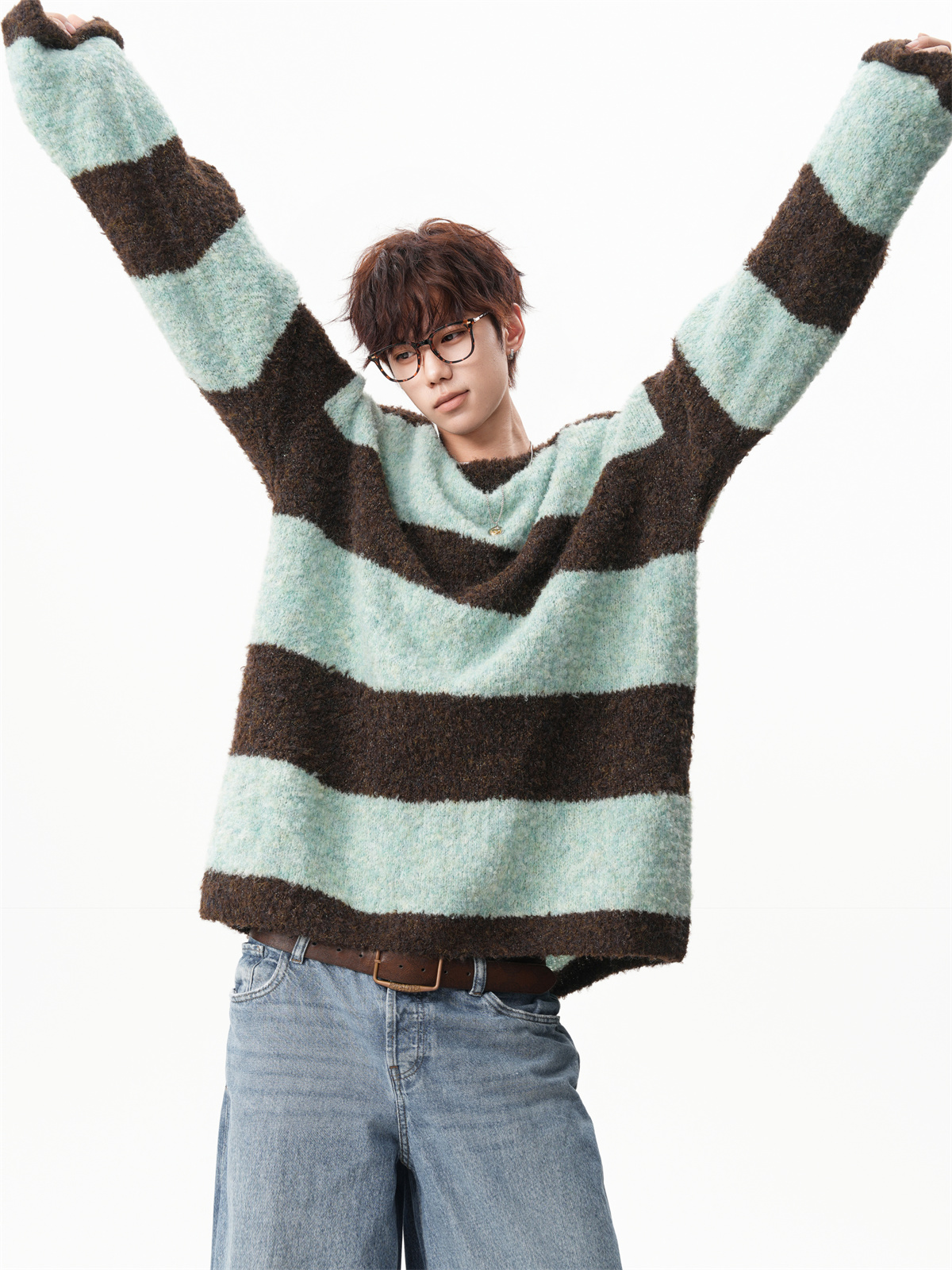 氛圍感條紋撞色圓領毛衣男秋冬慵懶感寬松休閒大碼情侶針織衫上衣