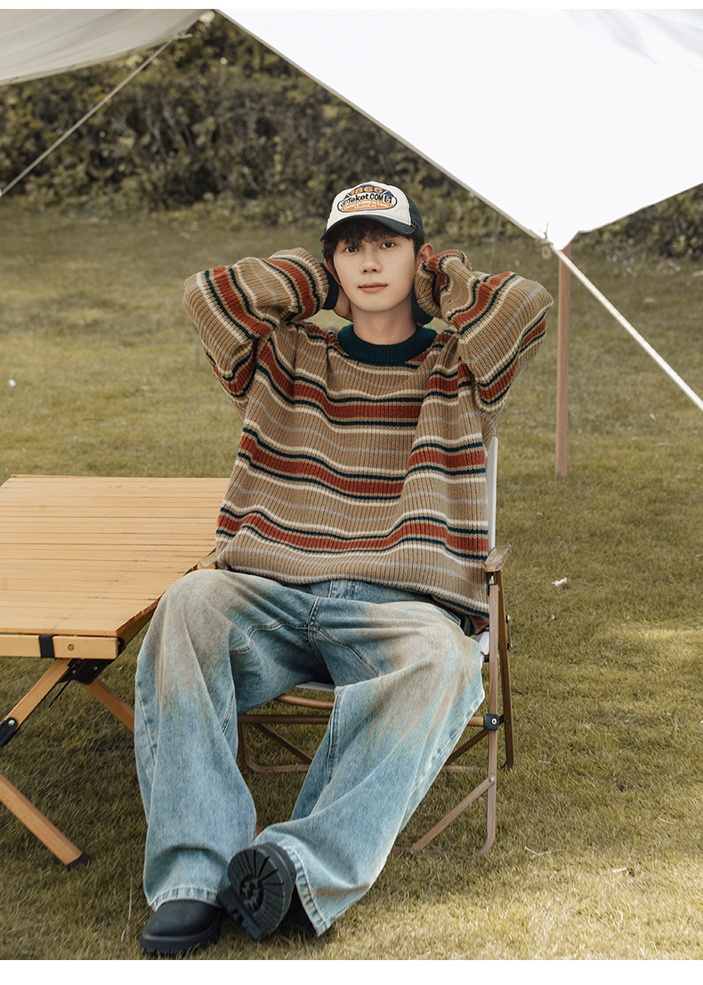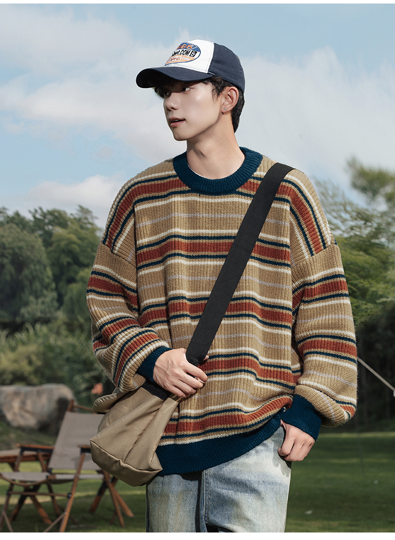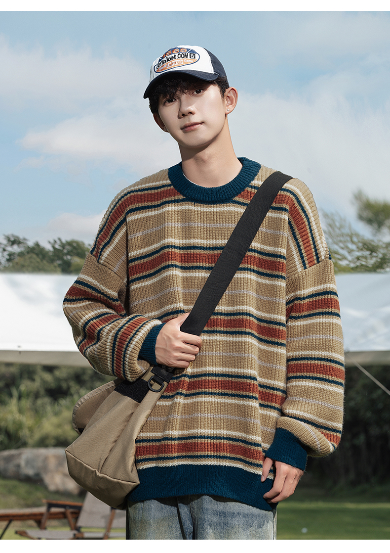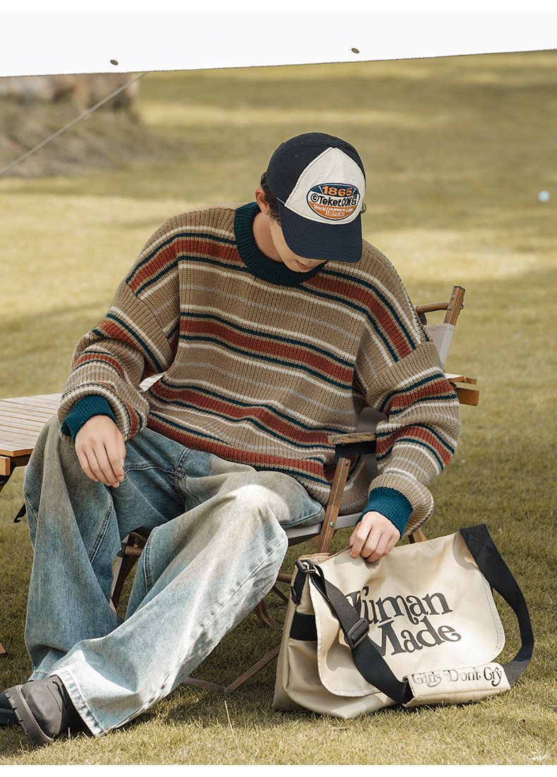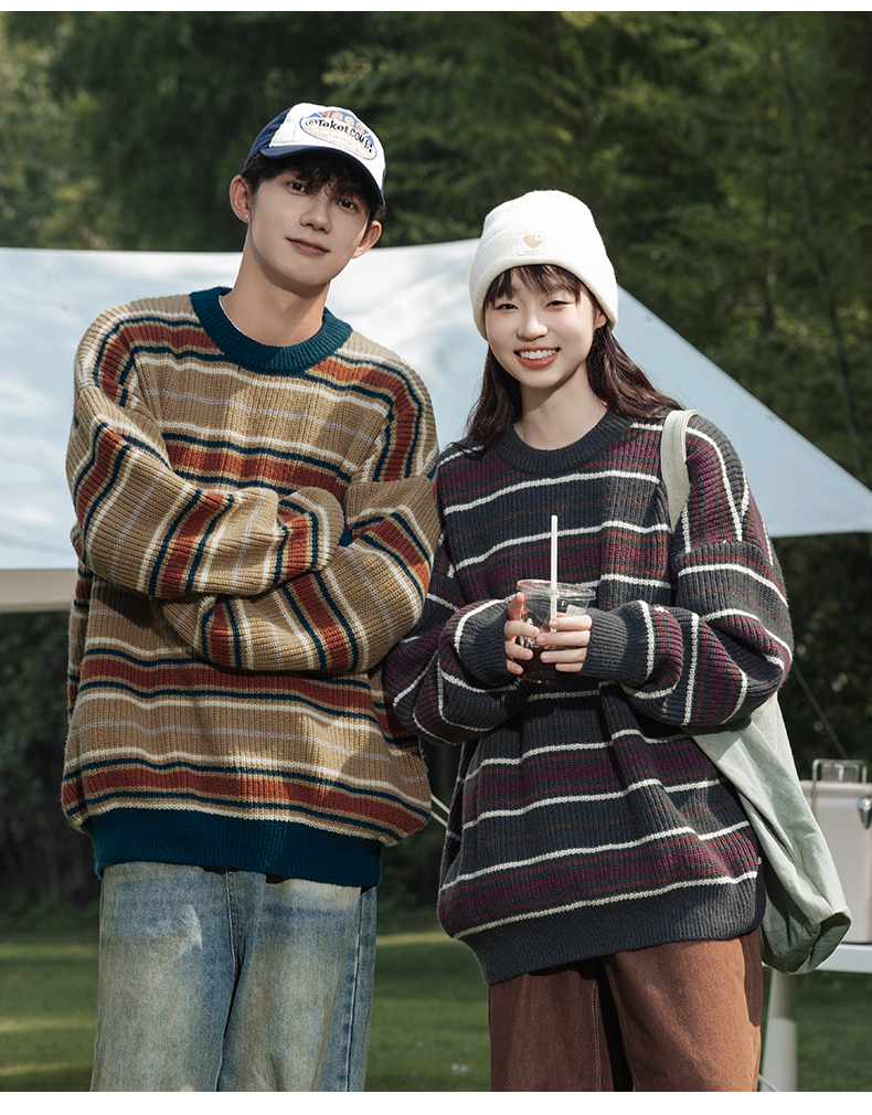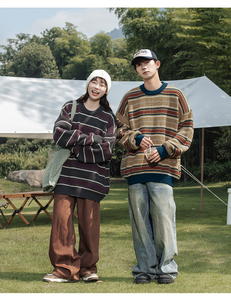 秋冬山系復古撞色條紋毛衣高街潮牌情侶上衣外套美式保暖針織衫男