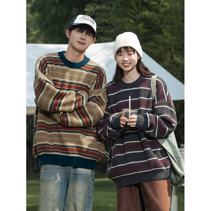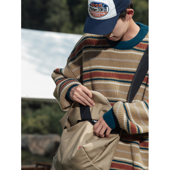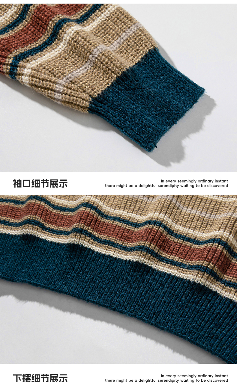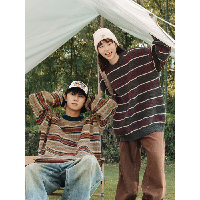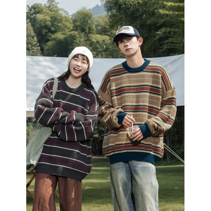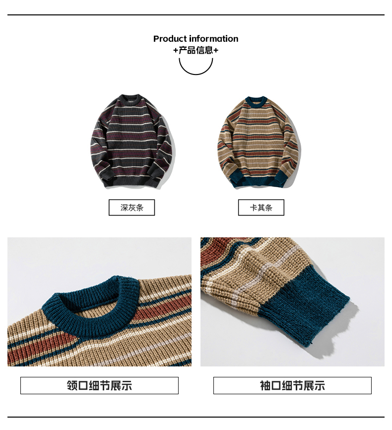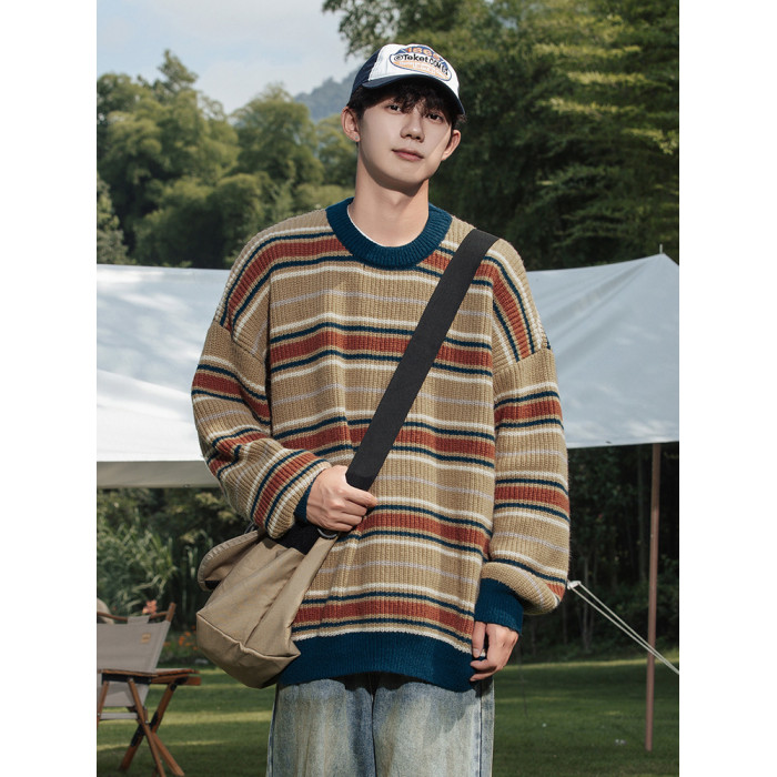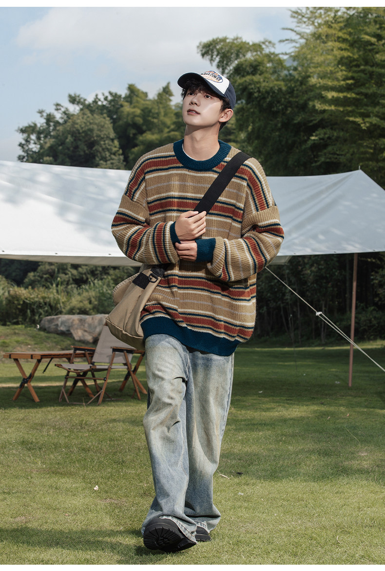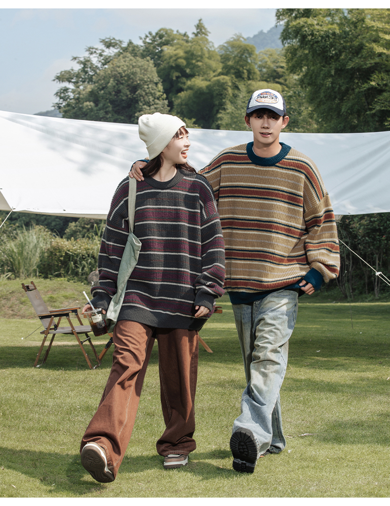 秋冬山系復古撞色條紋毛衣高街潮牌情侶上衣外套美式保暖針織衫男