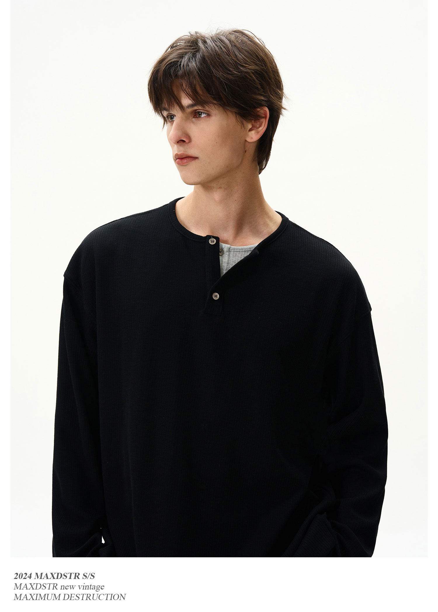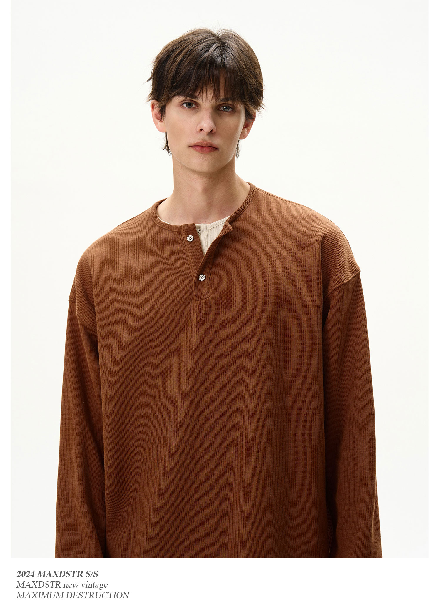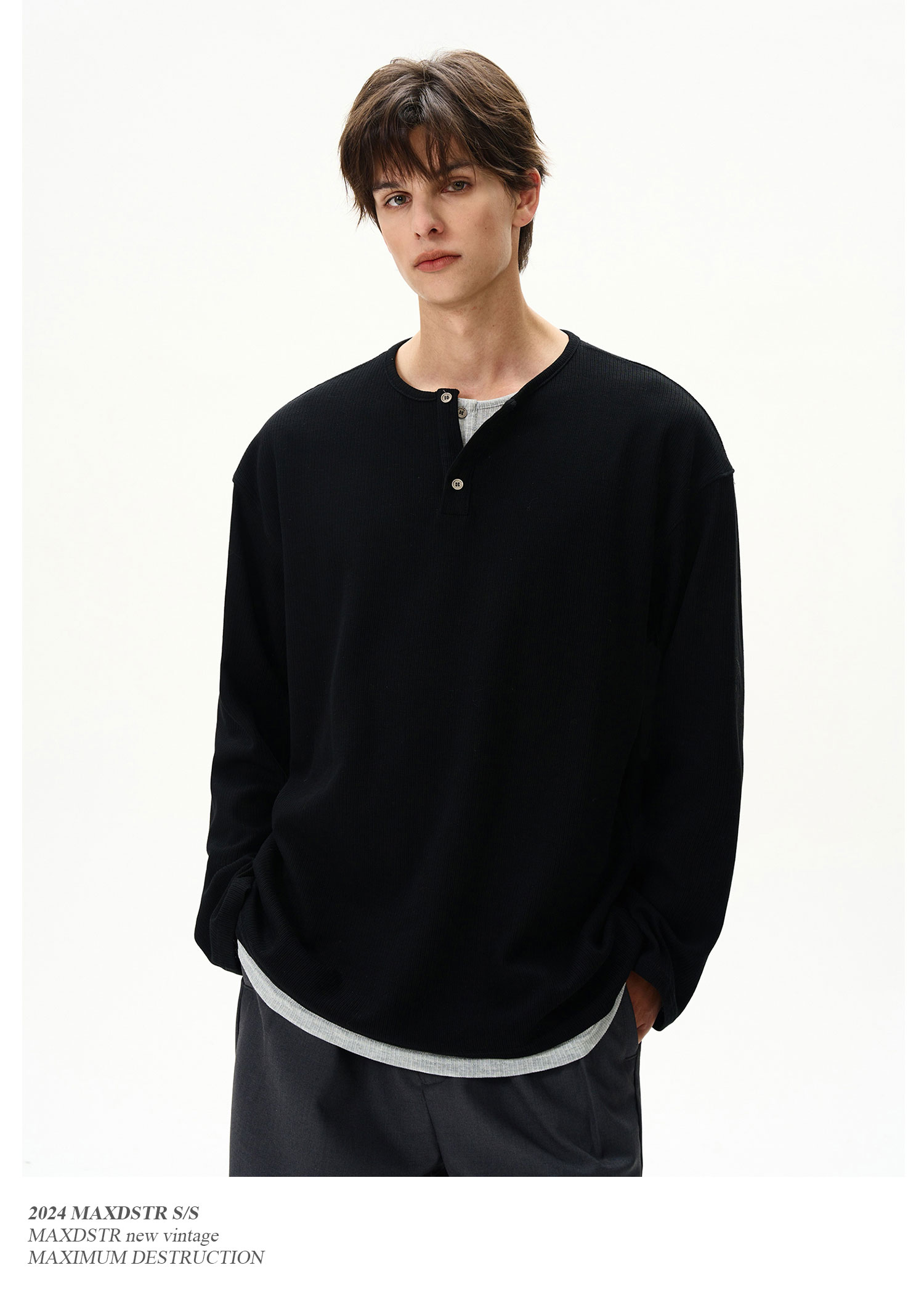 MaxDstr美式復古亨利領假兩件設計華夫格長袖T恤男女寬松純色上衣