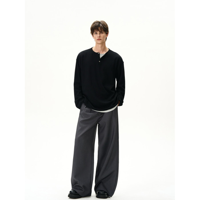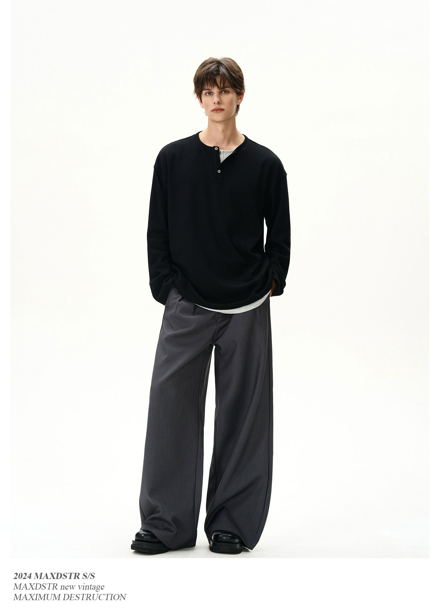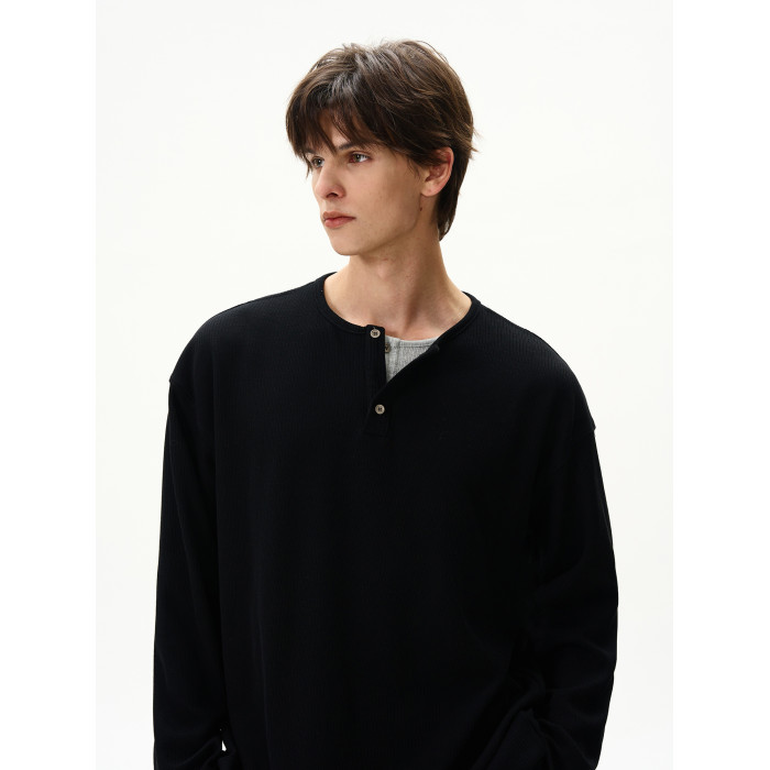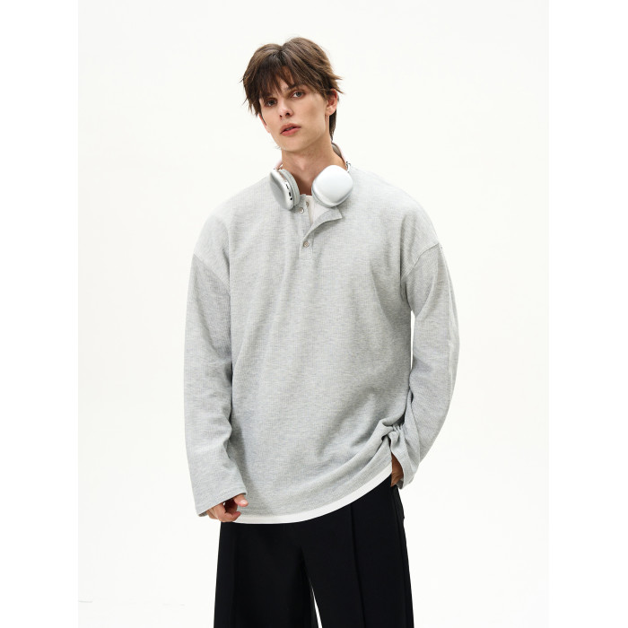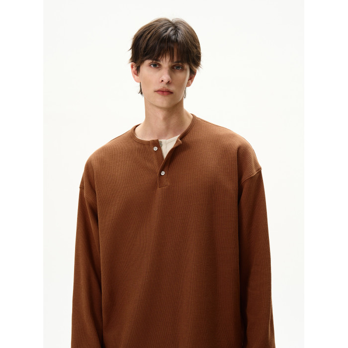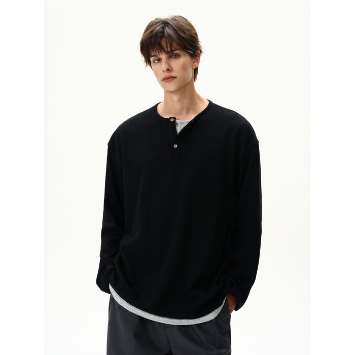 MaxDstr美式復古亨利領假兩件設計華夫格長袖T恤男女寬松純色上衣