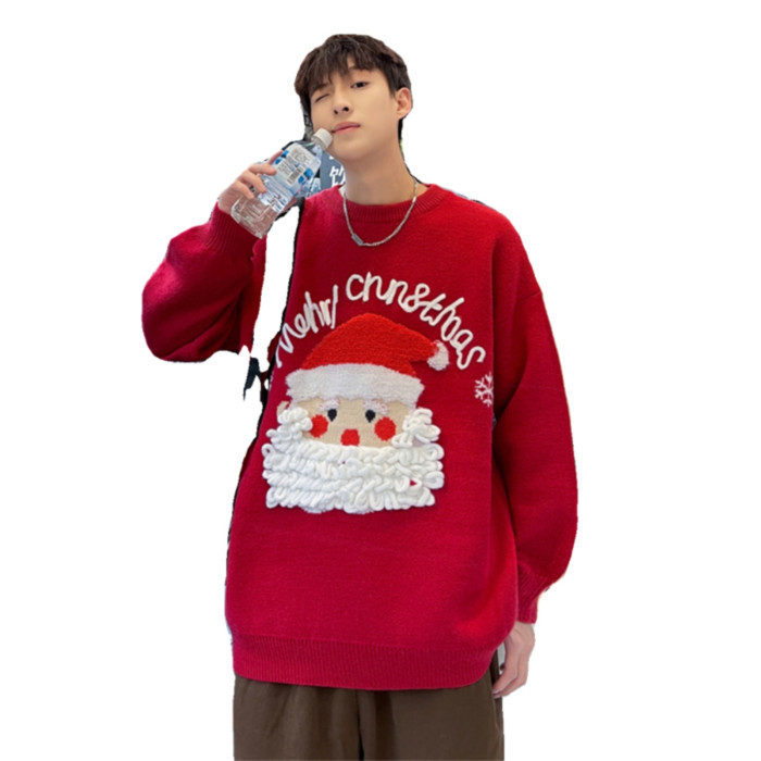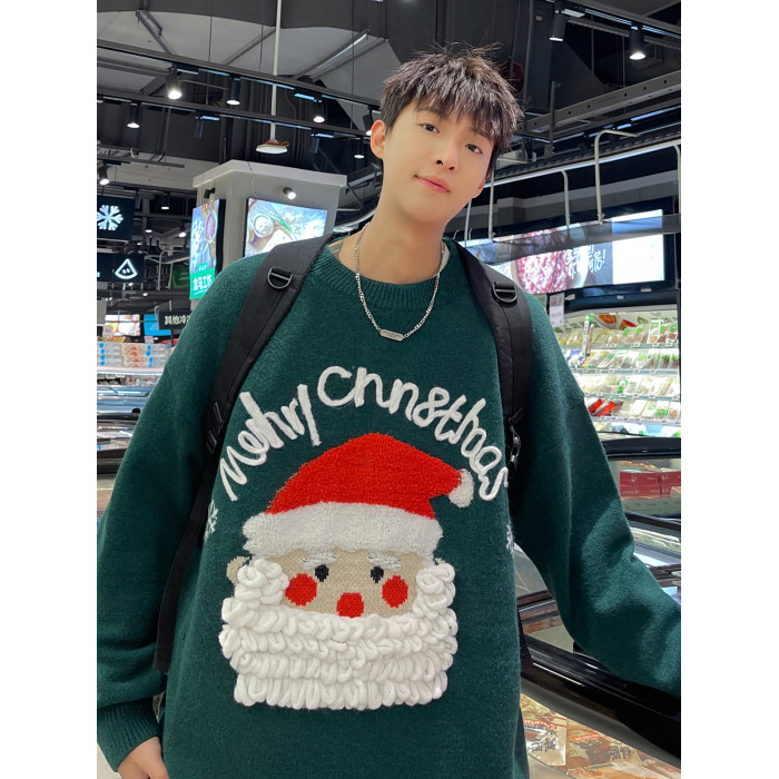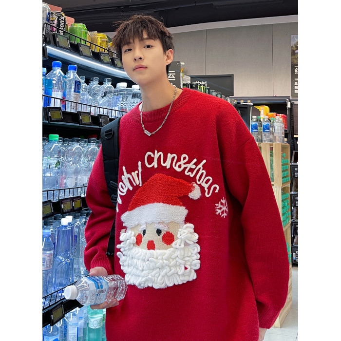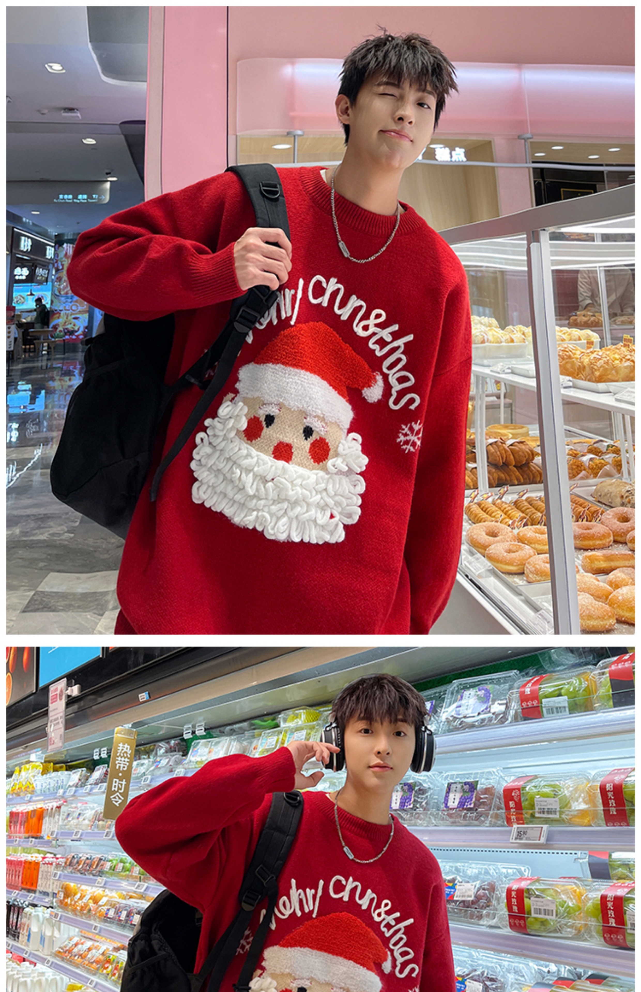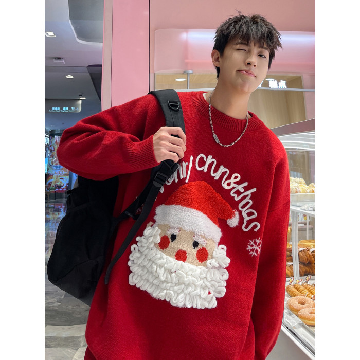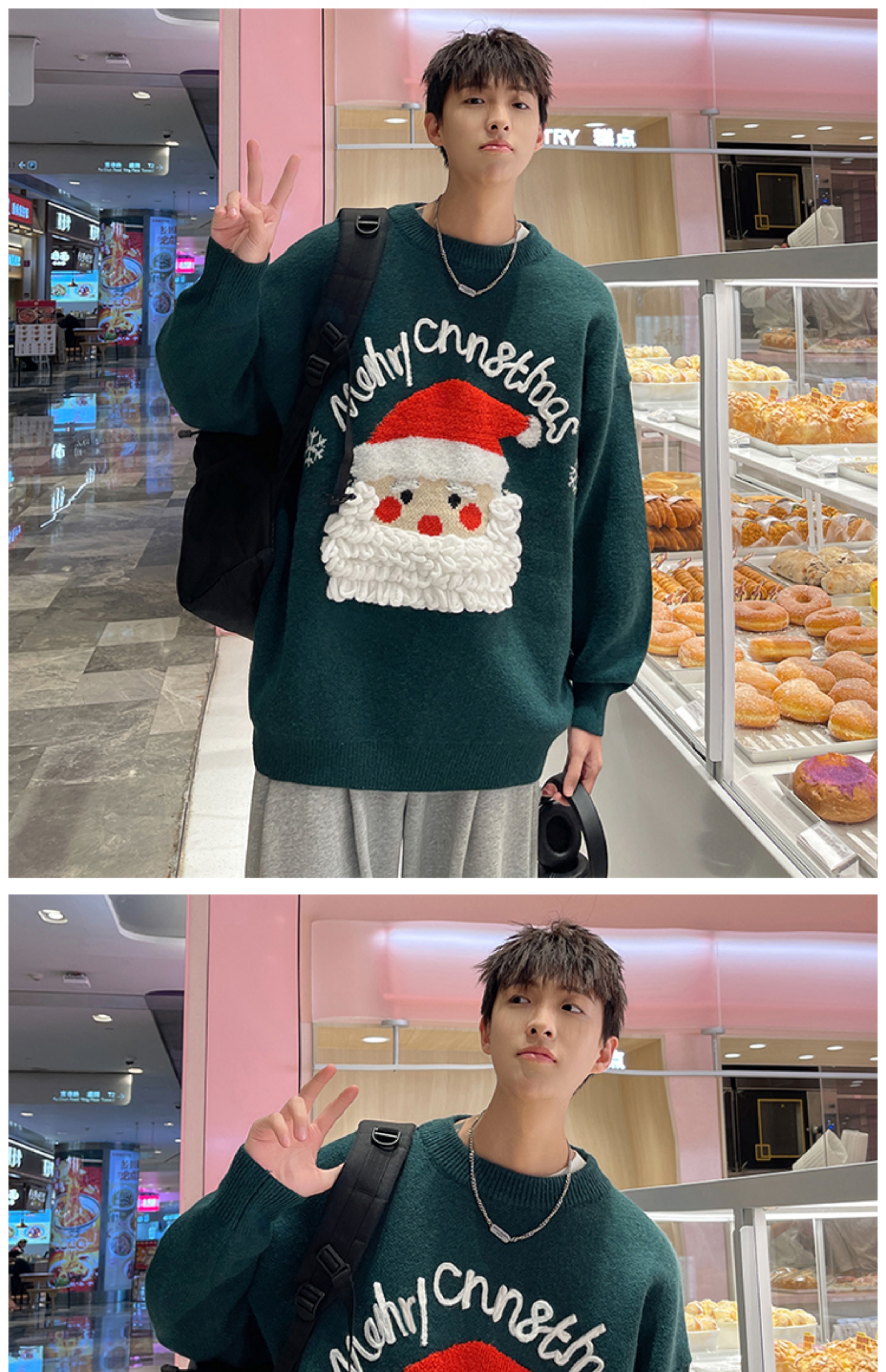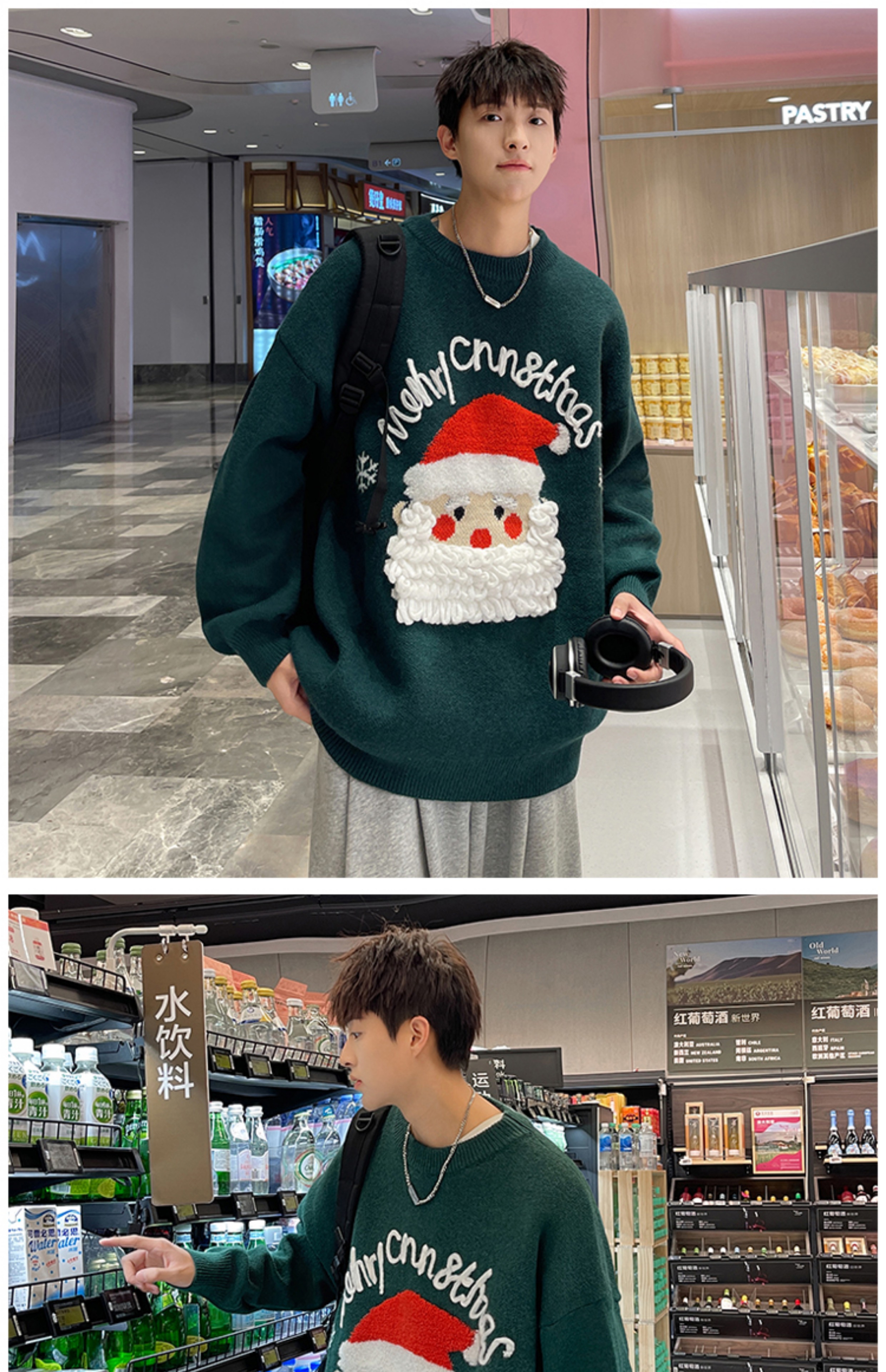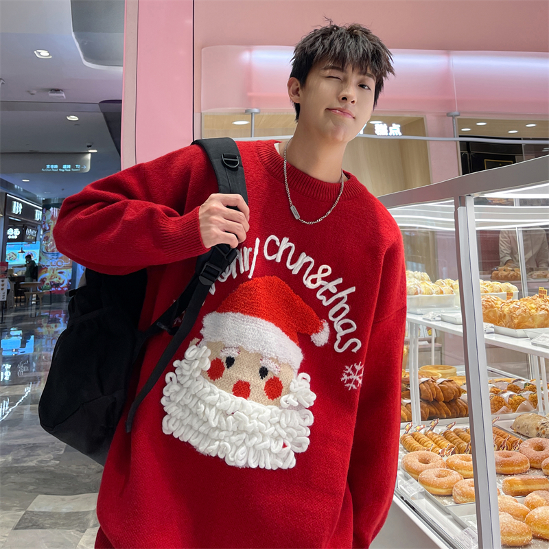 聖誕老人圓領毛衣男秋冬季美式ins潮牌情侶裝寬松百搭休閒針織衫