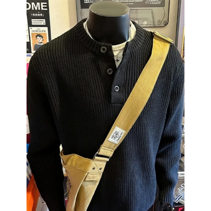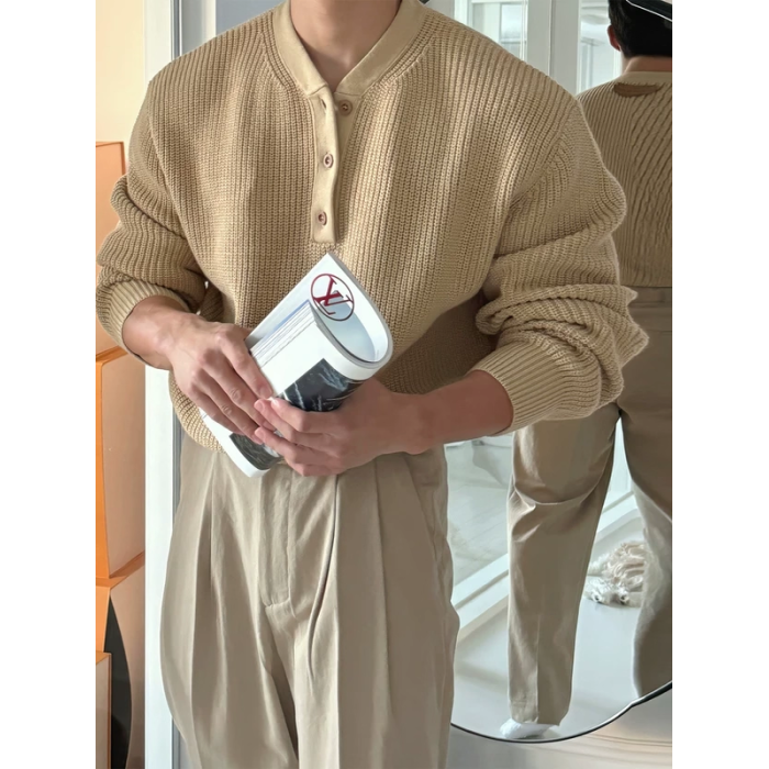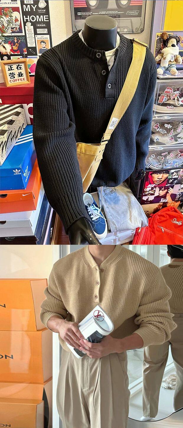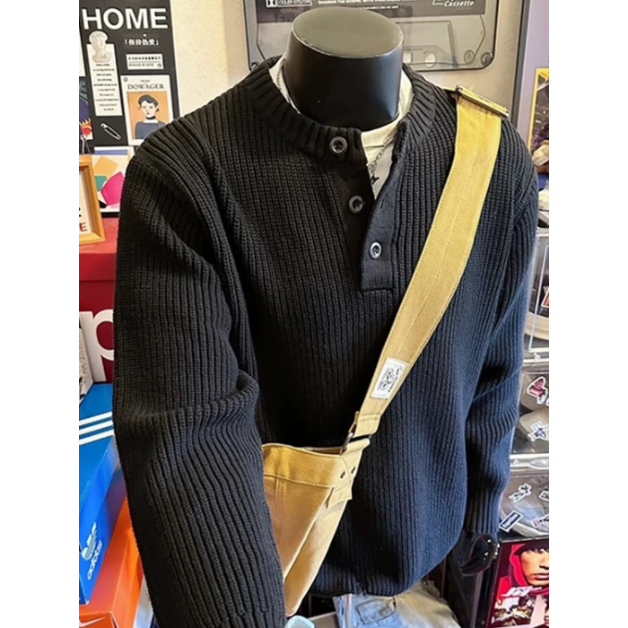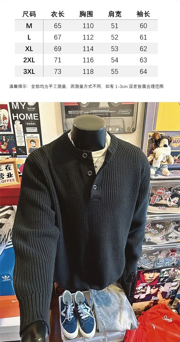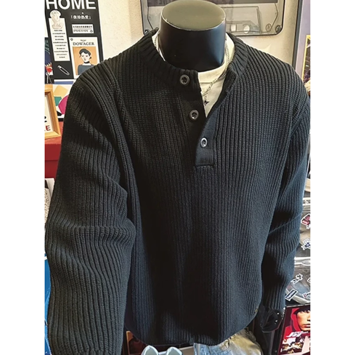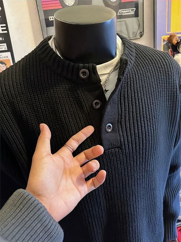 歐洲站針織亨利衫男半開釦寬松長袖衛衣坑條紋門襟領針織衫外套潮