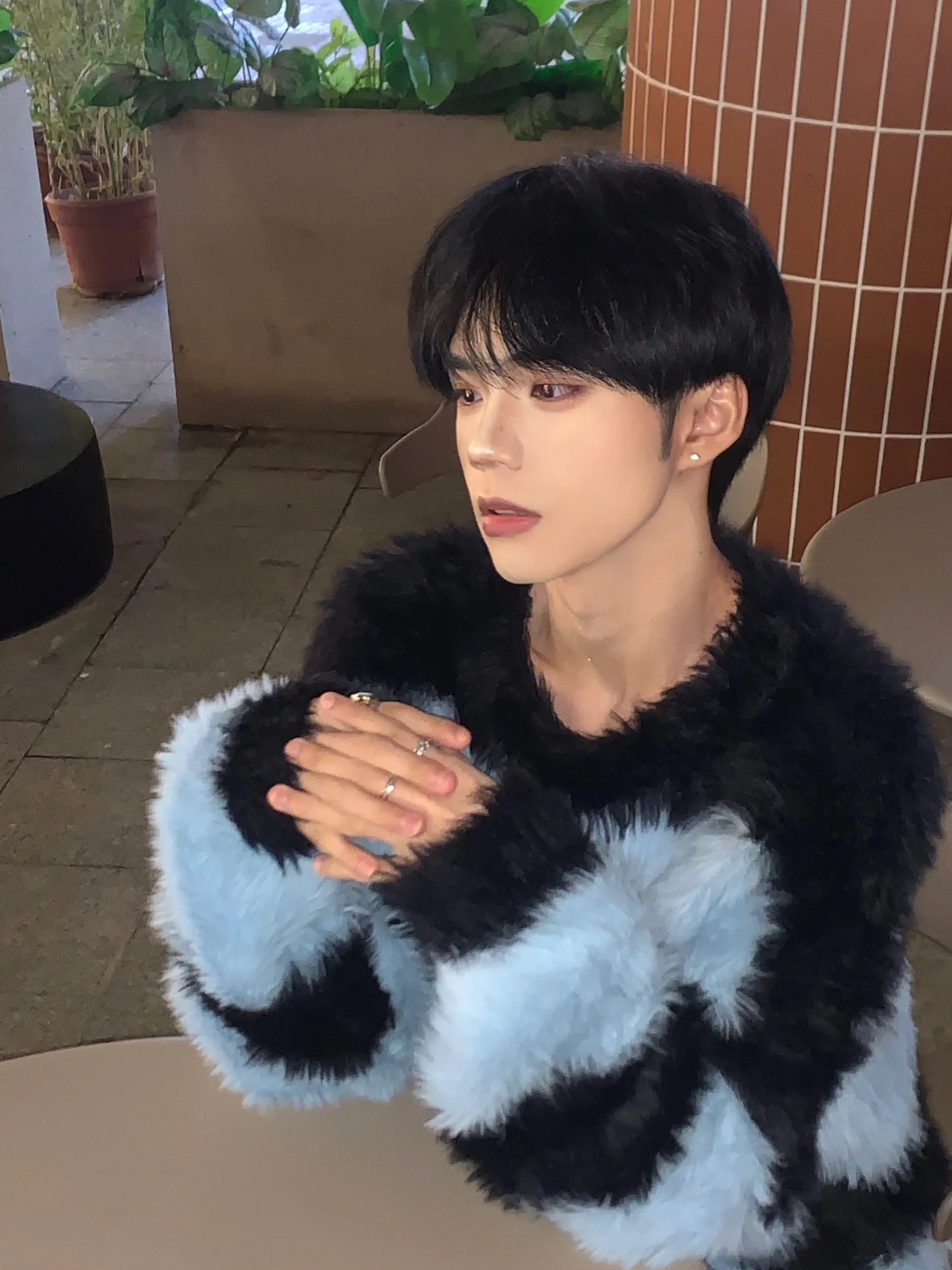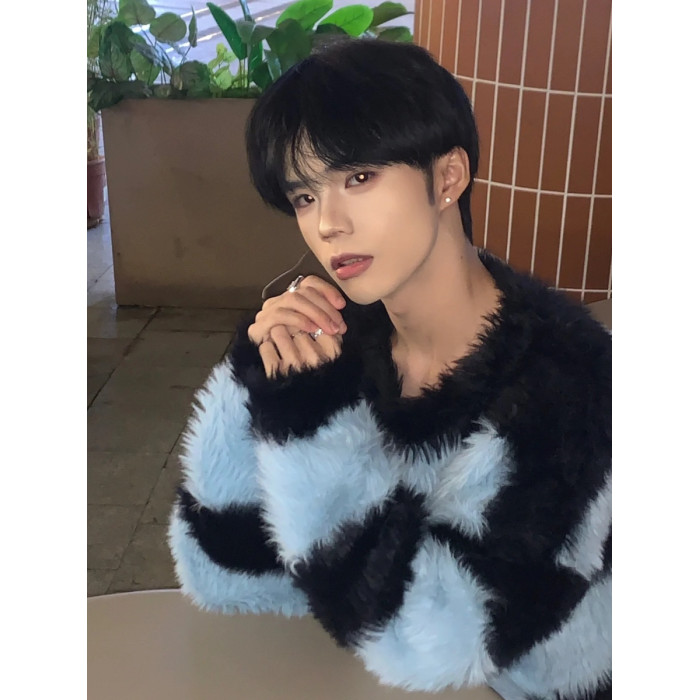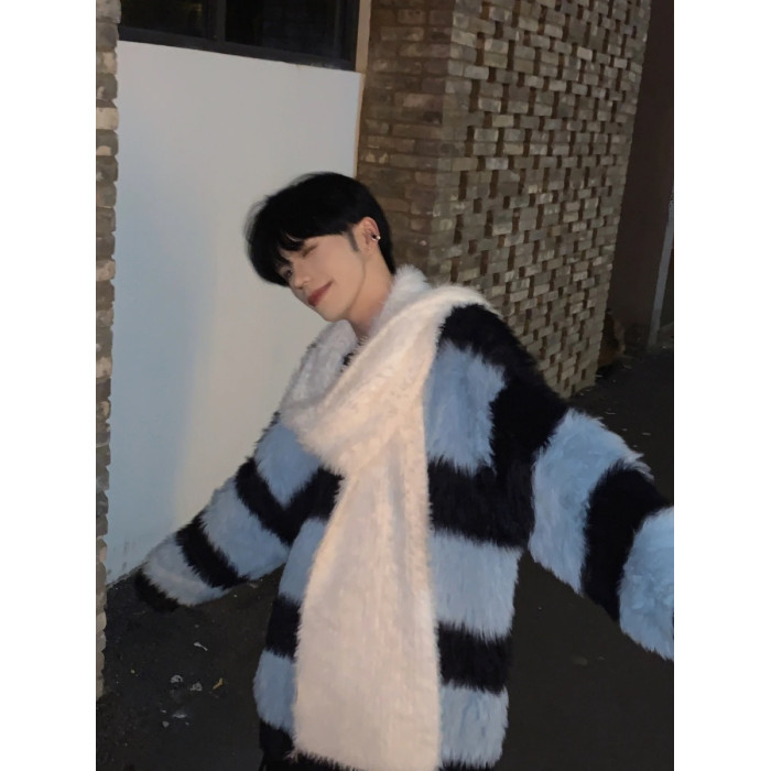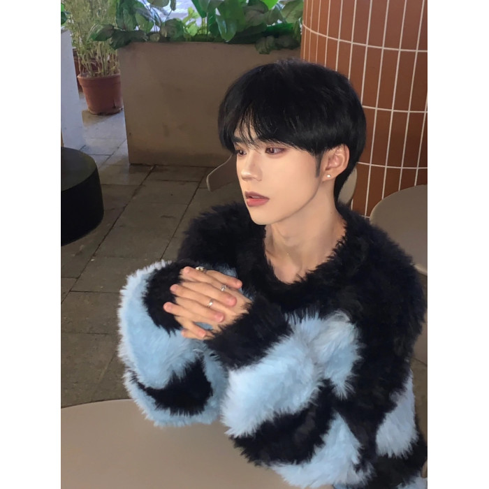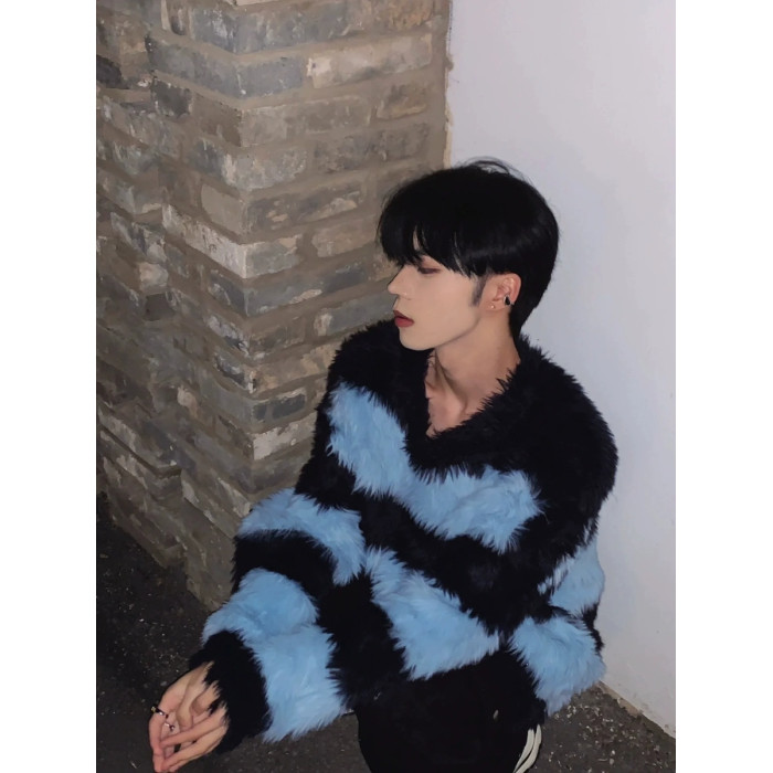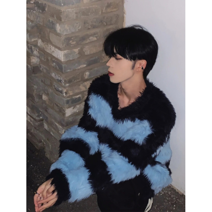 條紋撞色馬海毛毛衣男秋冬美式復古慵懶針織衫潮牌毛茸茸圓領外套