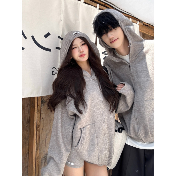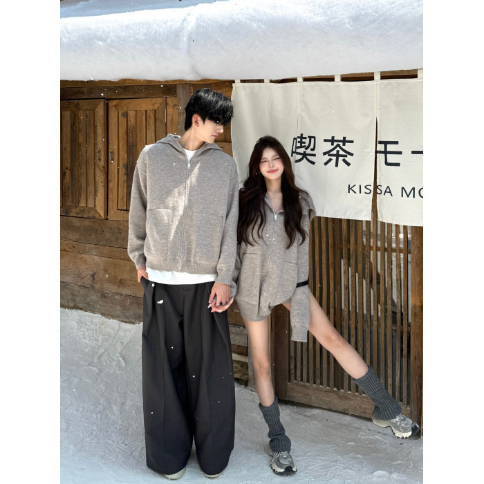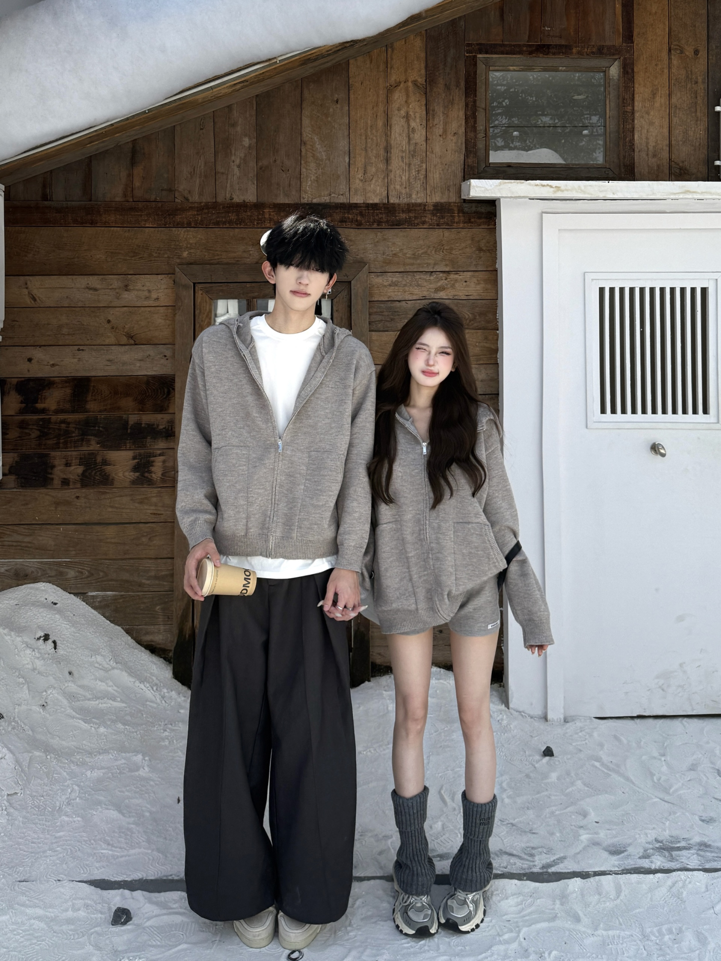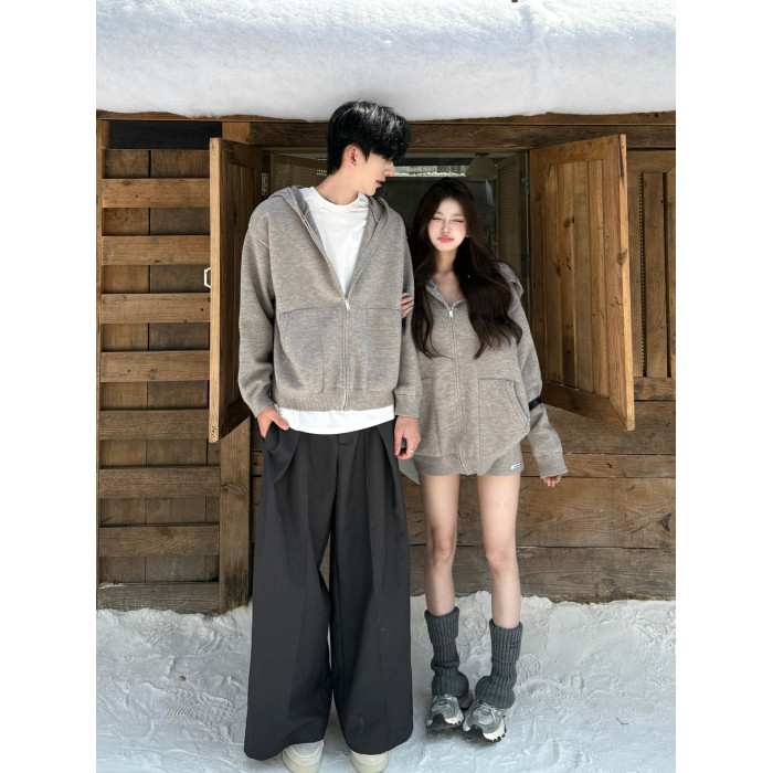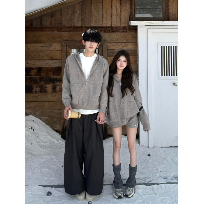 美式灰色連帽毛衣男女秋冬季慵懶顯瘦短褲兩件套針織開衫拉鍊套裝