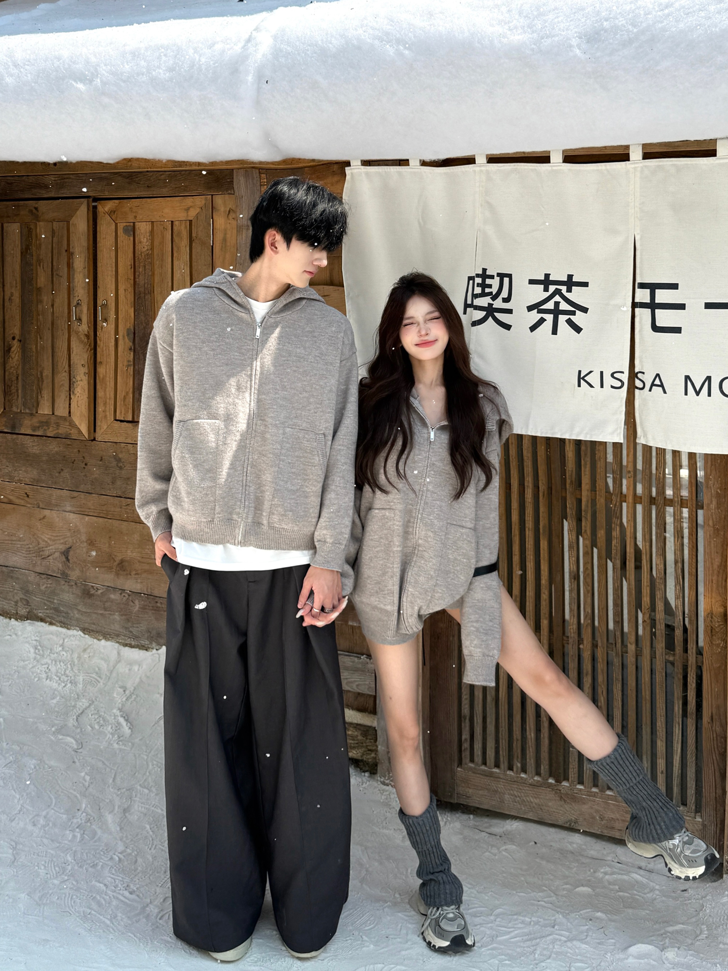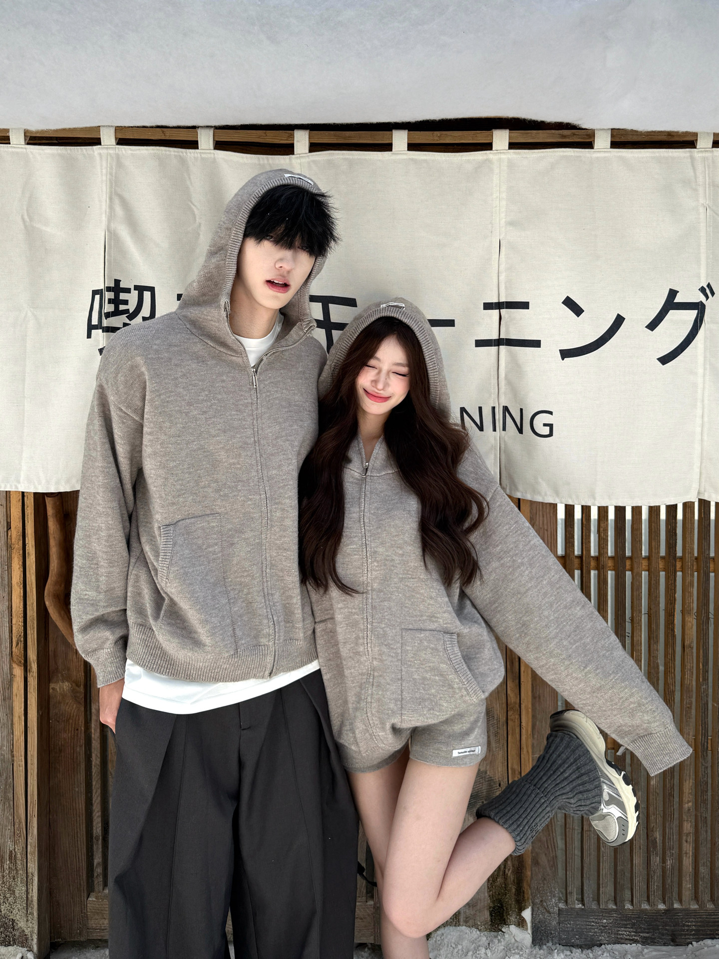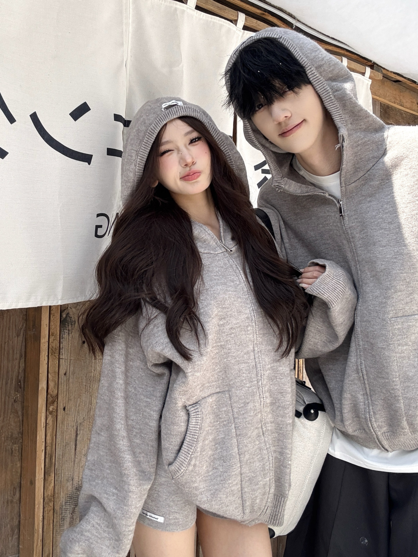 美式灰色連帽毛衣男女秋冬季慵懶顯瘦短褲兩件套針織開衫拉鍊套裝
