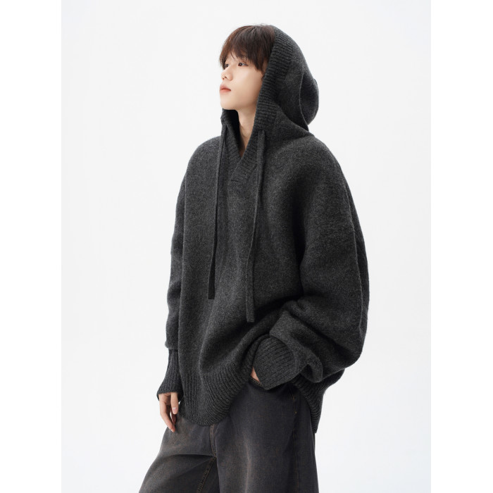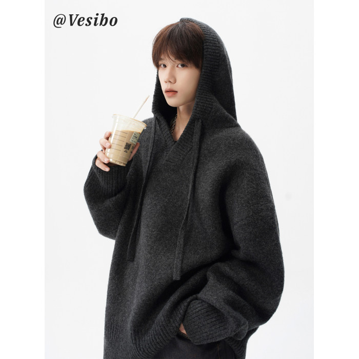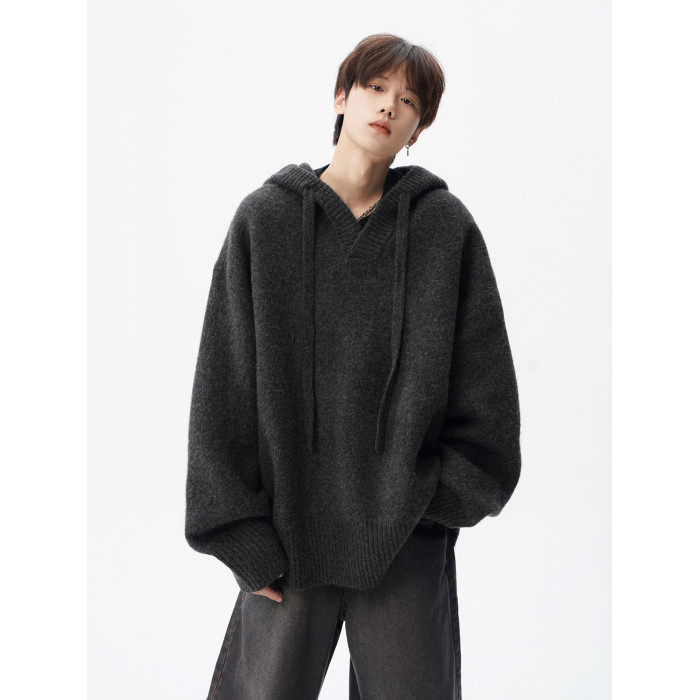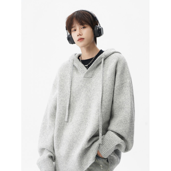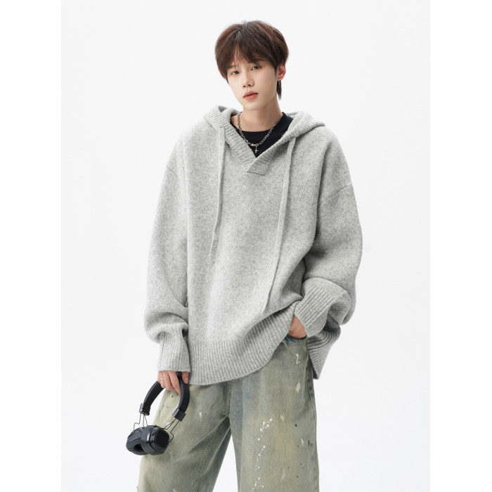 美式cleanfit針織套頭衫男冬潮牌慵懶風連帽毛衣寬松復古情侶線衣