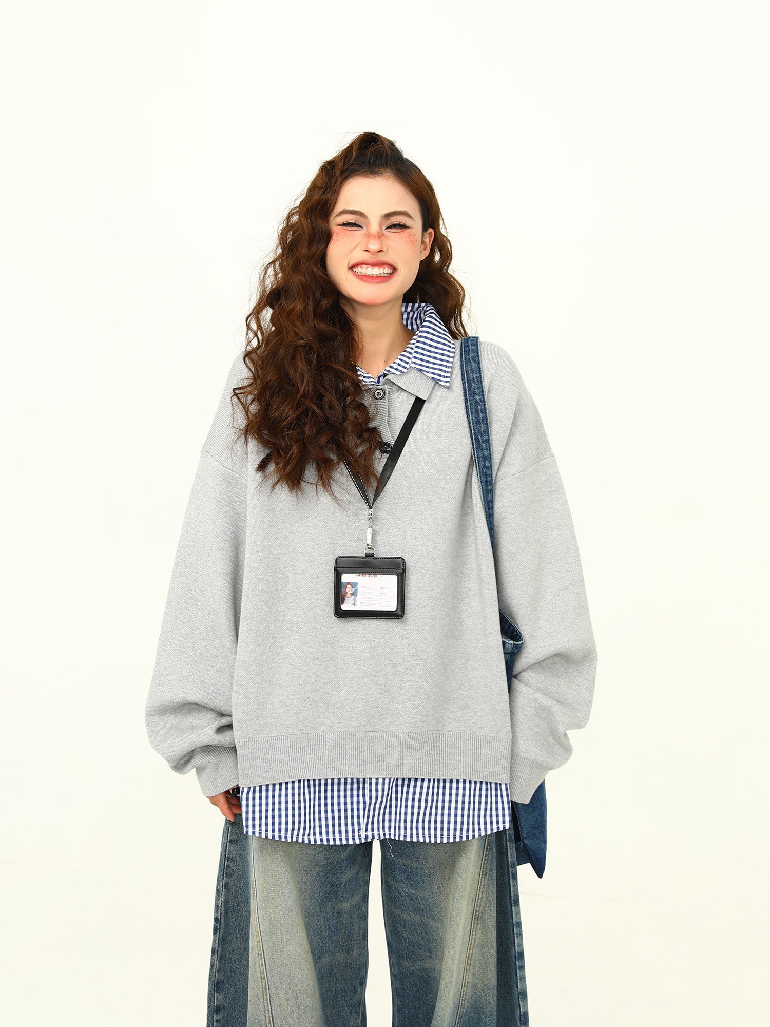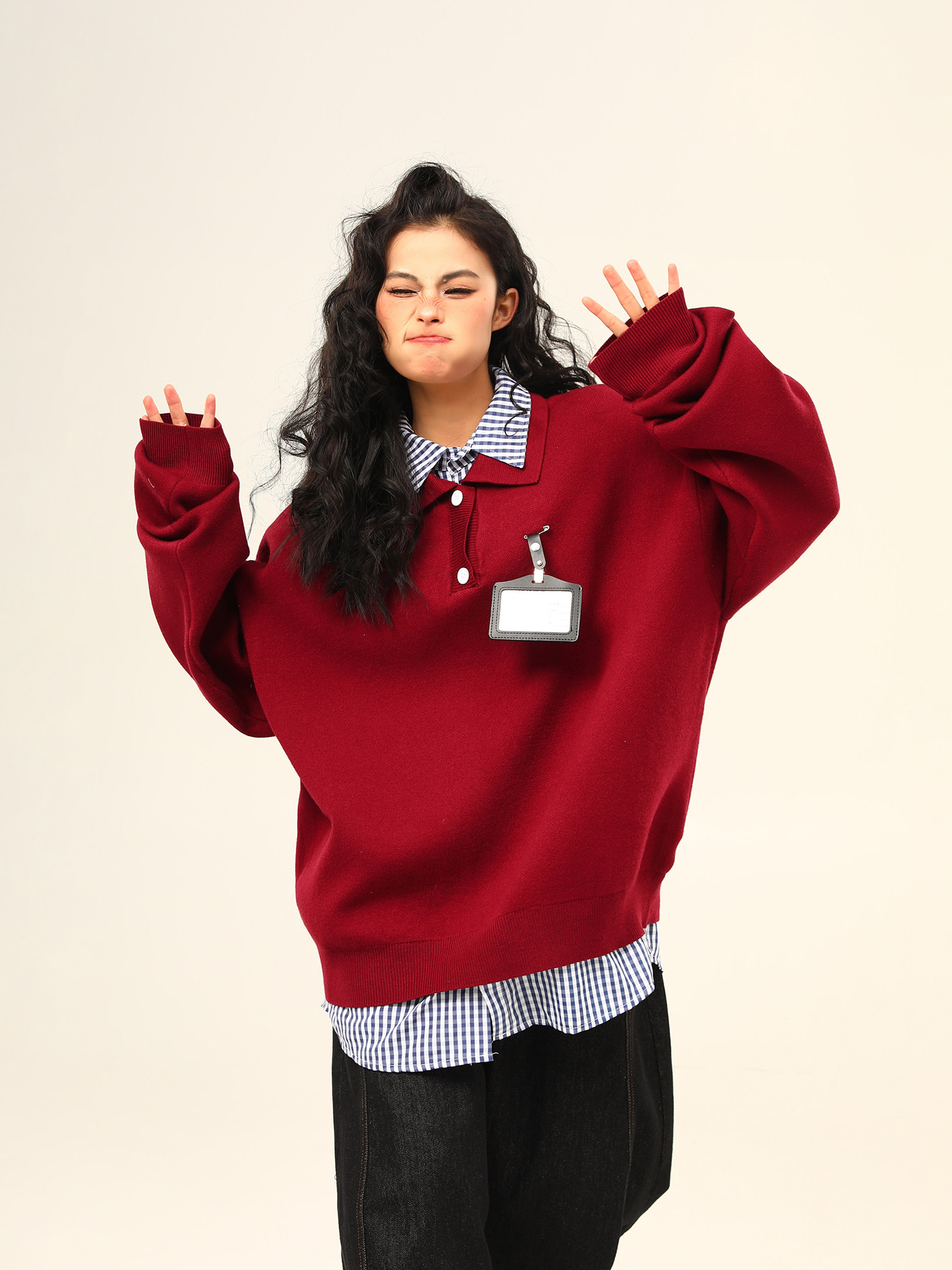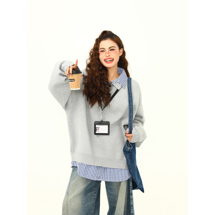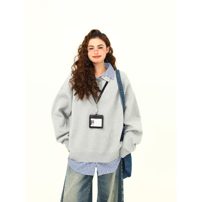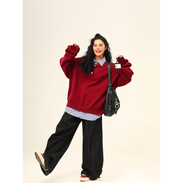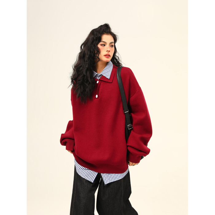 野生阿子美式復古高級感假兩件繙領學院風毛衣女春秋百搭針織衫潮