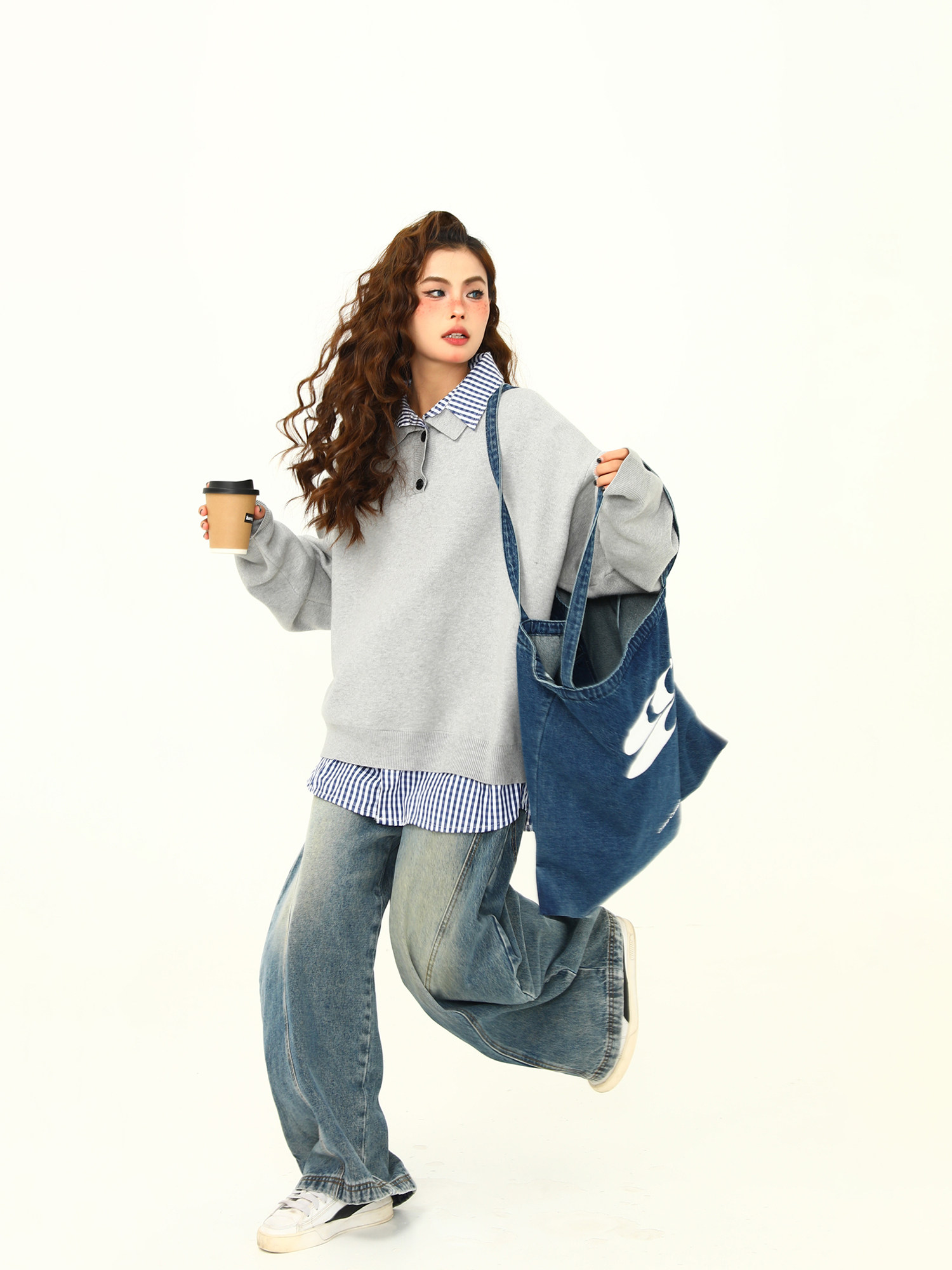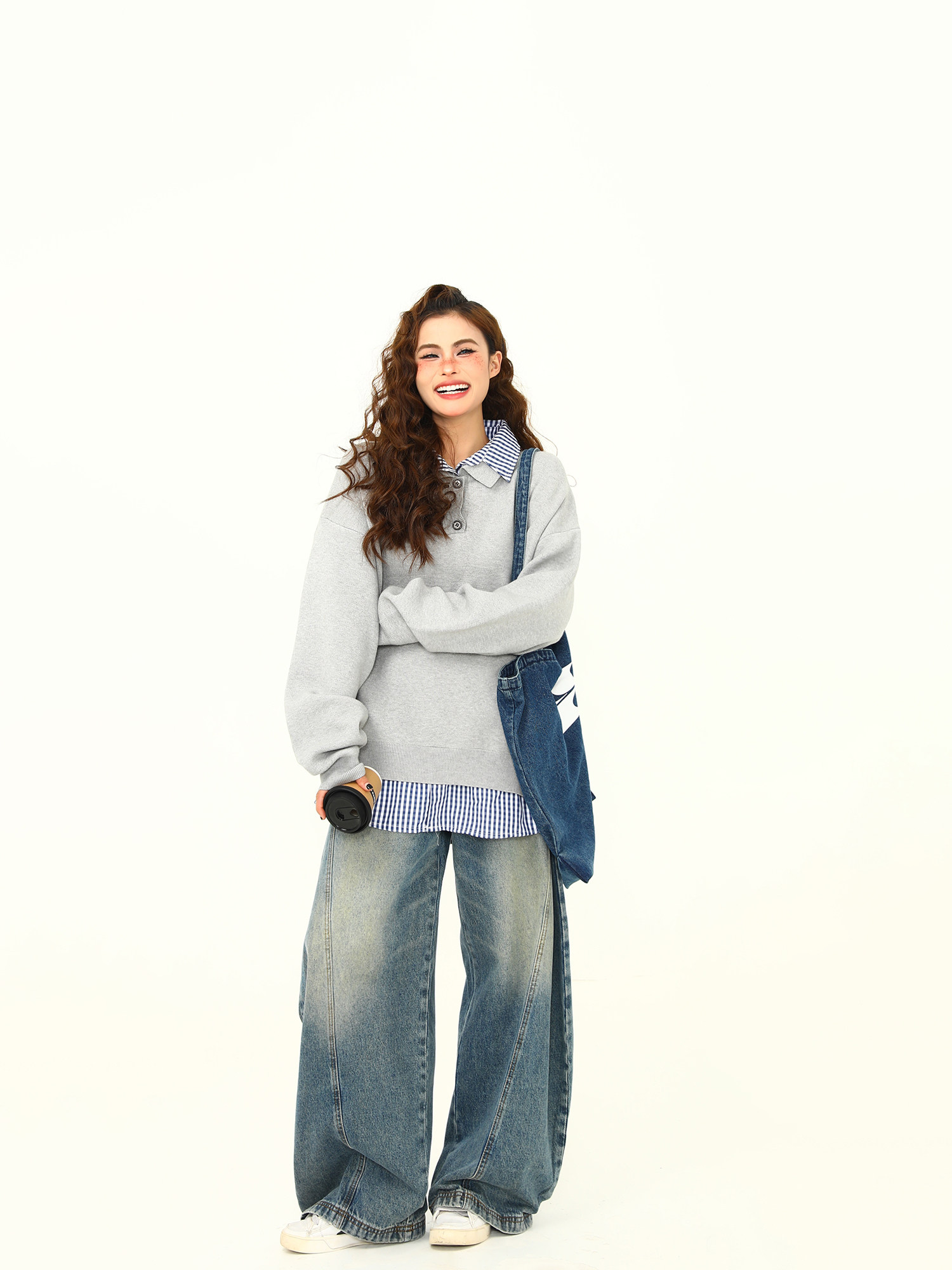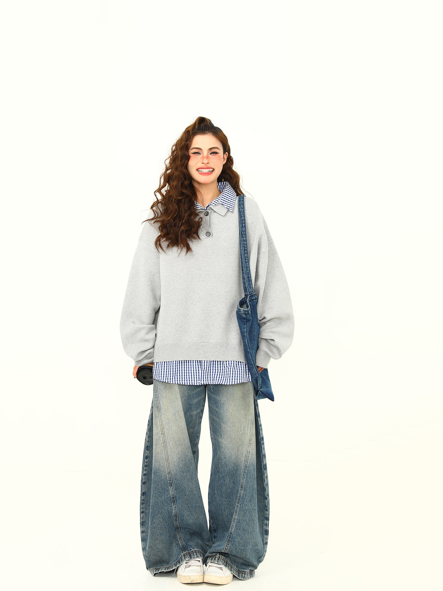 野生阿子美式復古高級感假兩件繙領學院風毛衣女春秋百搭針織衫潮