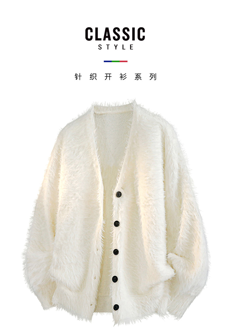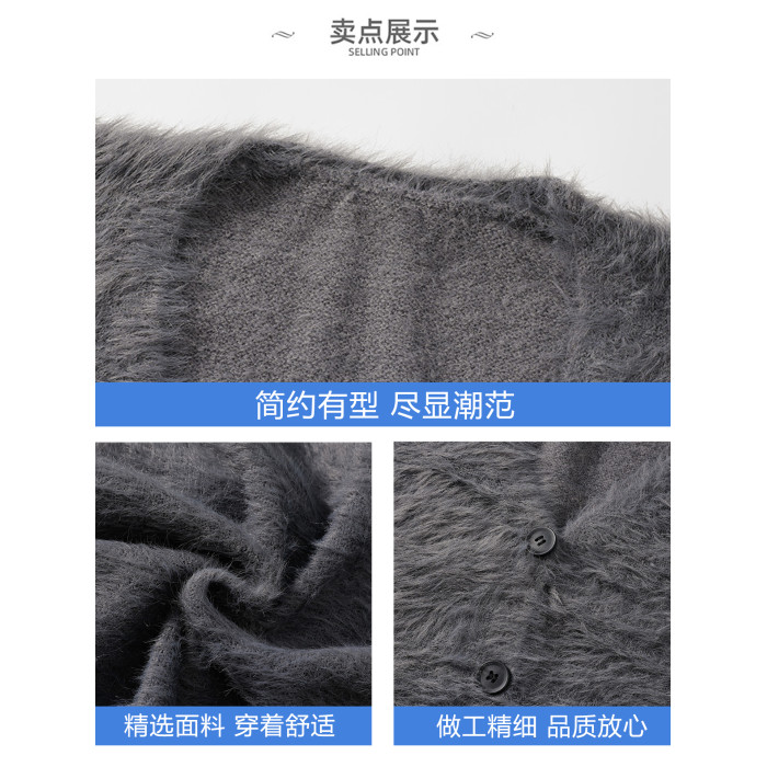 WASSUP ISSUE慵懶風灰色V領仿貂絨針織開衫男春秋寬松毛衣外套女