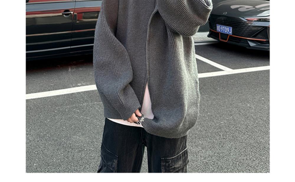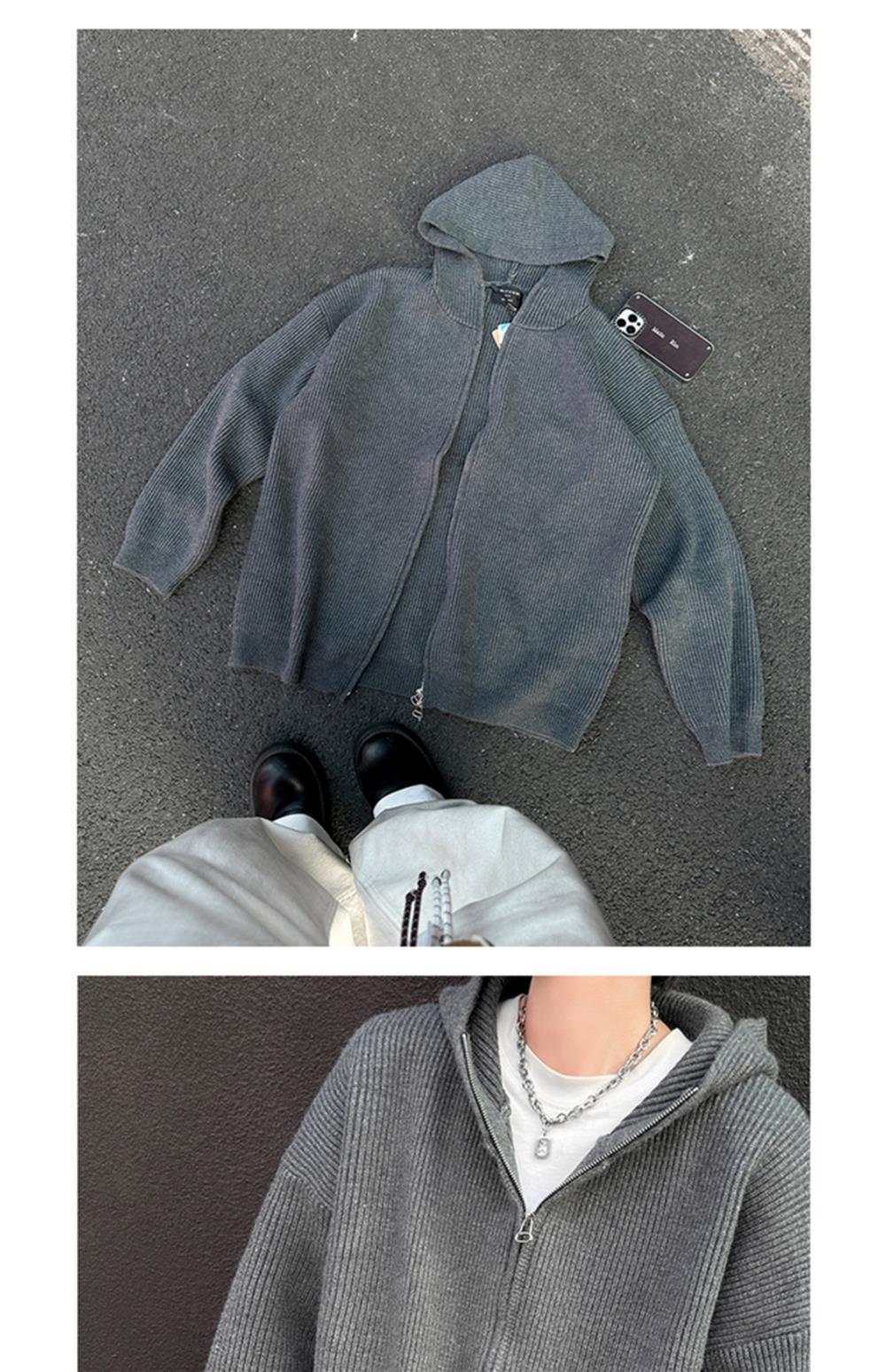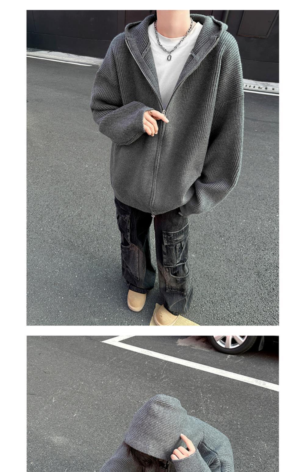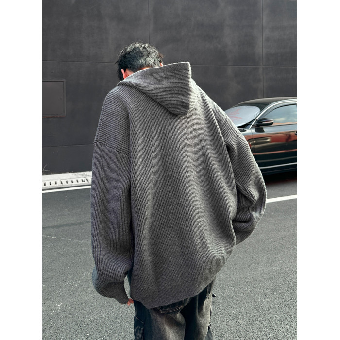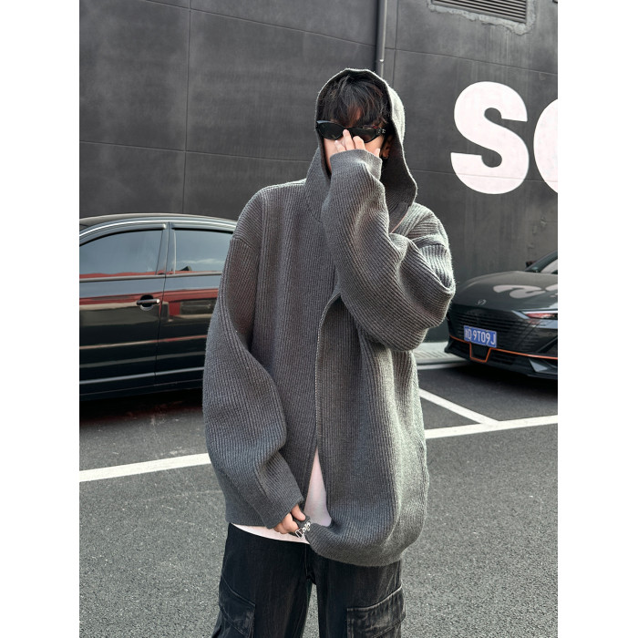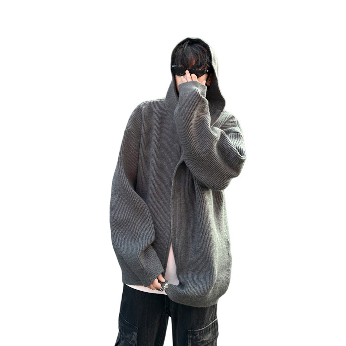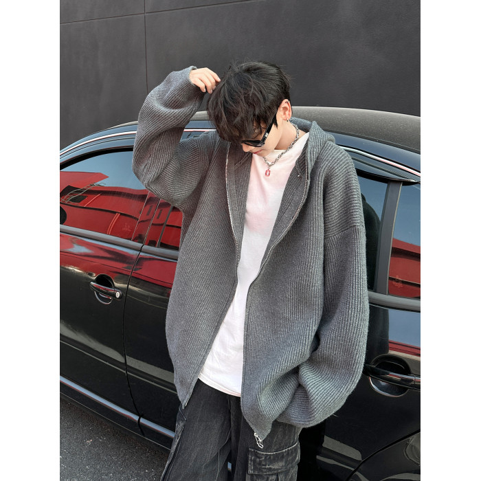 格雷系灰色極簡慵懶連帽開衫毛衣男秋季復古高級感寬松針織衫外套