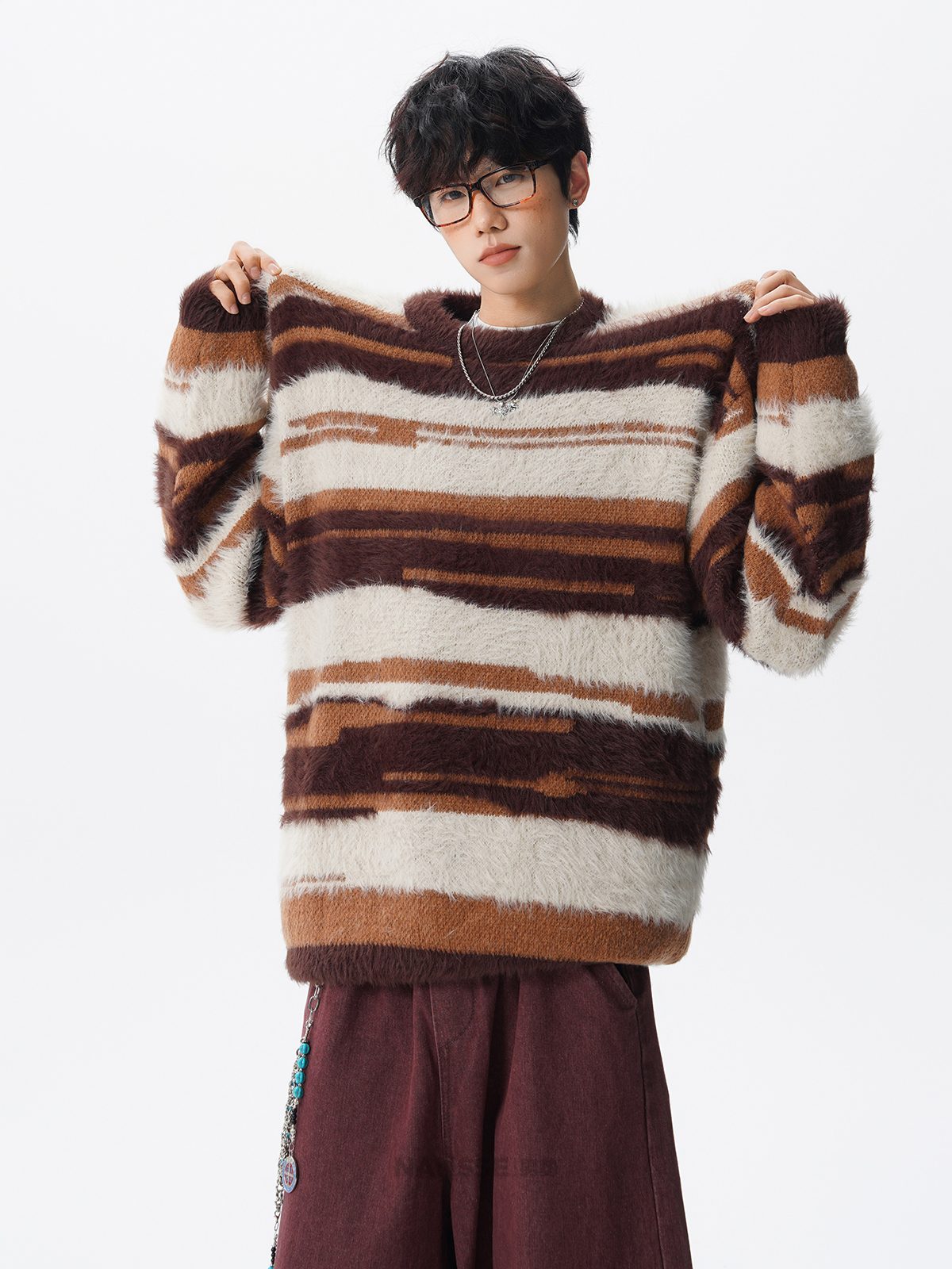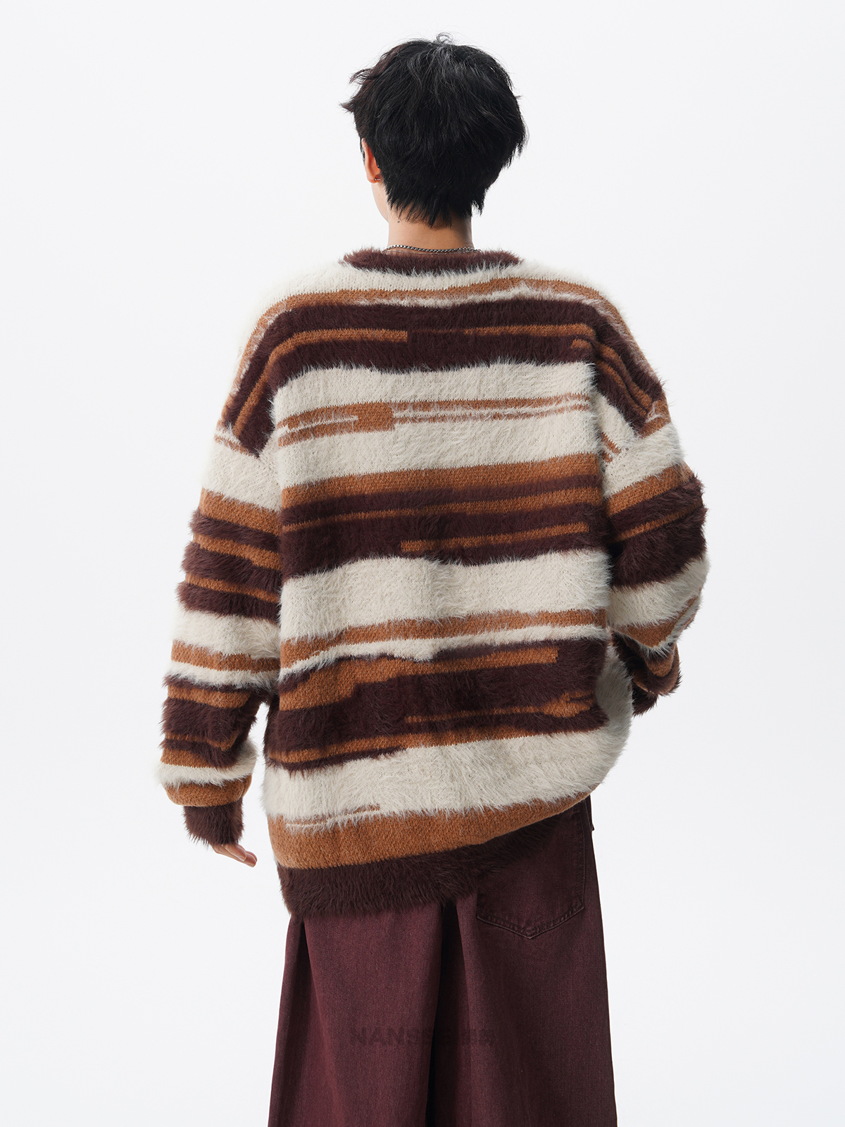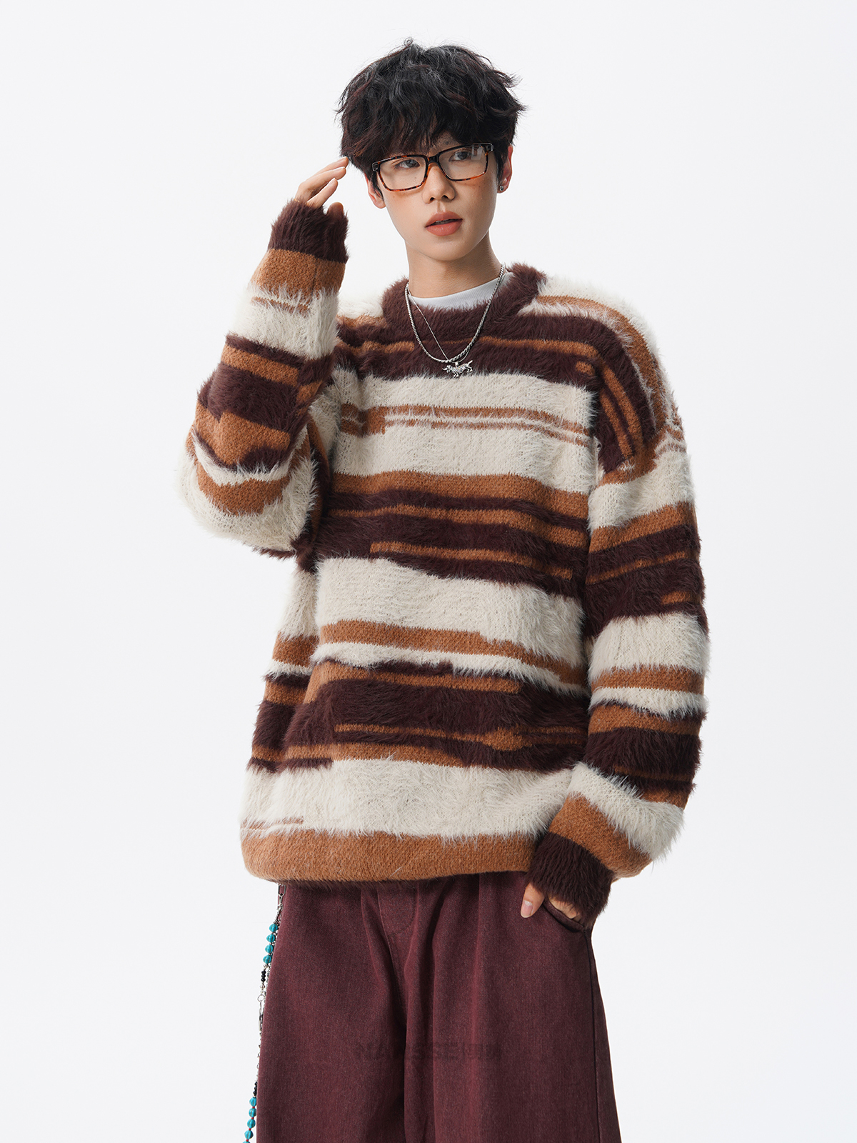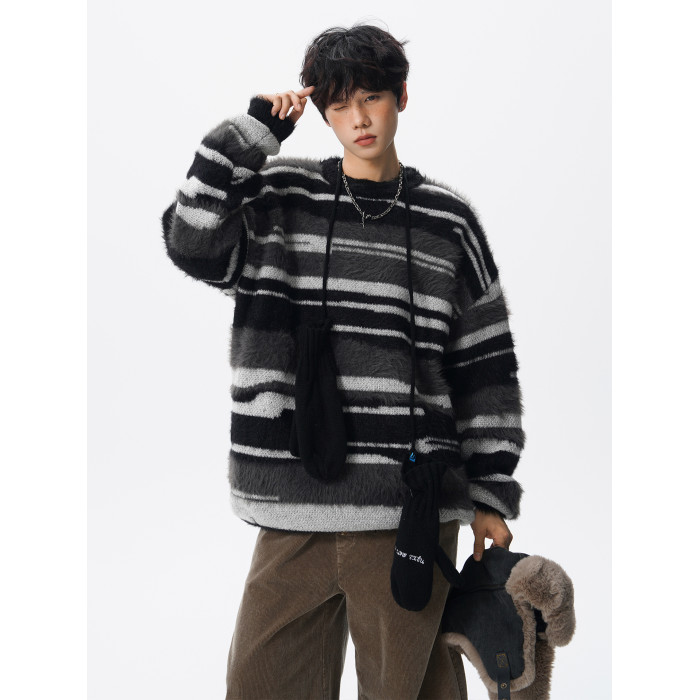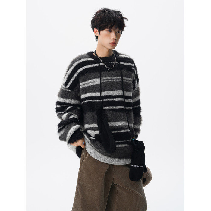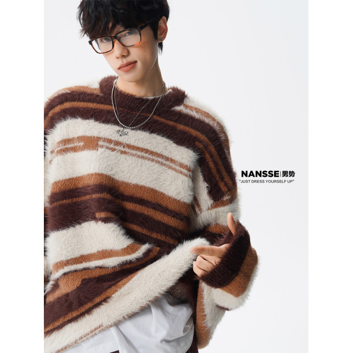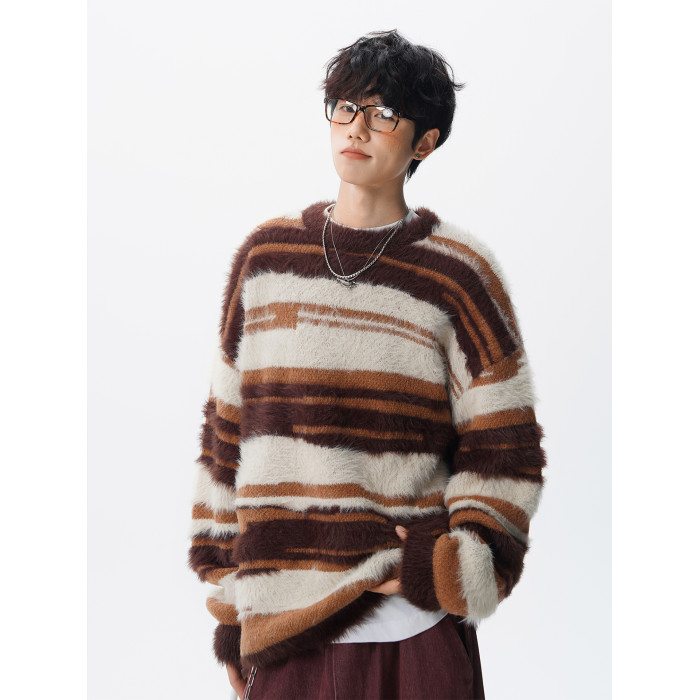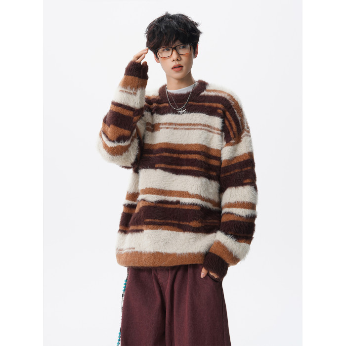 美式馬海毛圓領套頭毛衣男秋冬季新款潮牌寬松慵懶漸變撞色針織衫