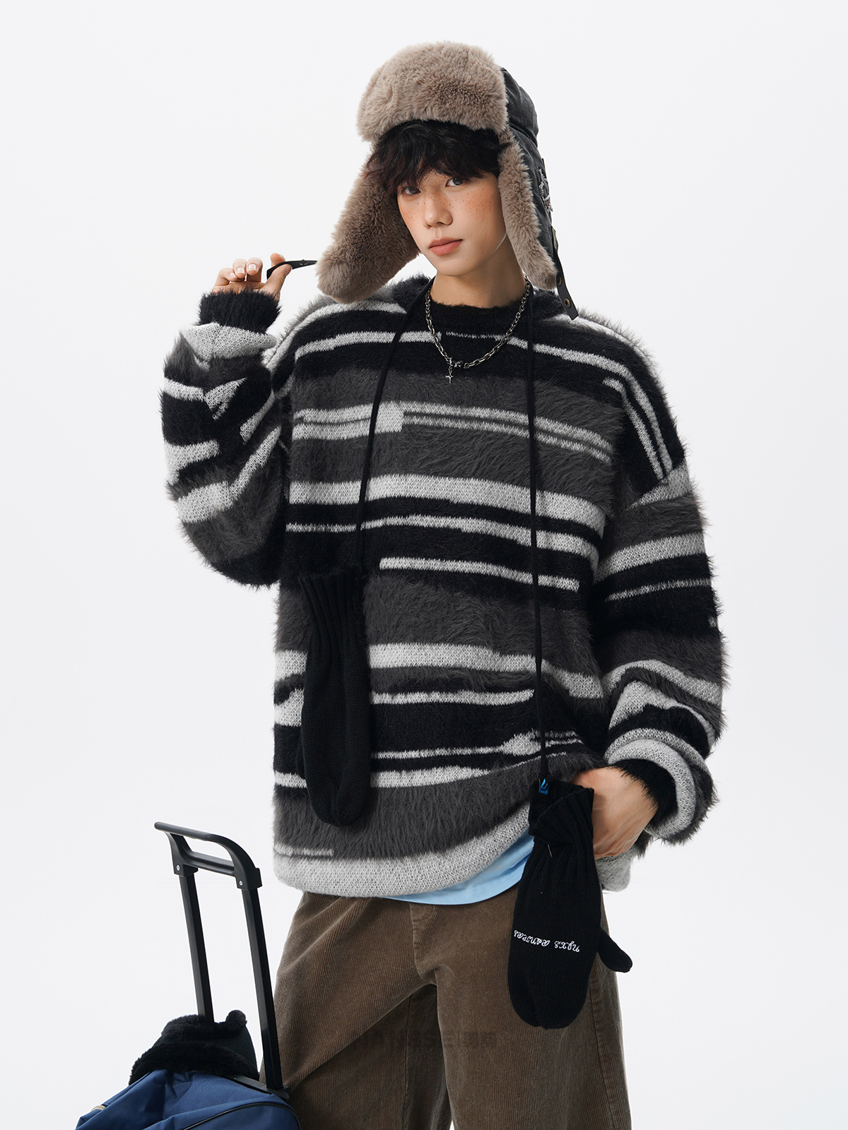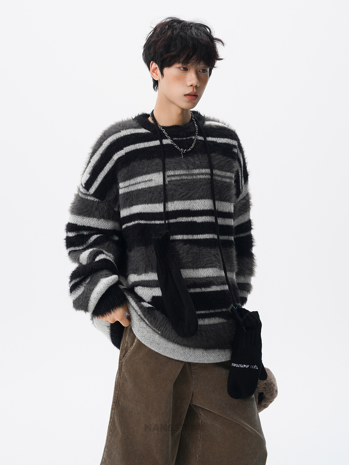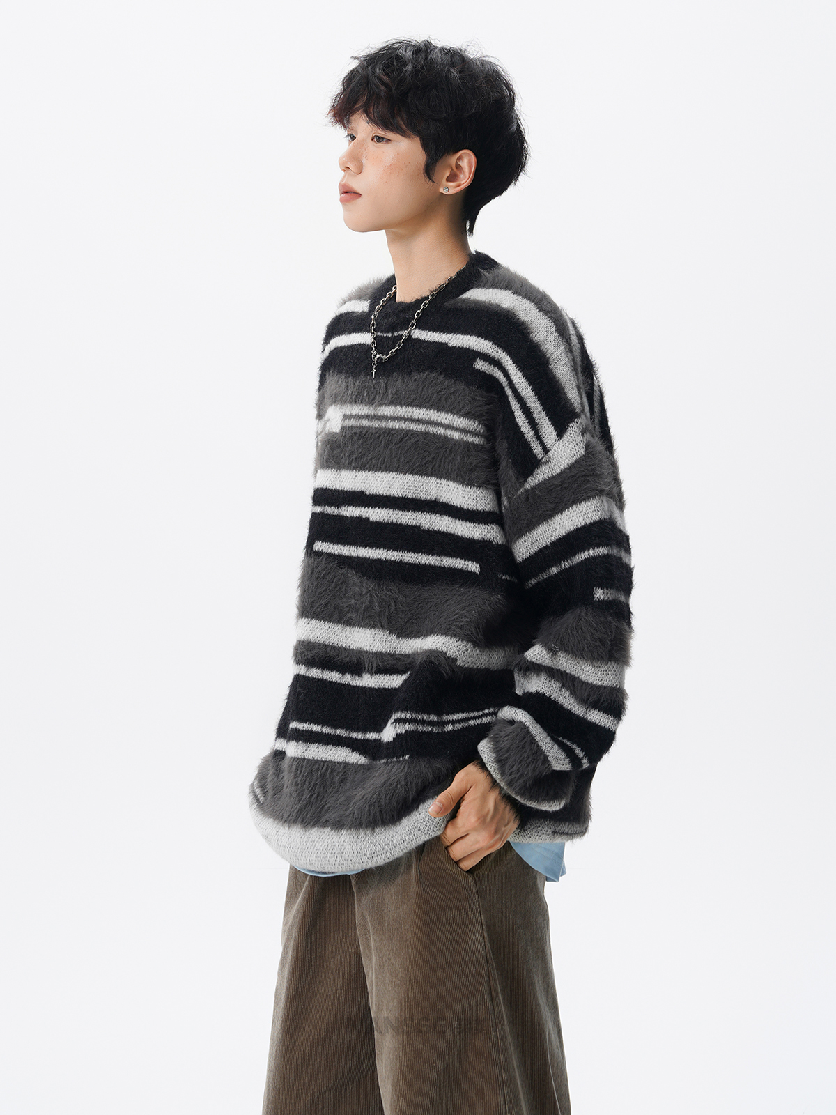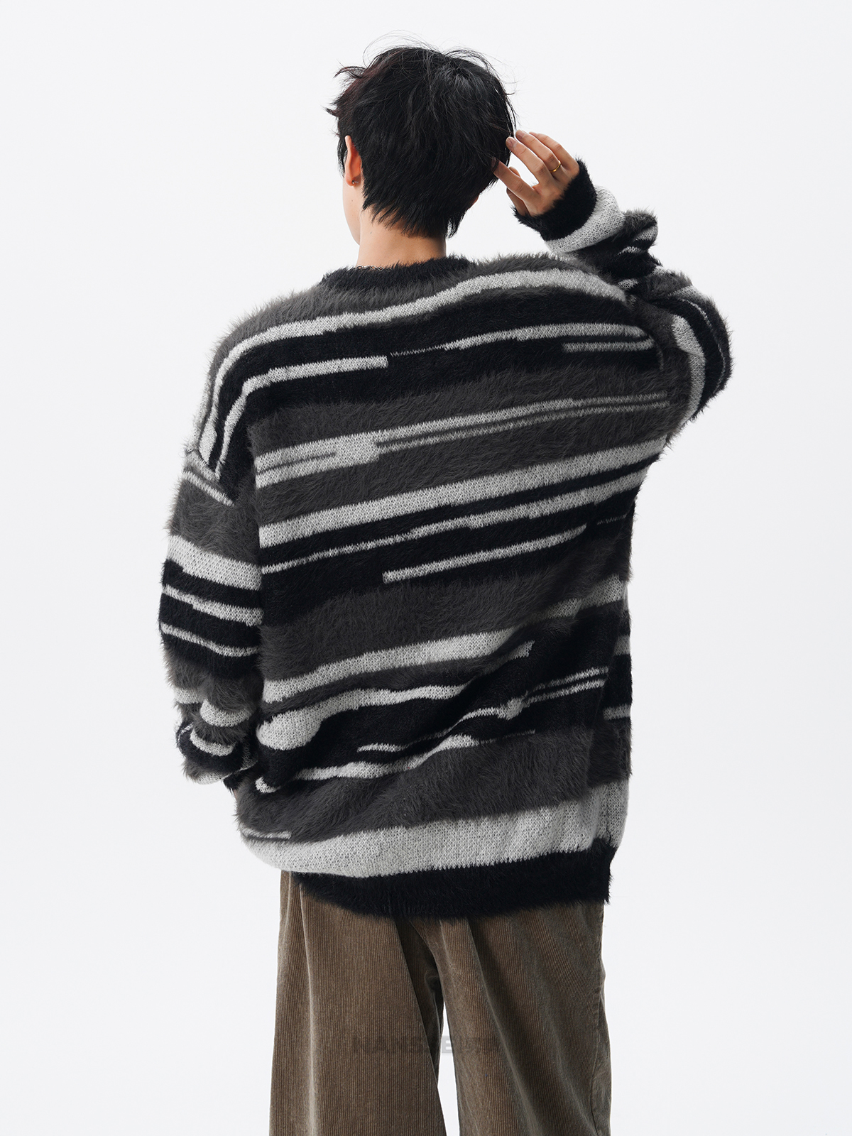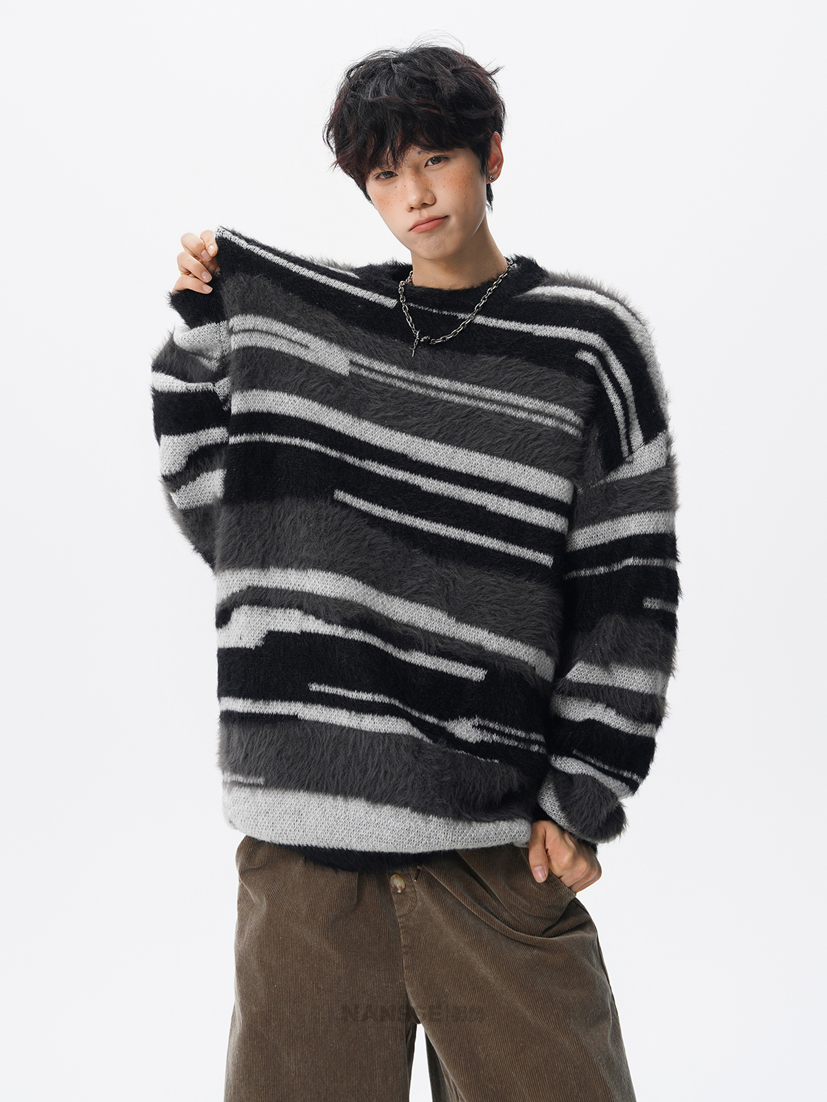 美式馬海毛圓領套頭毛衣男秋冬季新款潮牌寬松慵懶漸變撞色針織衫
