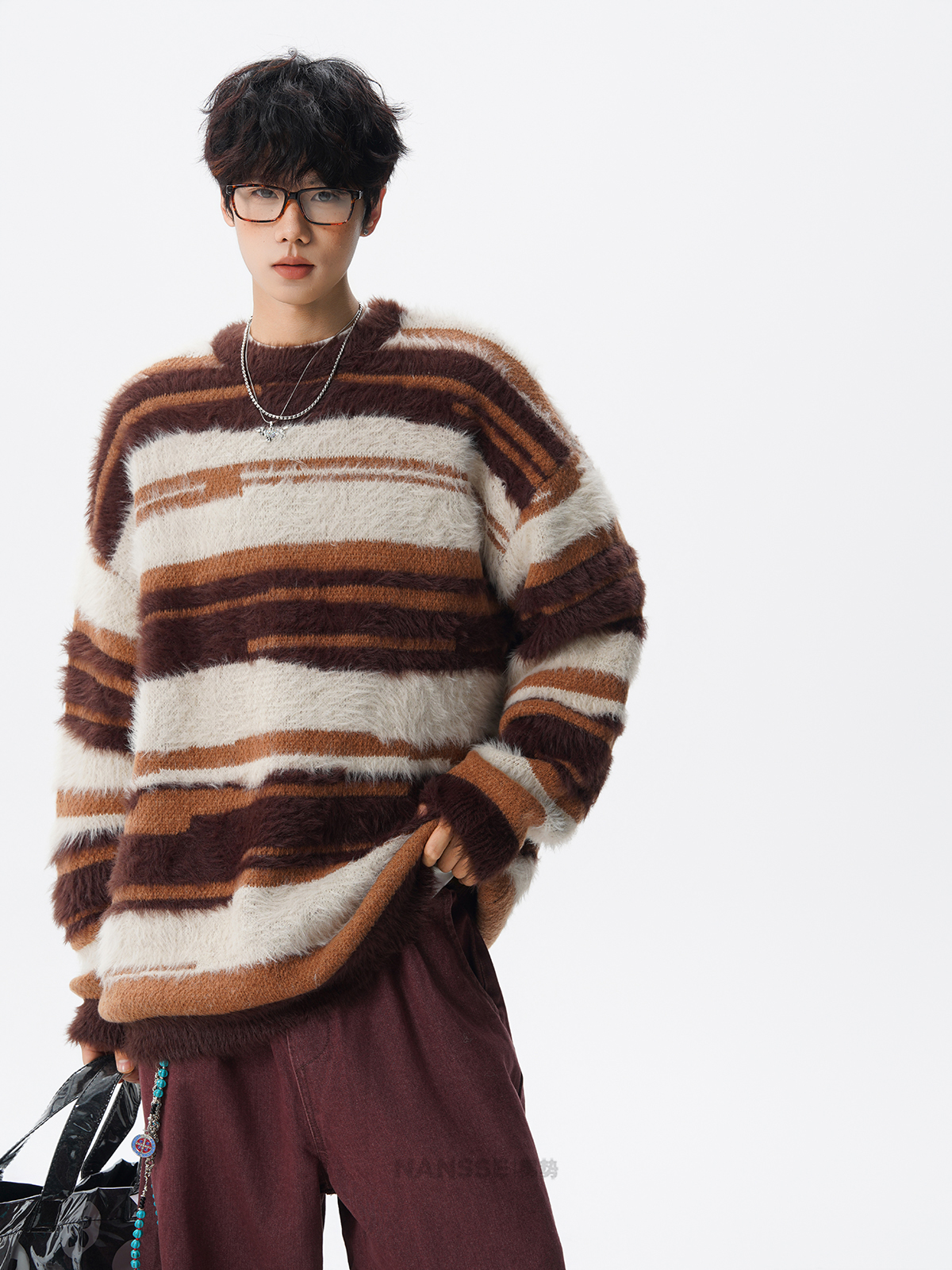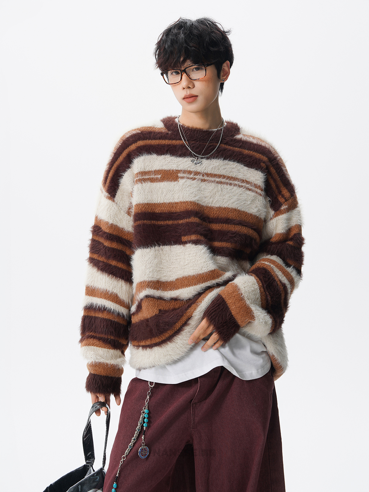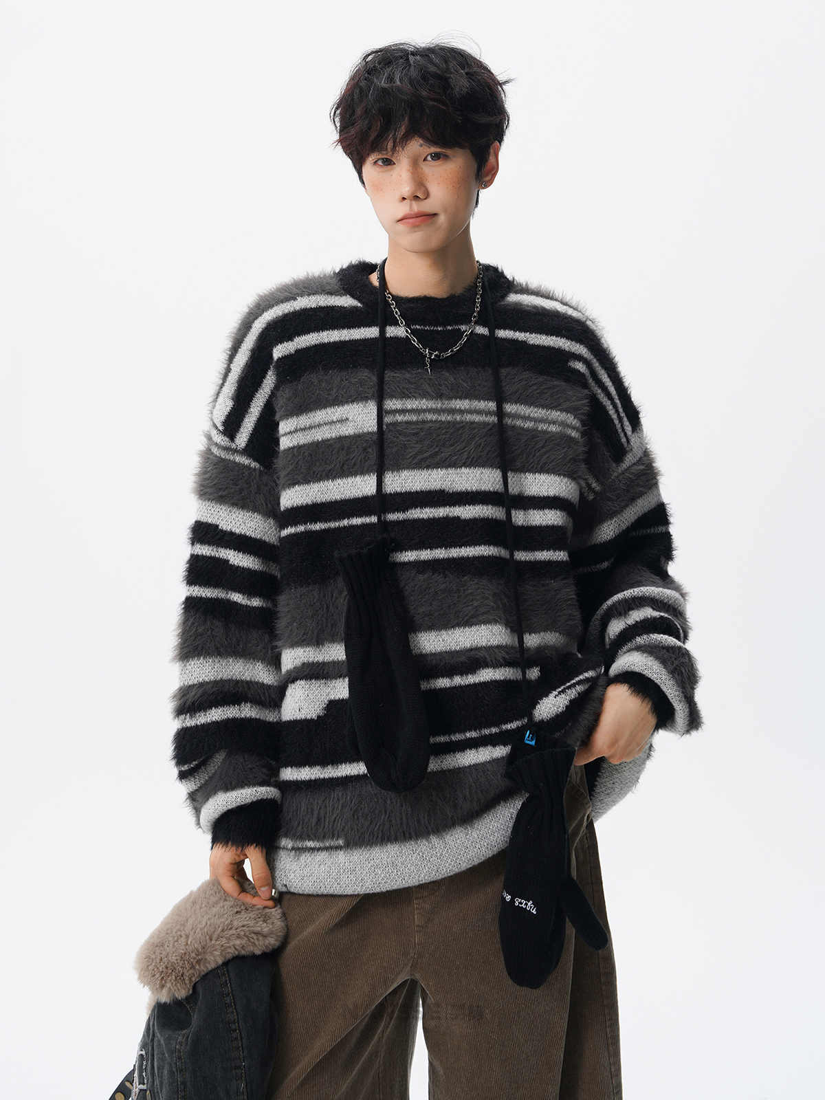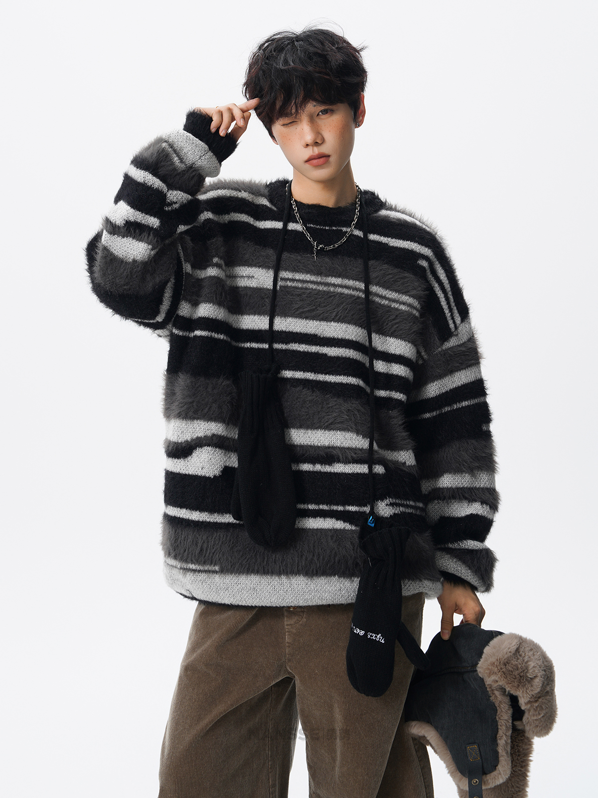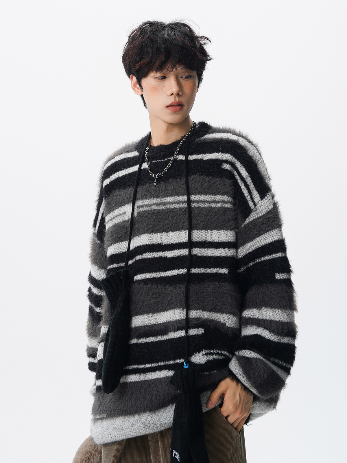 美式馬海毛圓領套頭毛衣男秋冬季新款潮牌寬松慵懶漸變撞色針織衫