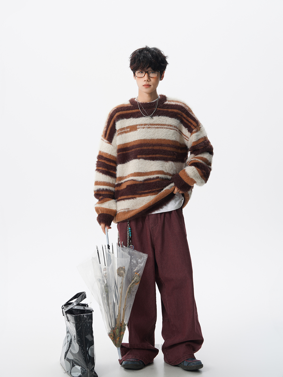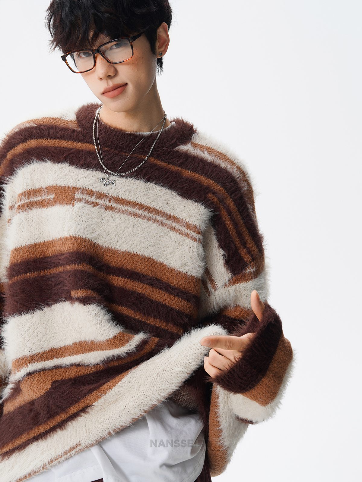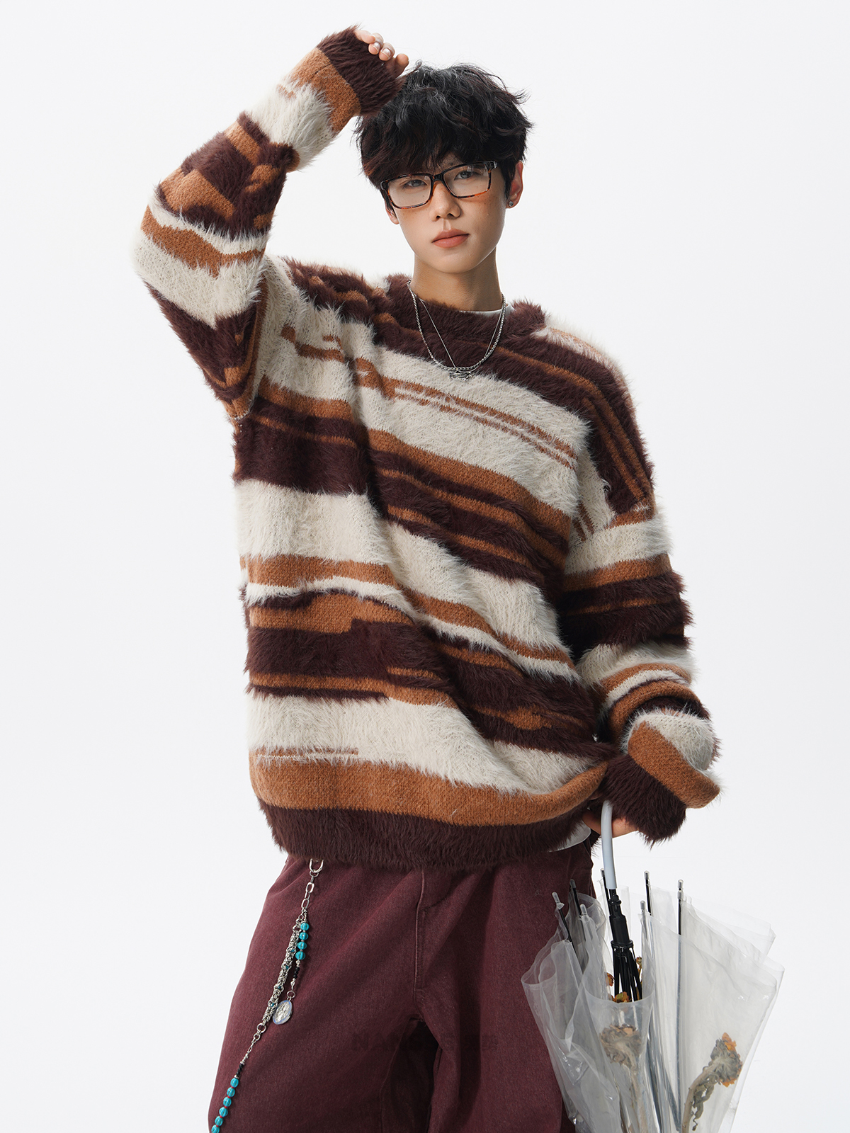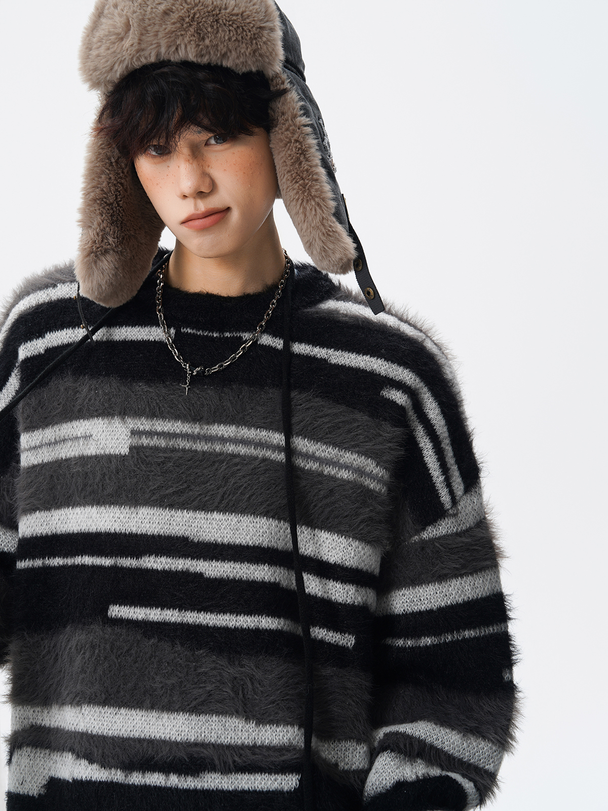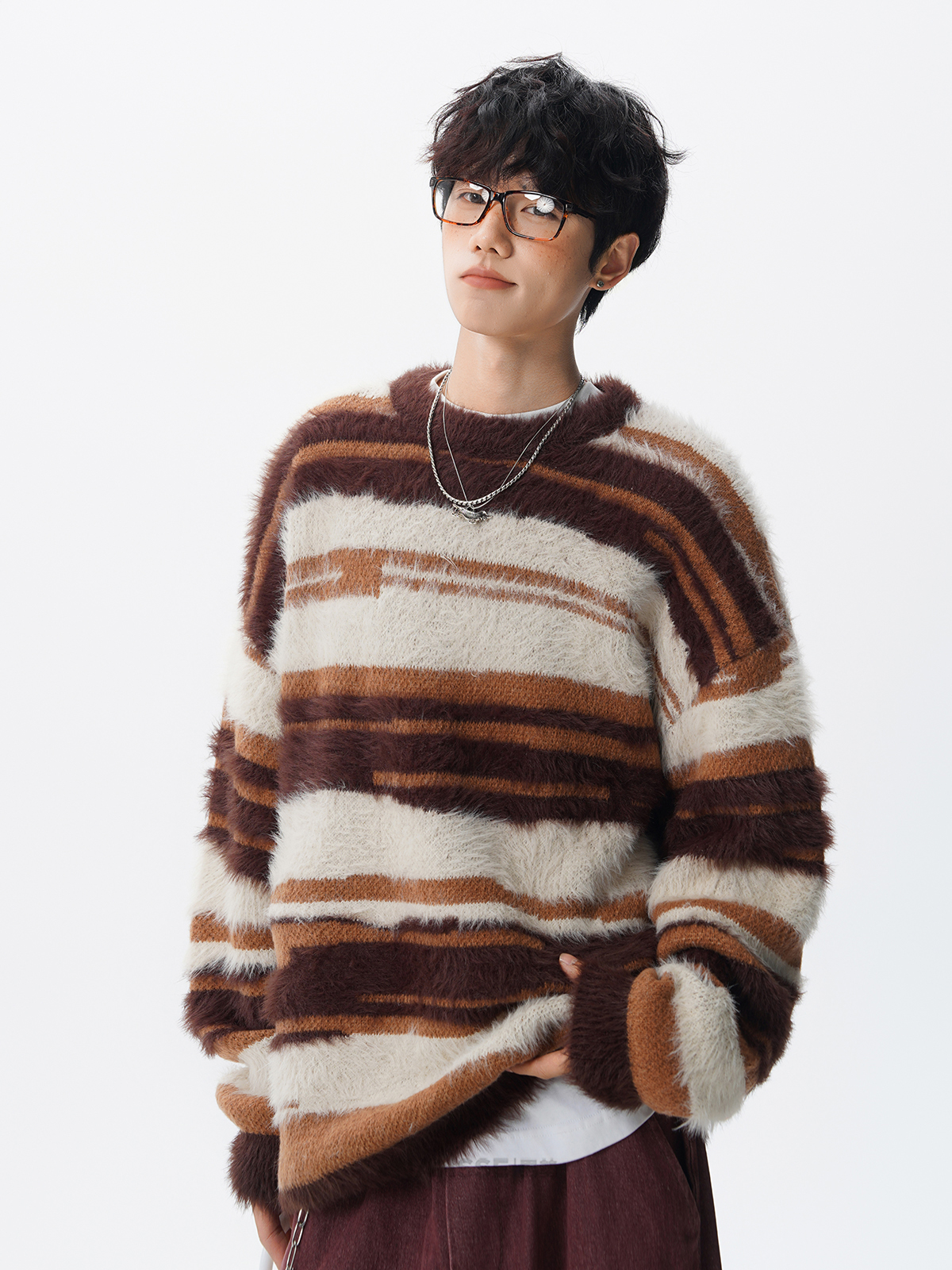 美式馬海毛圓領套頭毛衣男秋冬季新款潮牌寬松慵懶漸變撞色針織衫