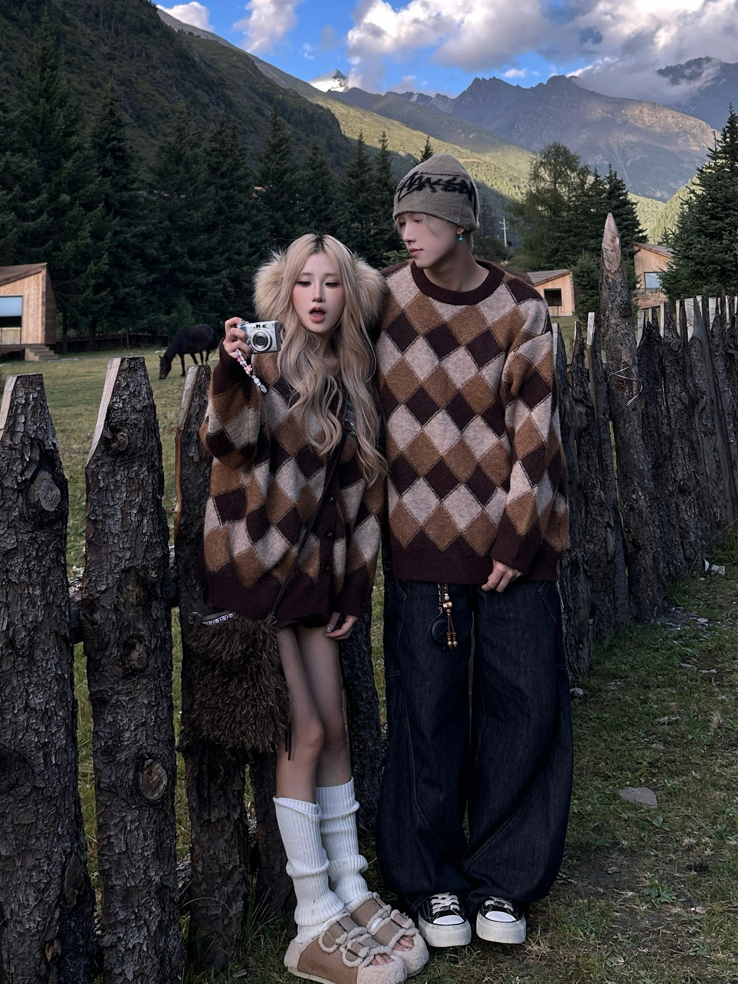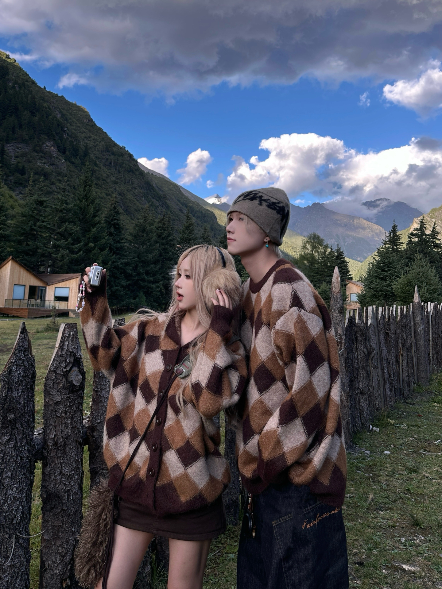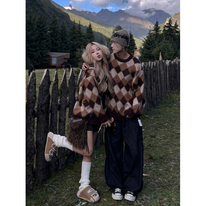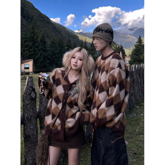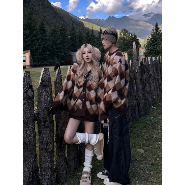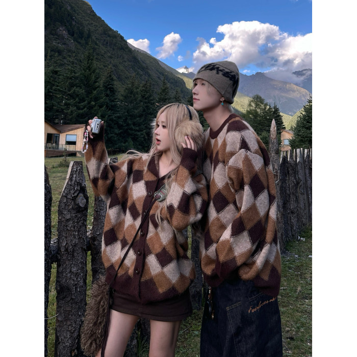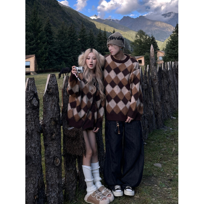 美式復古菱格撞色毛衣男女情侶裝秋冬季2025寬松慵懶風針織衫外套