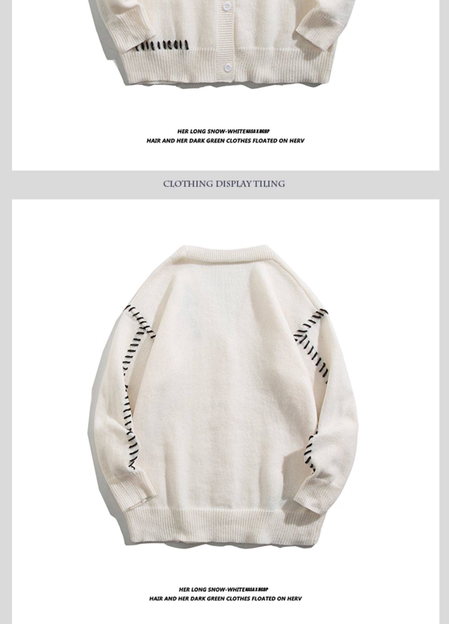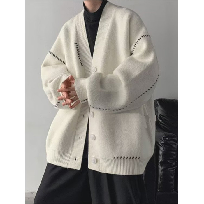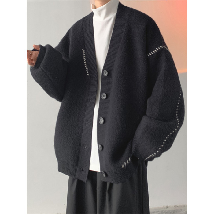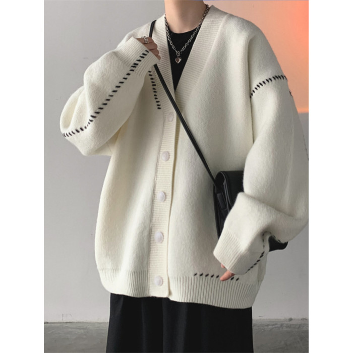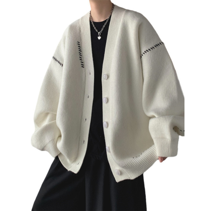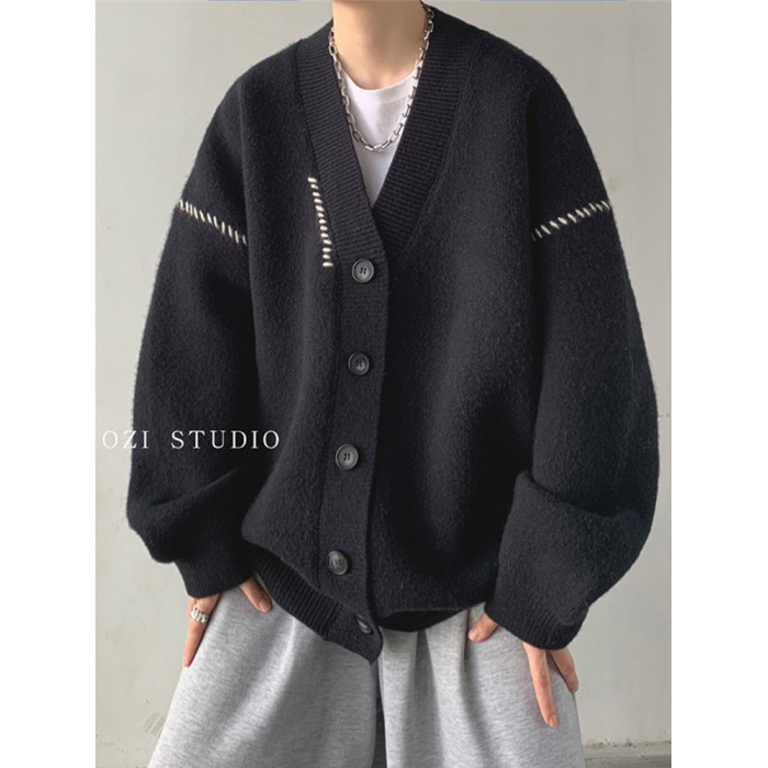 日韓古著慵懶潮流薄款針織衫外套男女insV領簡約寬松外穿開衫毛衣