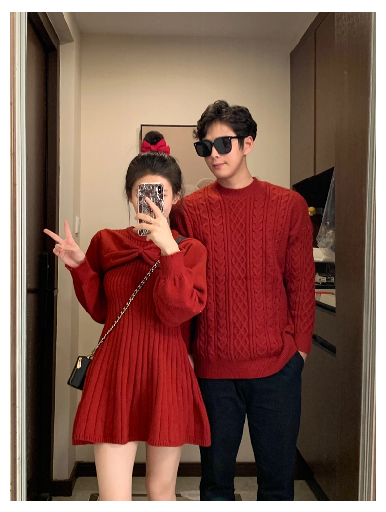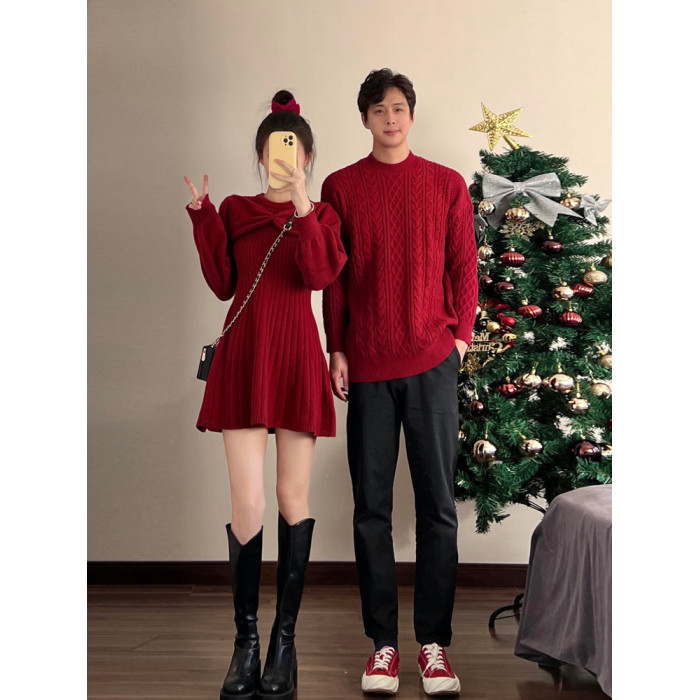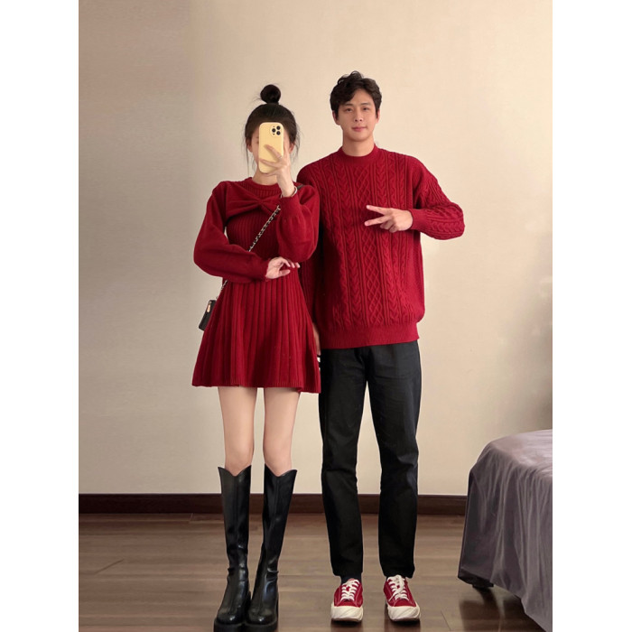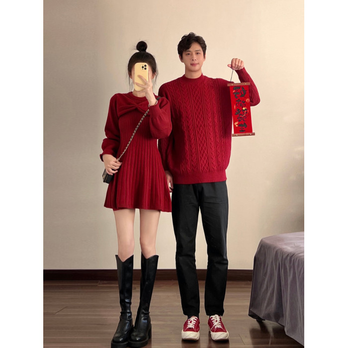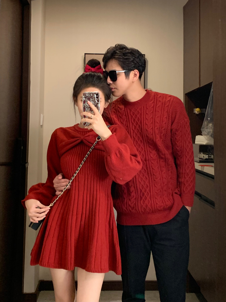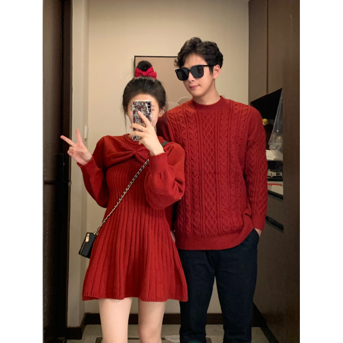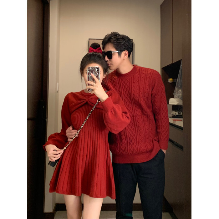 新年情侶裝毛衣高級感紅色訂婚服蝴蝶結收腰針織衫連衣裙一裙一衣