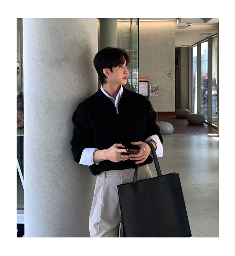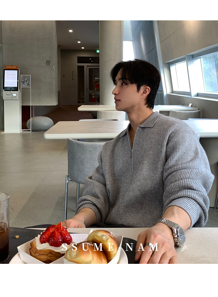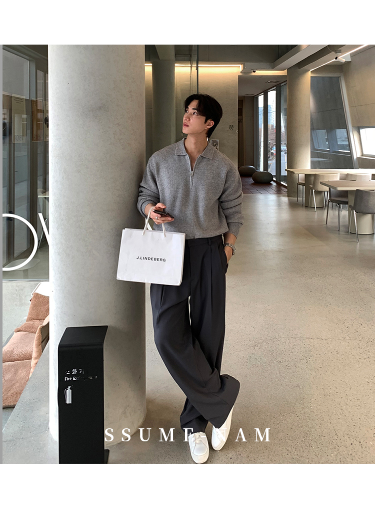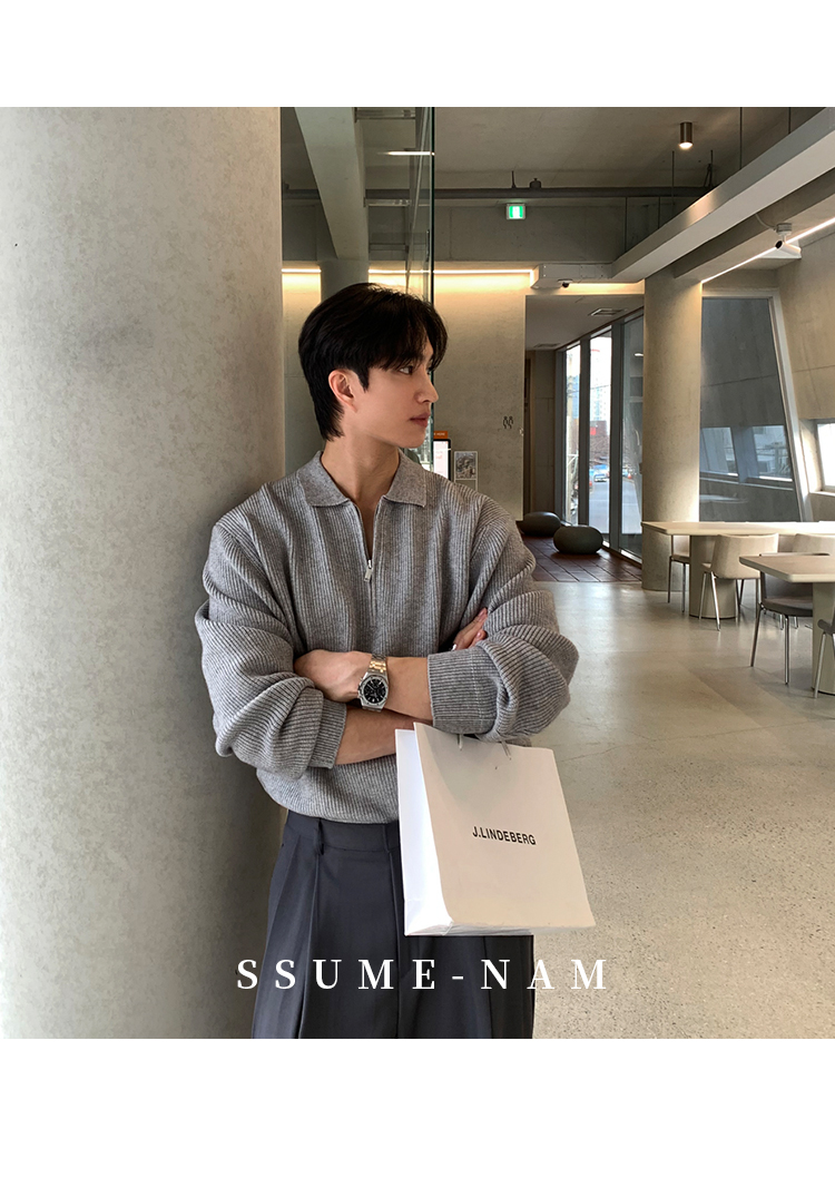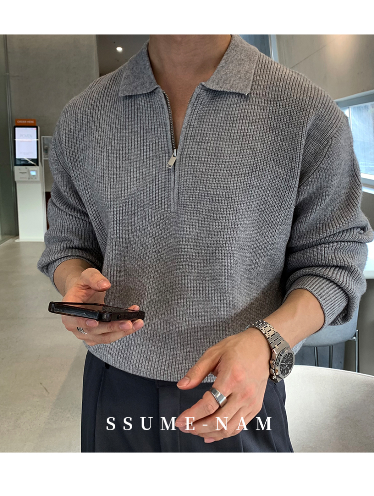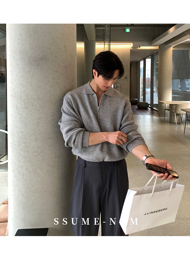 SSUMENAM「老錢風 半拉鍊」灰色POLO衫毛衣男秋季高級翻領針織衫