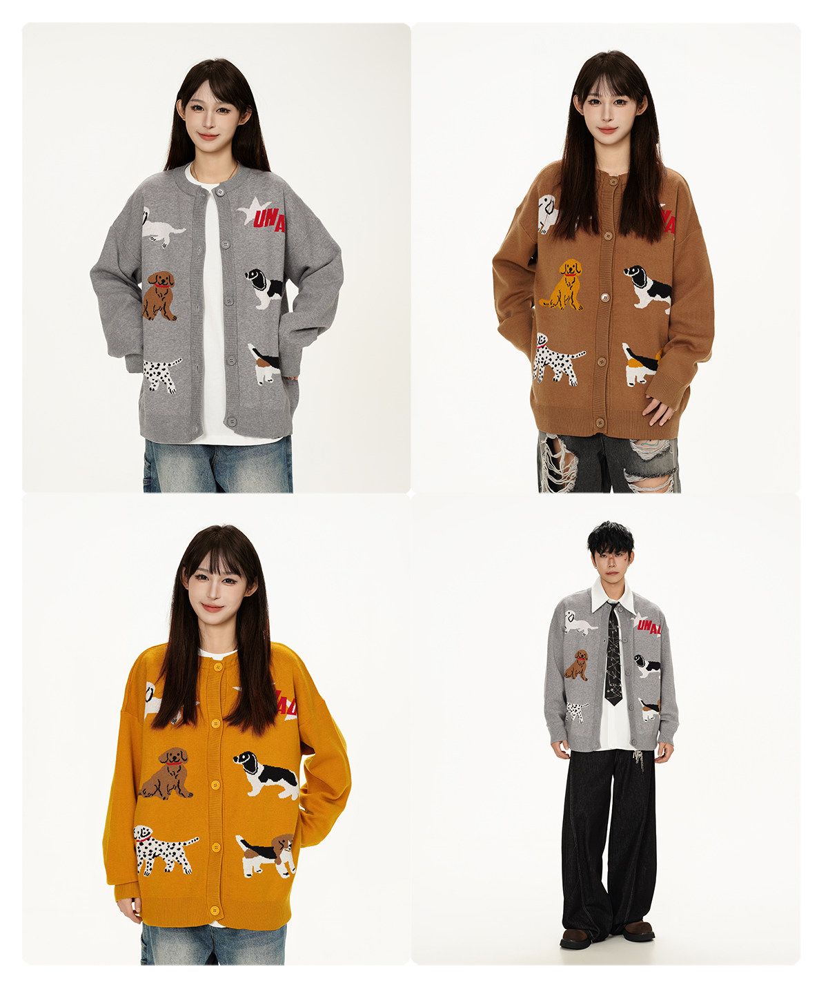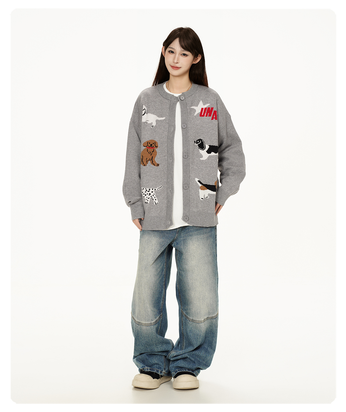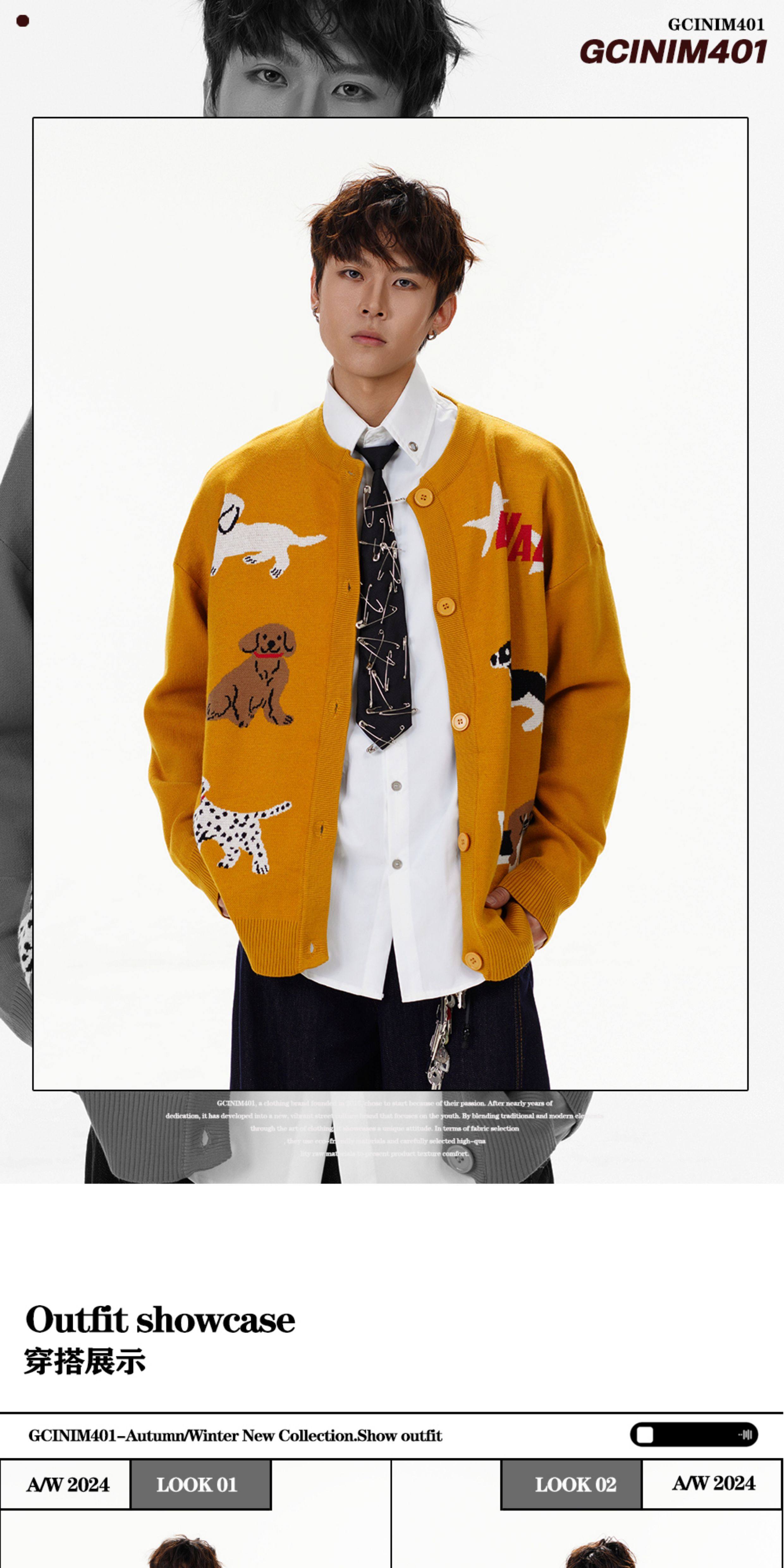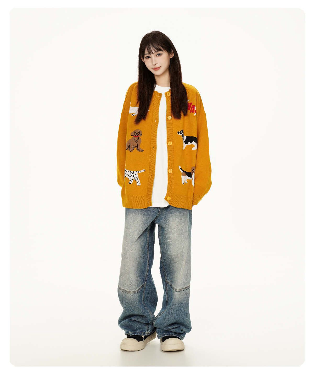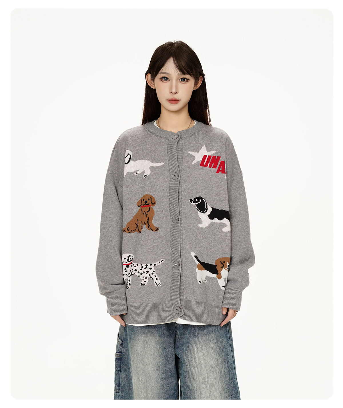 GCINIM401秋季新款慵懶風毛衣美式復古趣味卡通小狗刺綉針織開衫