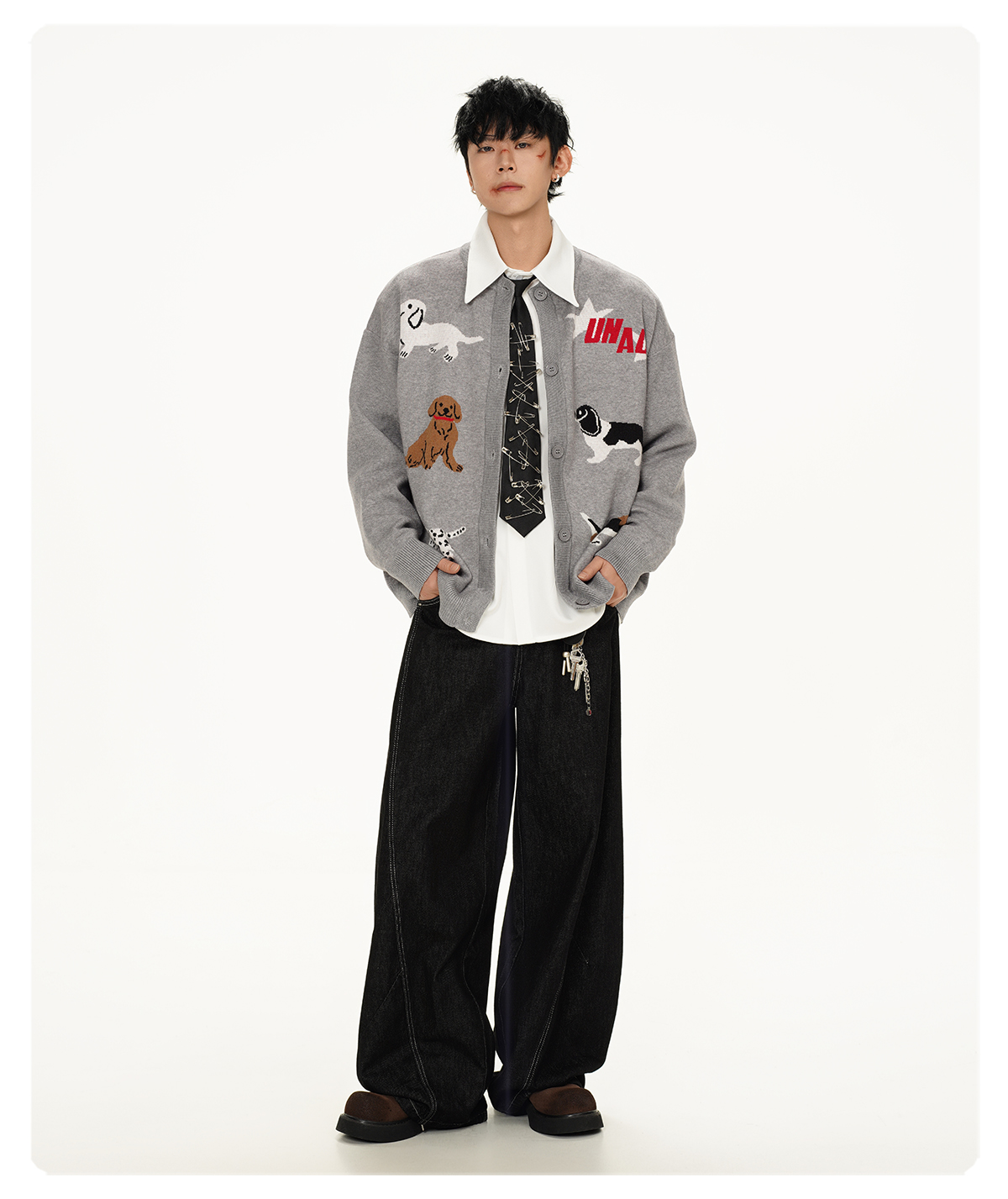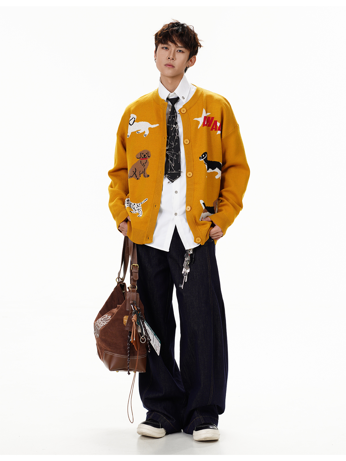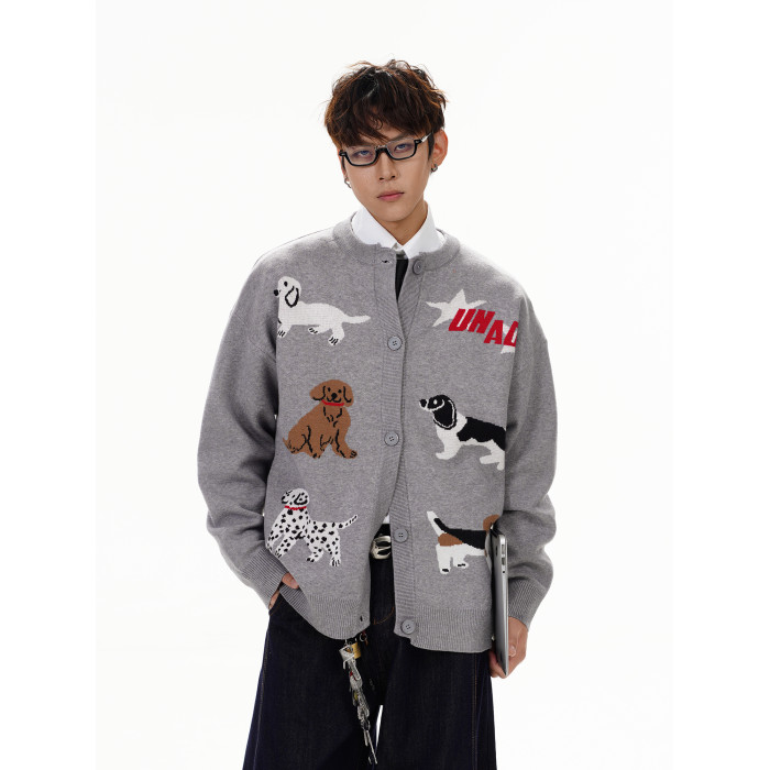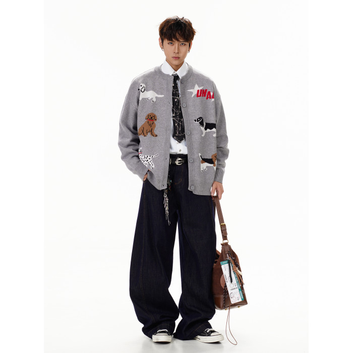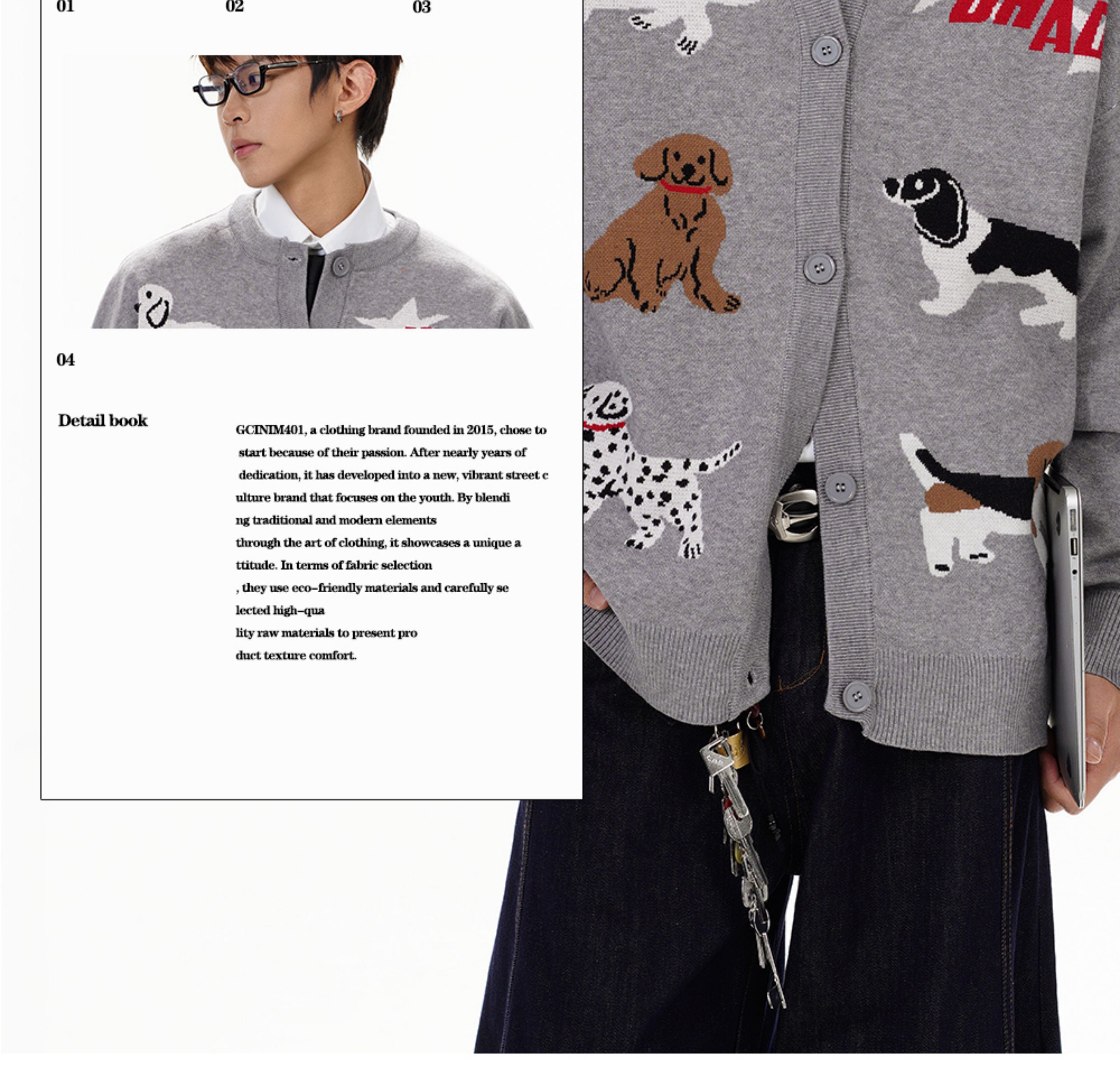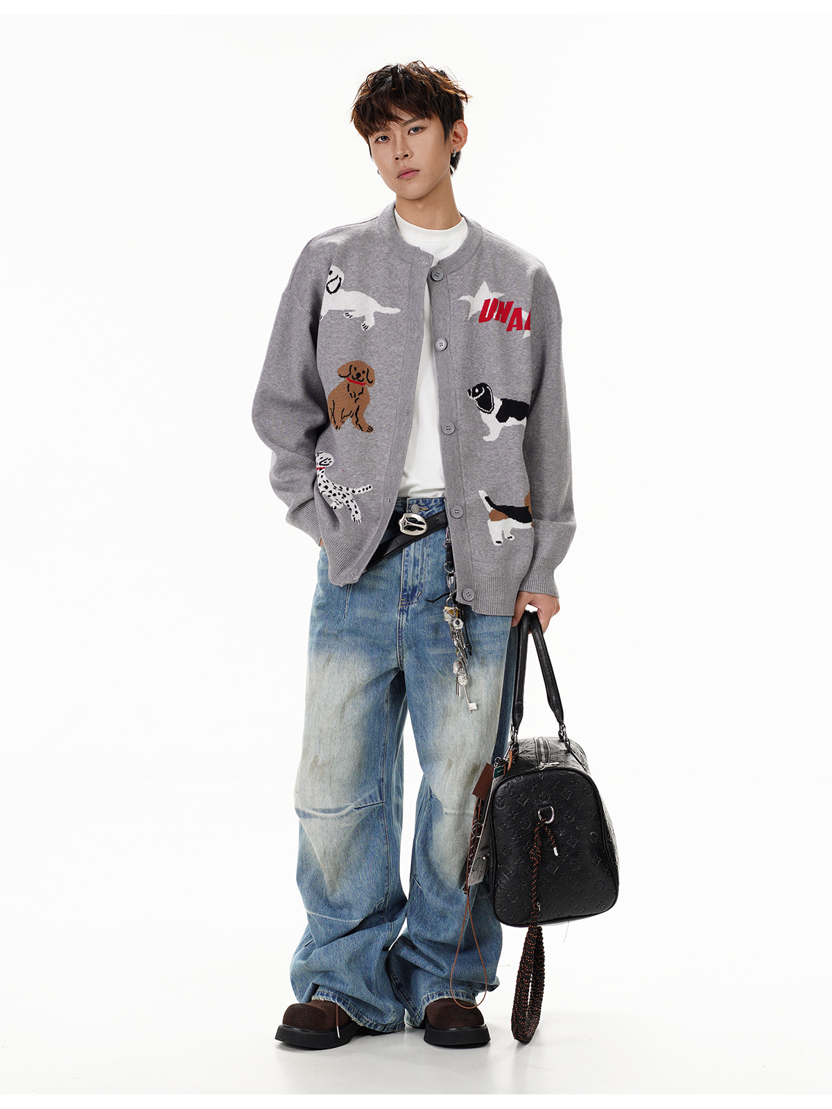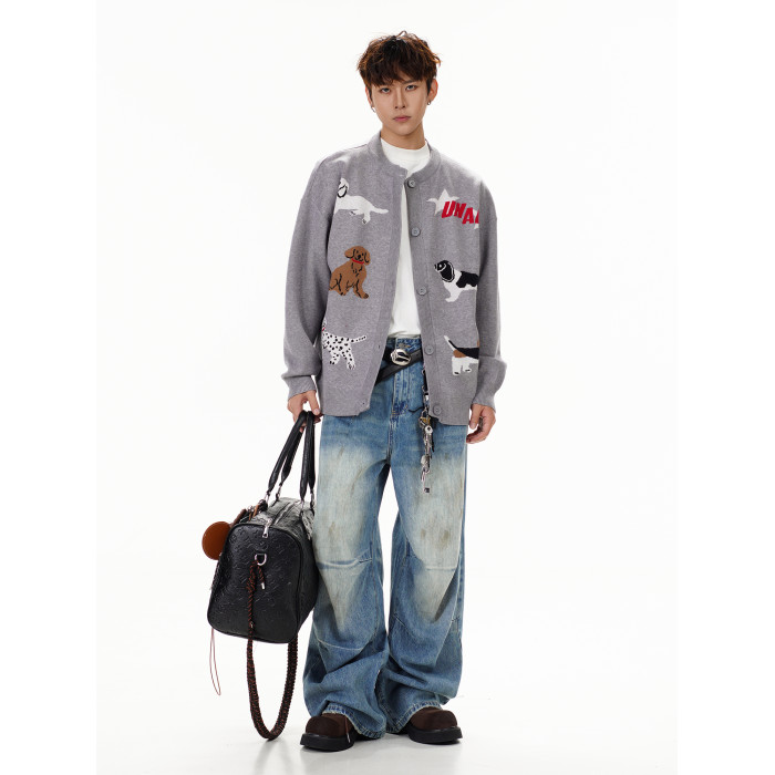 GCINIM401秋季新款慵懶風毛衣美式復古趣味卡通小狗刺綉針織開衫