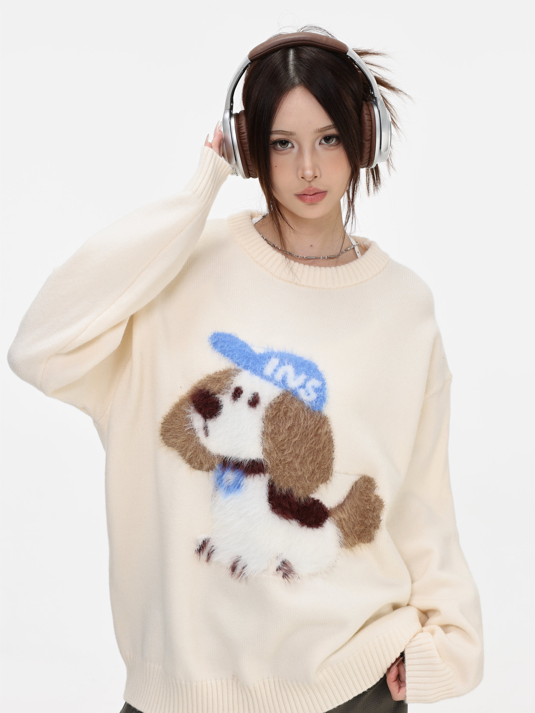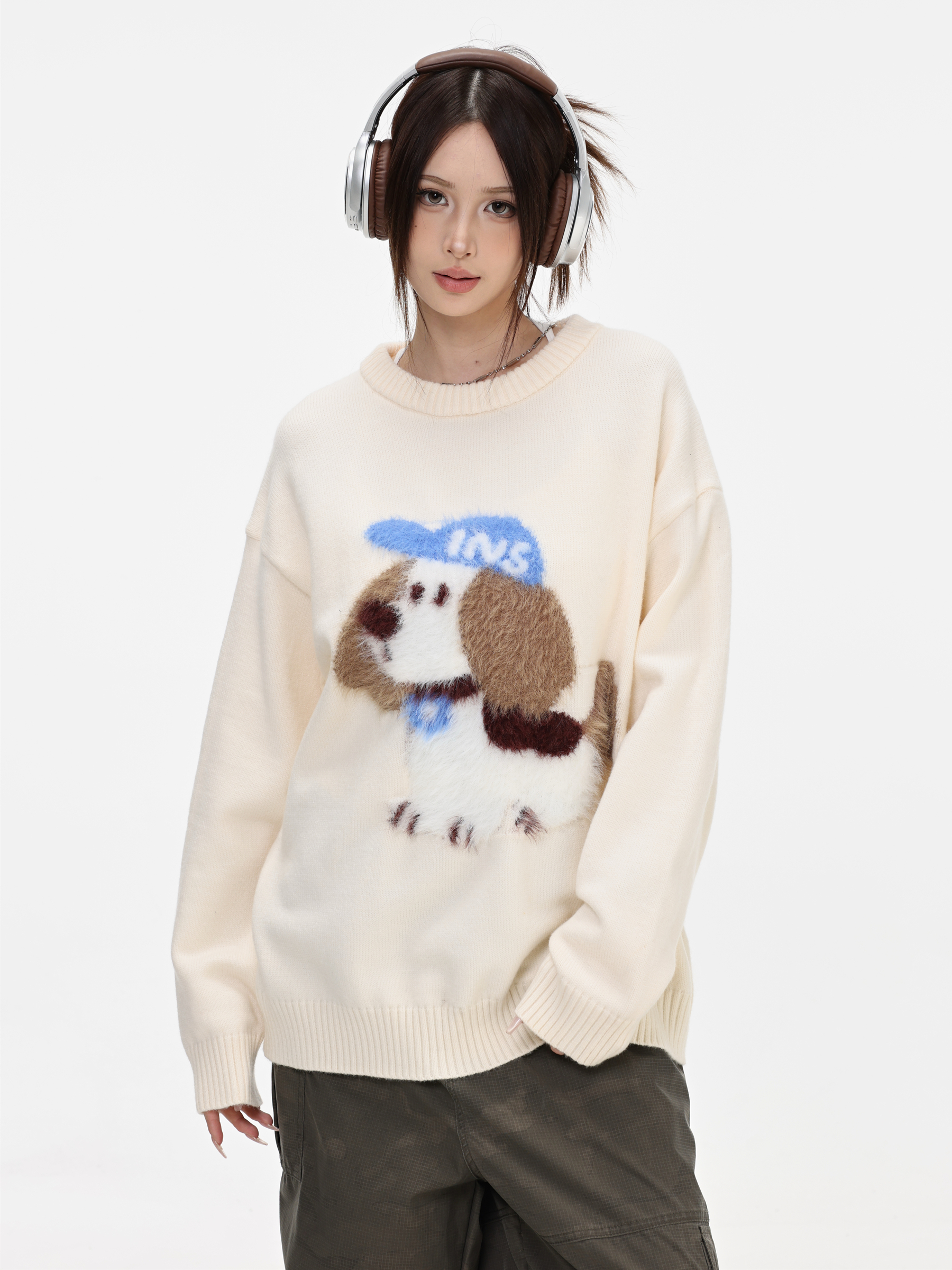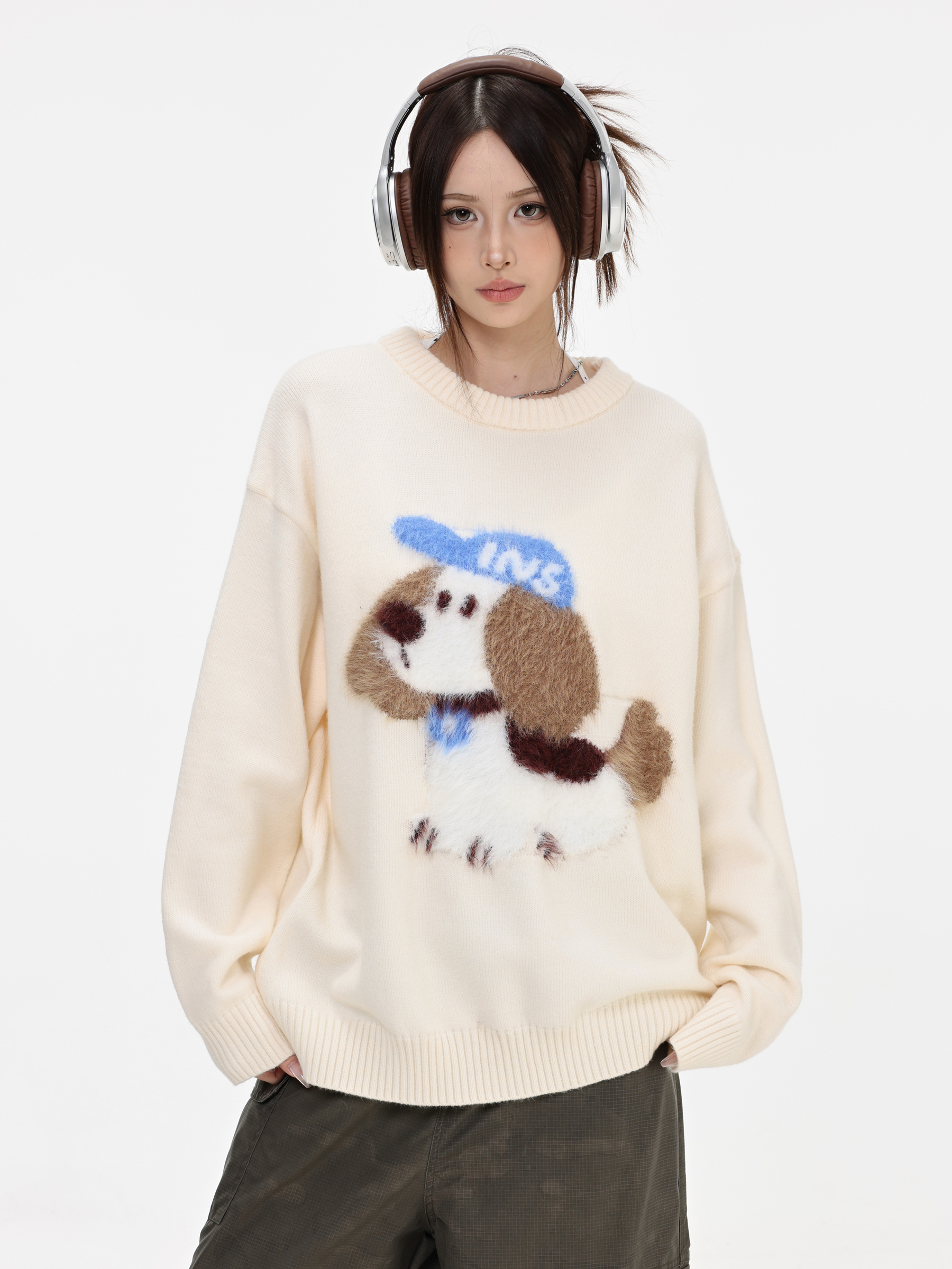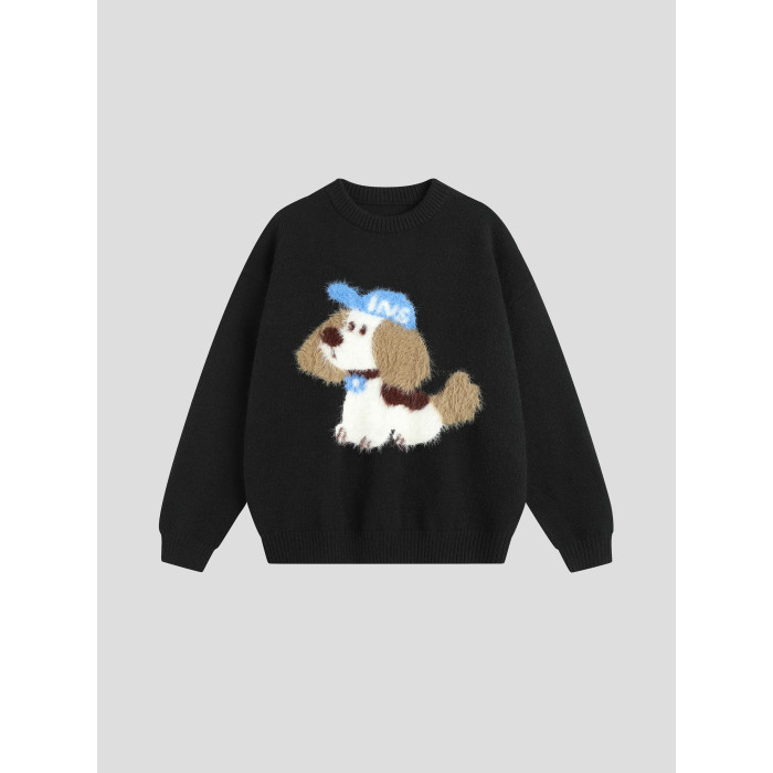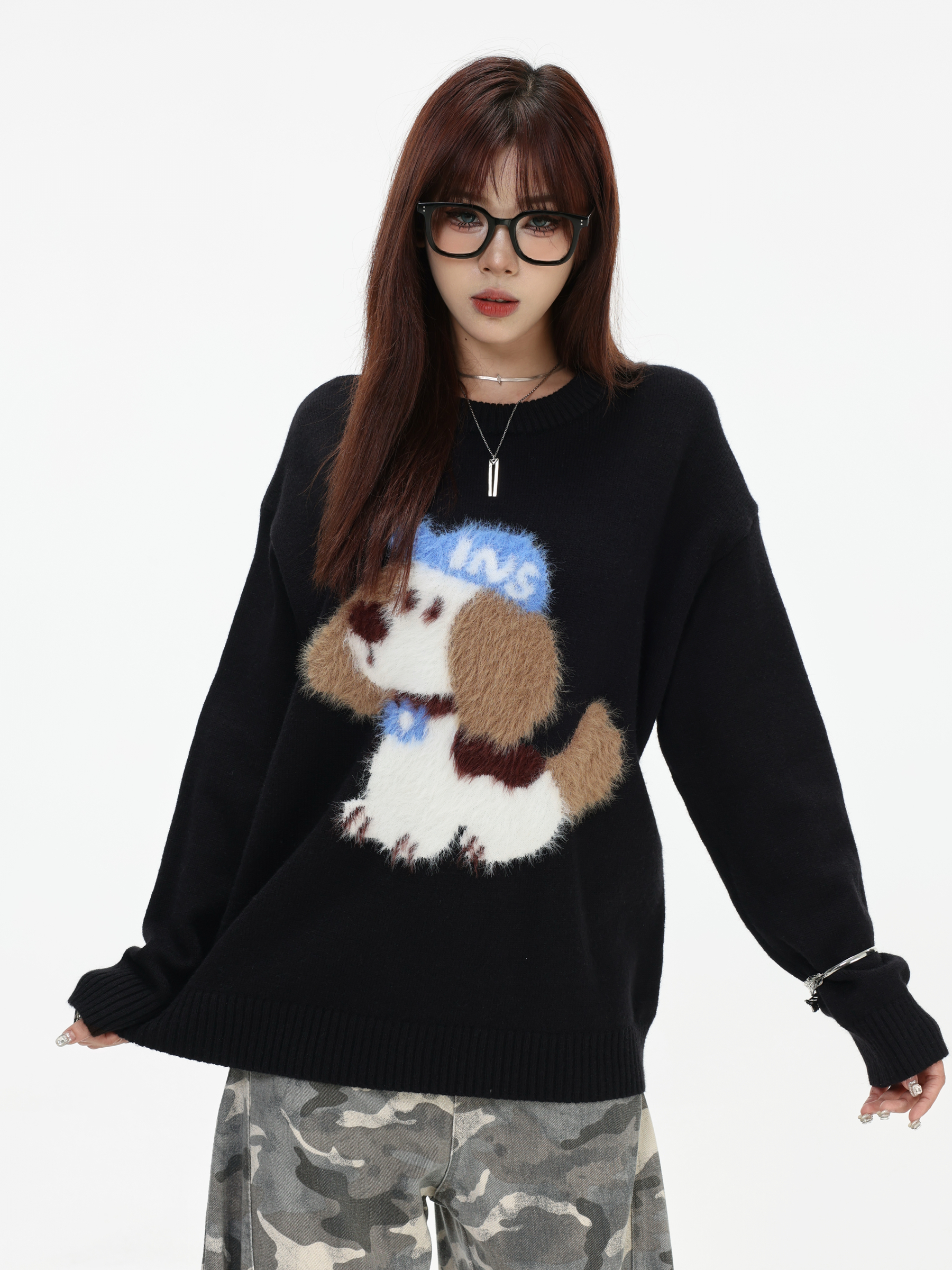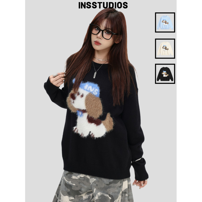 INSstudios 國潮牌情侶美式「毛絨小狗提花毛衣」休閒套頭針織衫