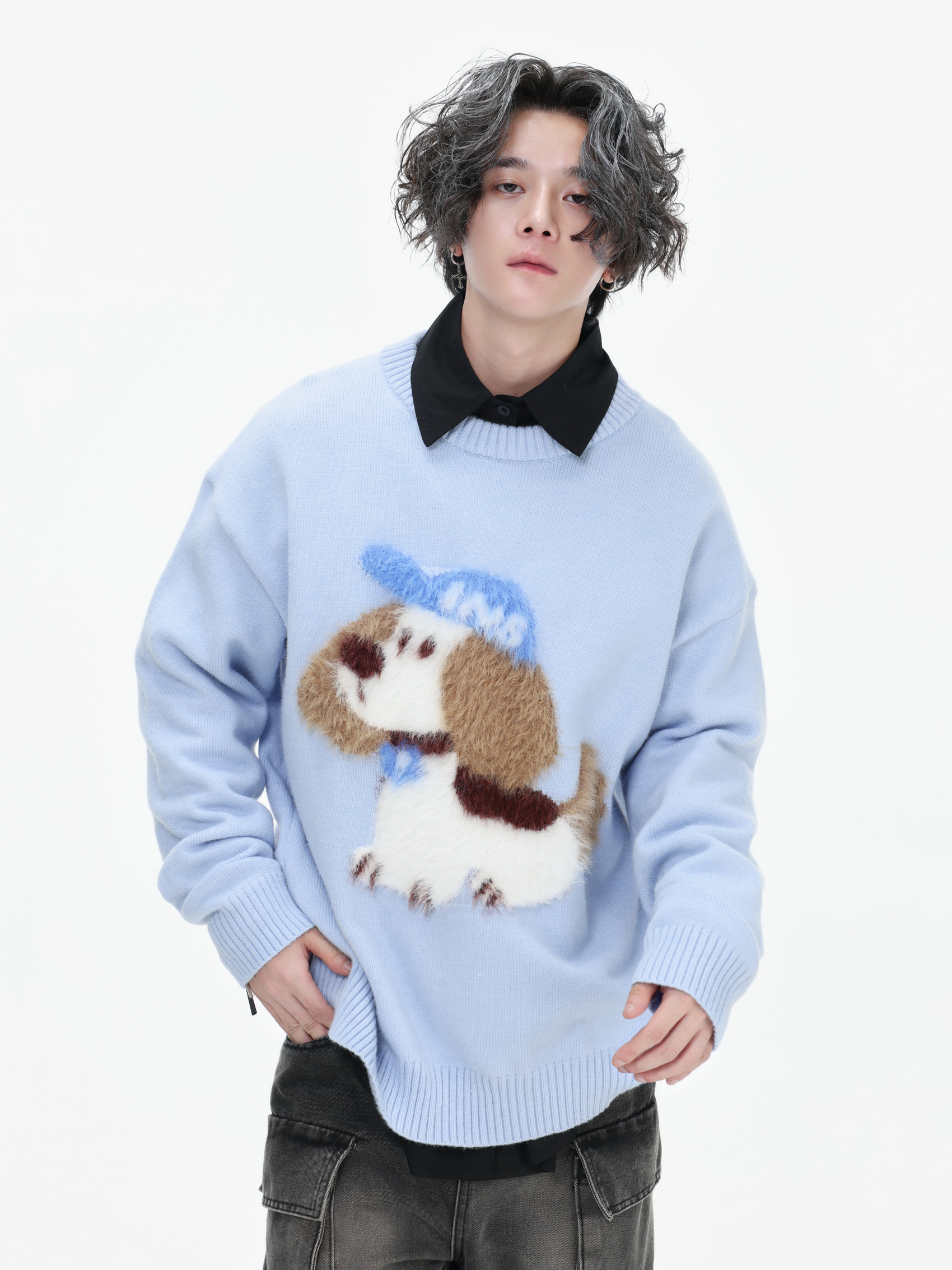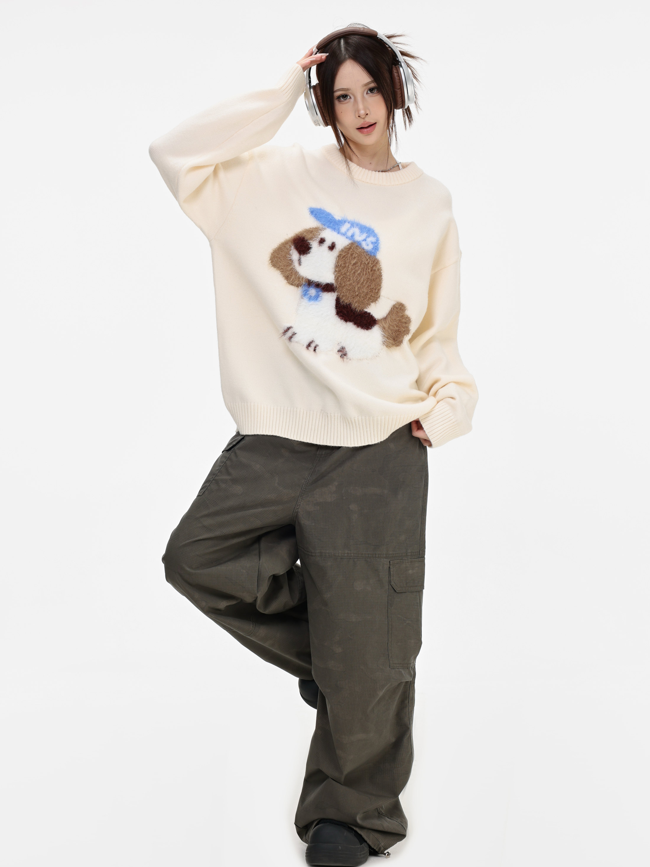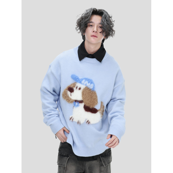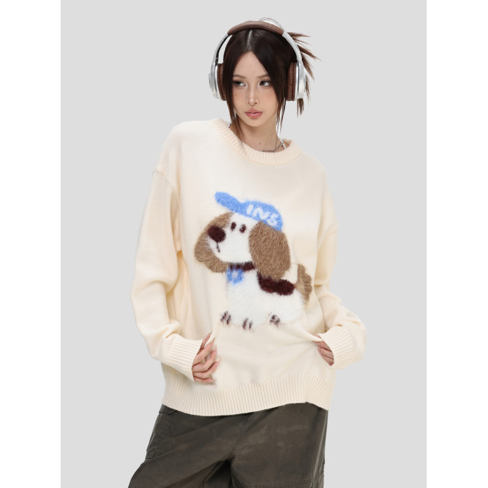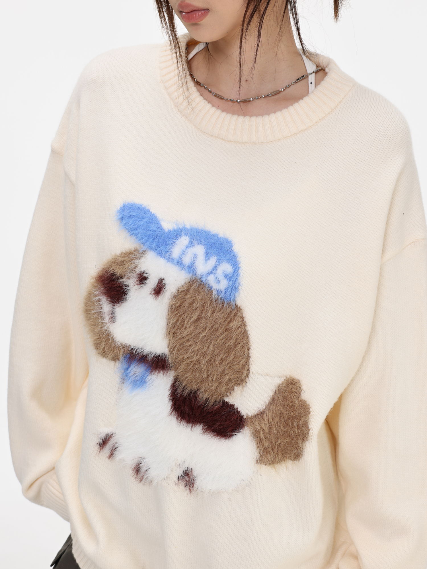 INSstudios 國潮牌情侶美式「毛絨小狗提花毛衣」休閒套頭針織衫