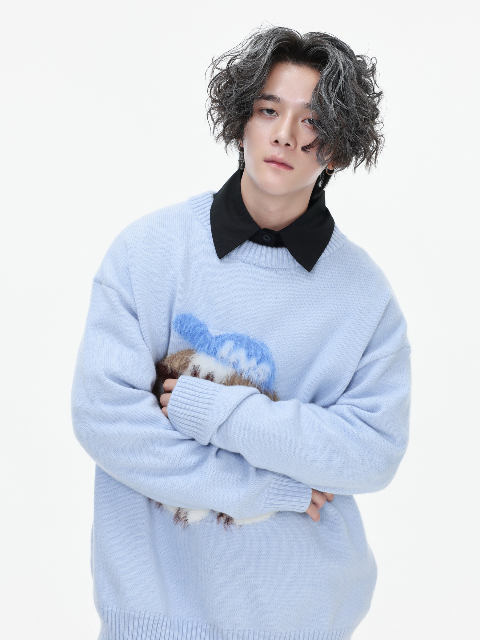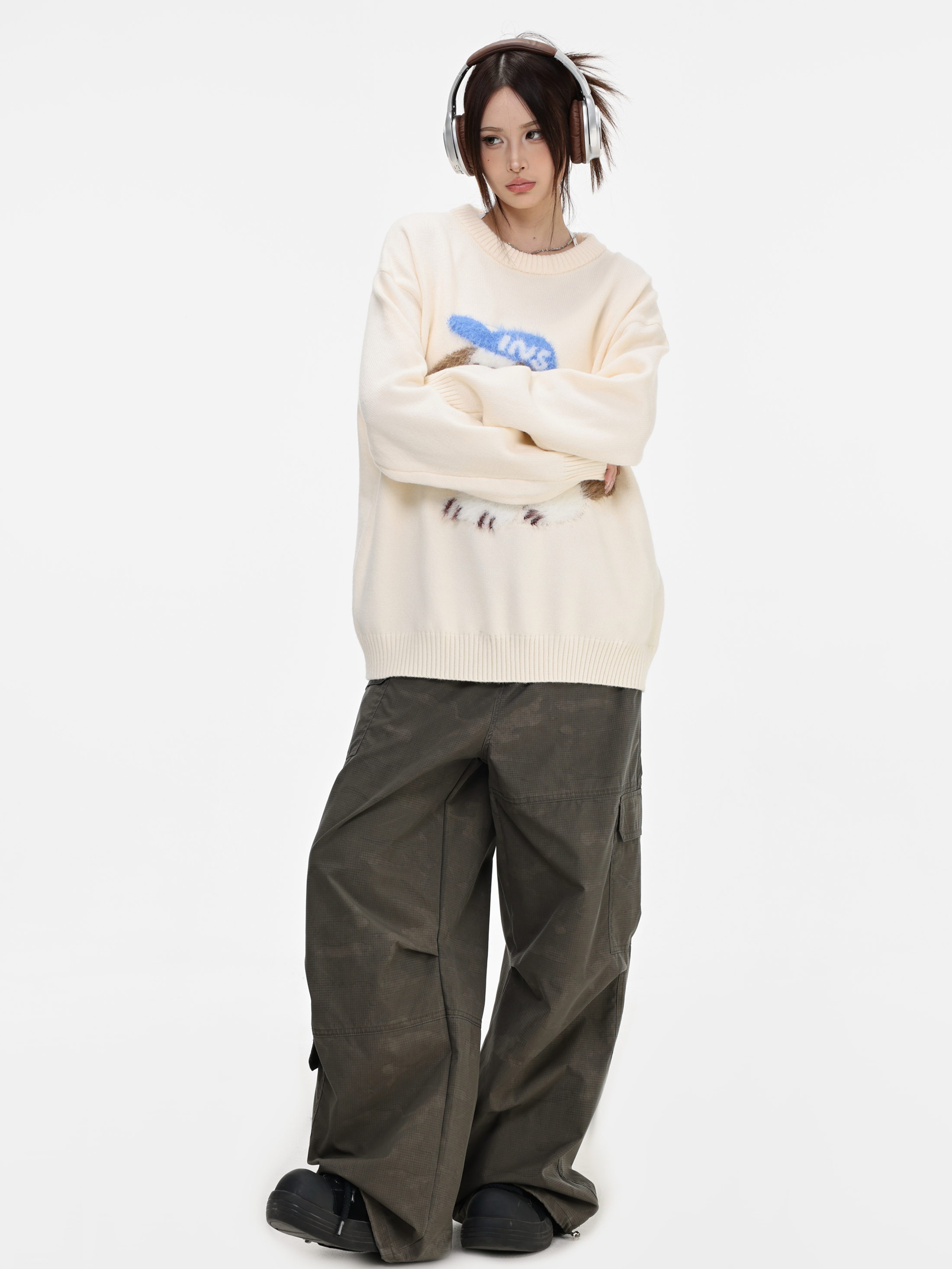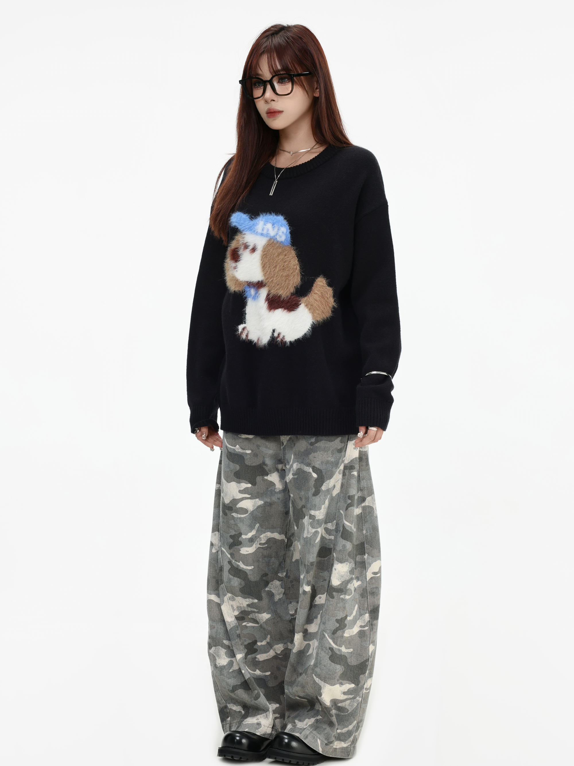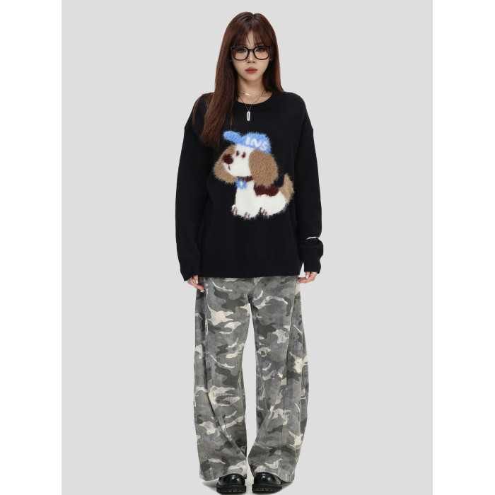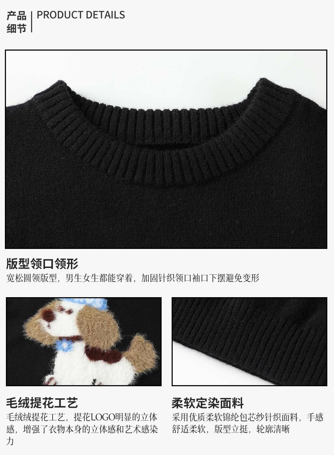 INSstudios 國潮牌情侶美式「毛絨小狗提花毛衣」休閒套頭針織衫
