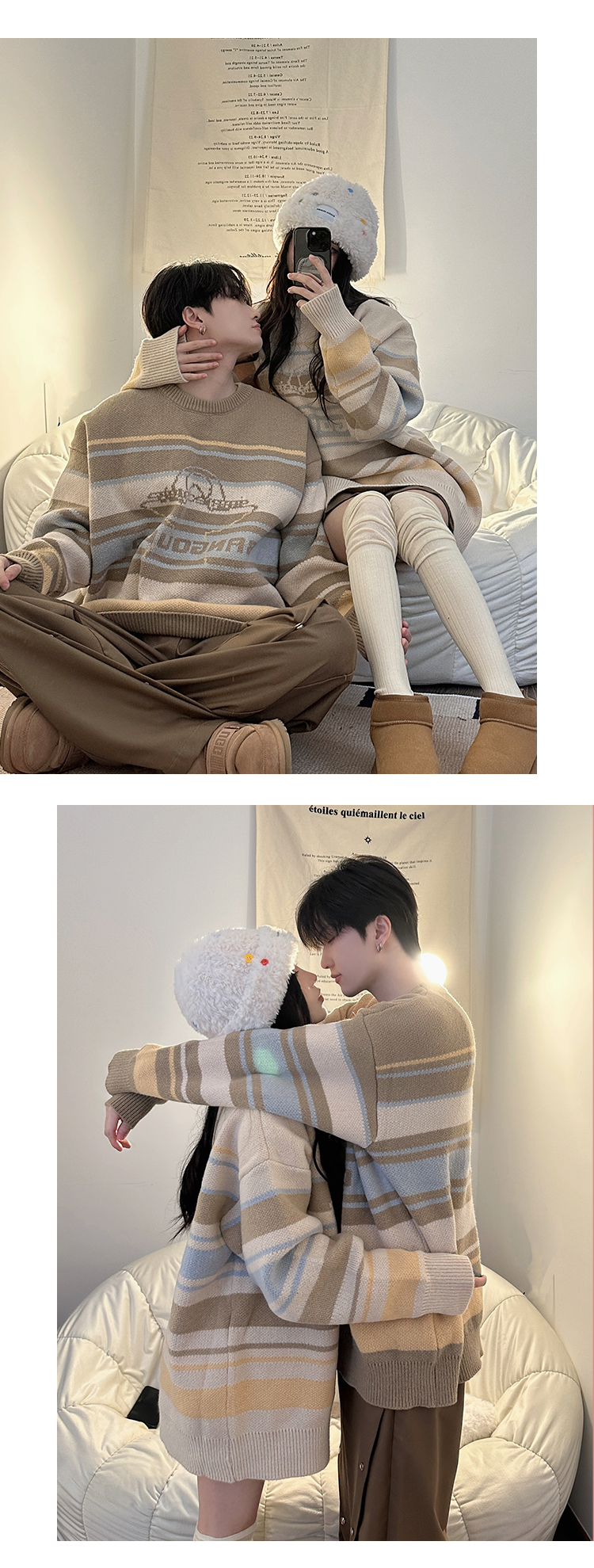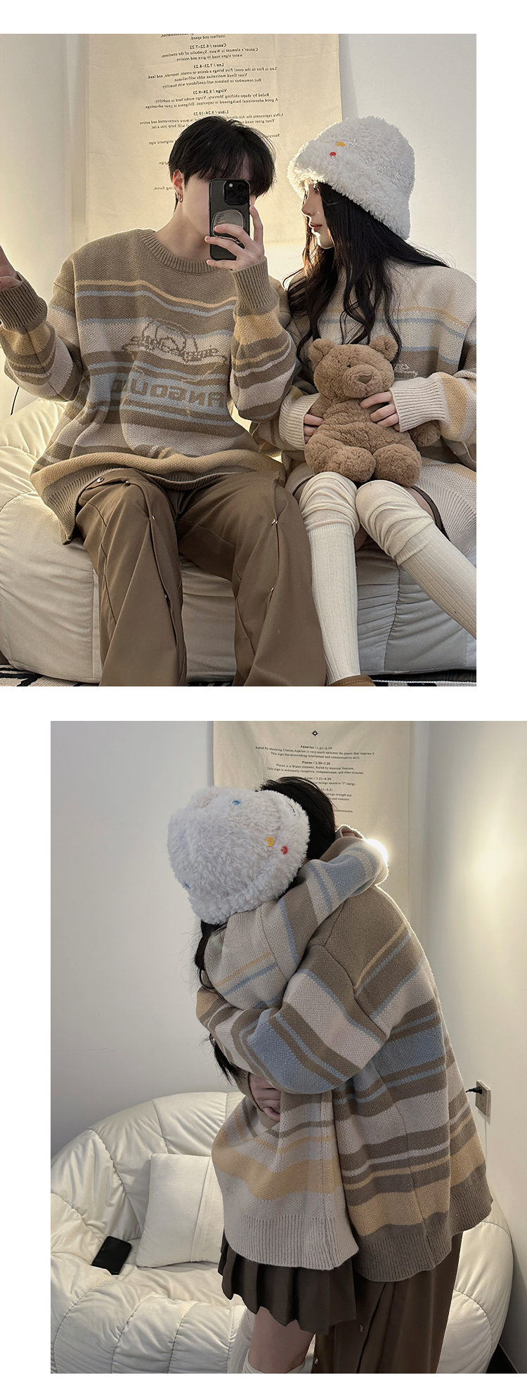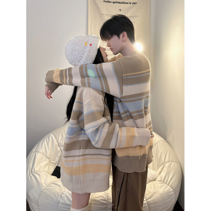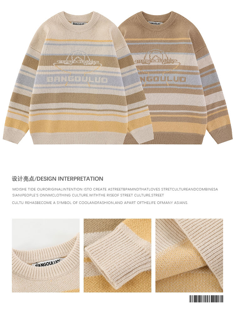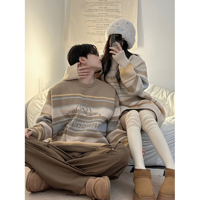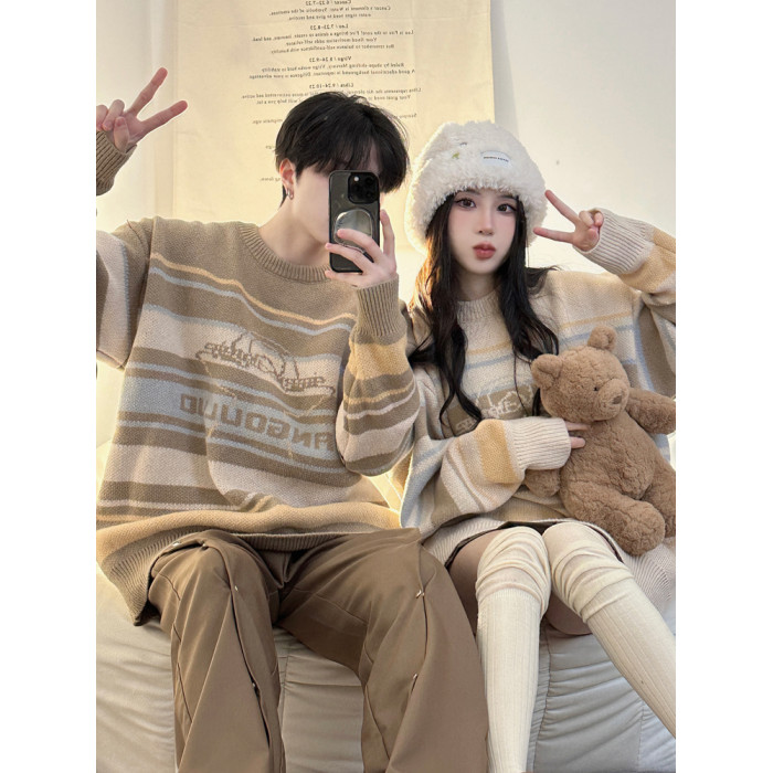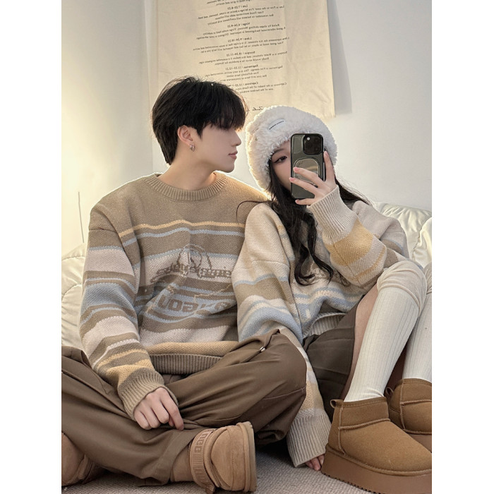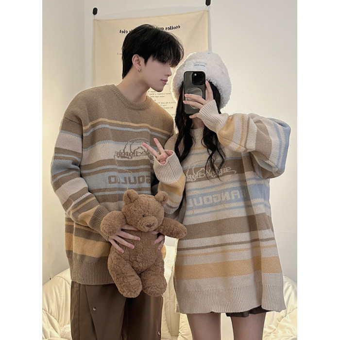港風復古潮牌條紋毛衣男秋冬寬松休閒慵懶風美式圓領針織衫情侶裝