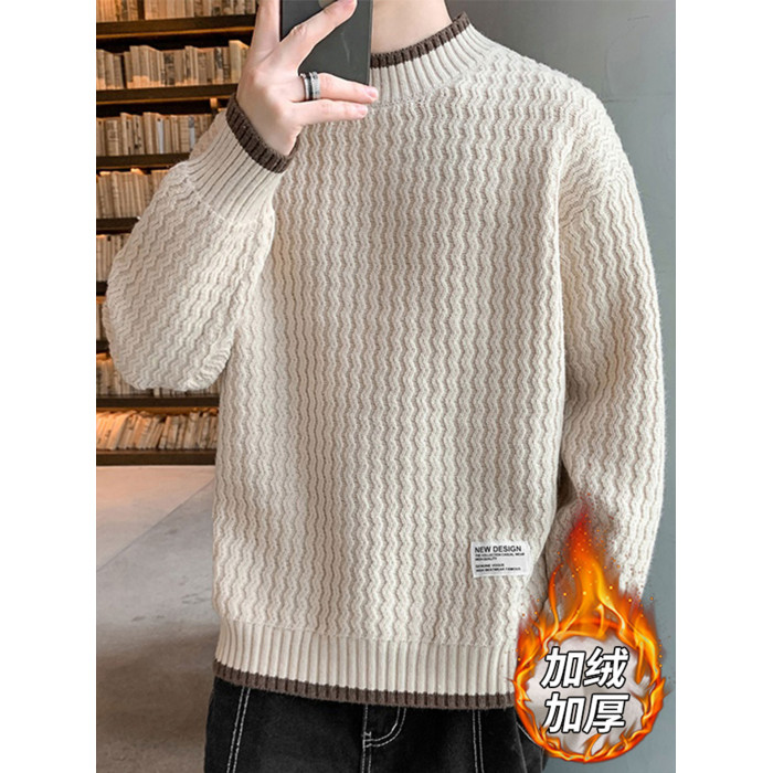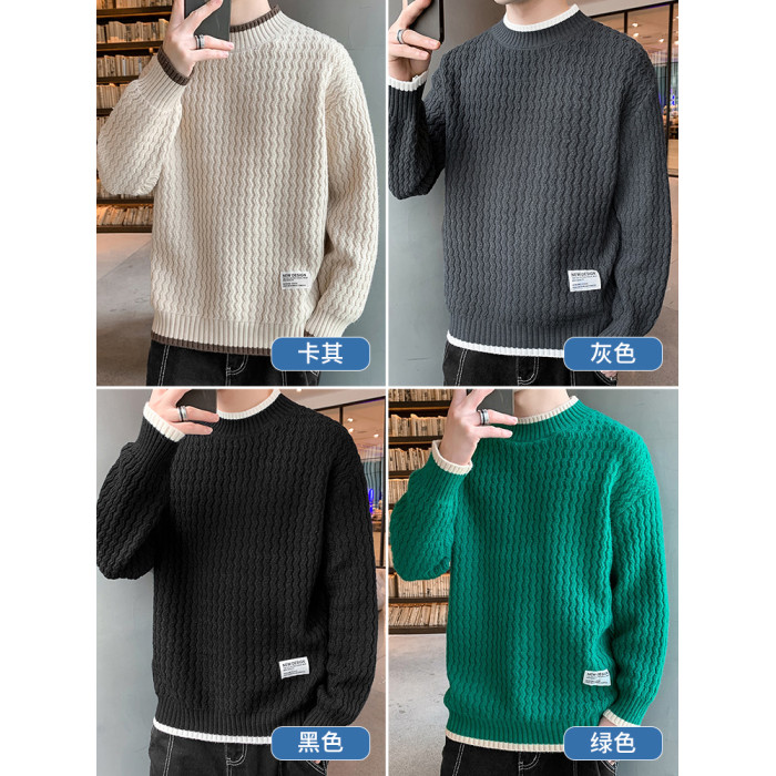 波浪紋毛衣男秋冬款潮牌內搭衣服假兩件線衣加絨加厚半高領針織衫